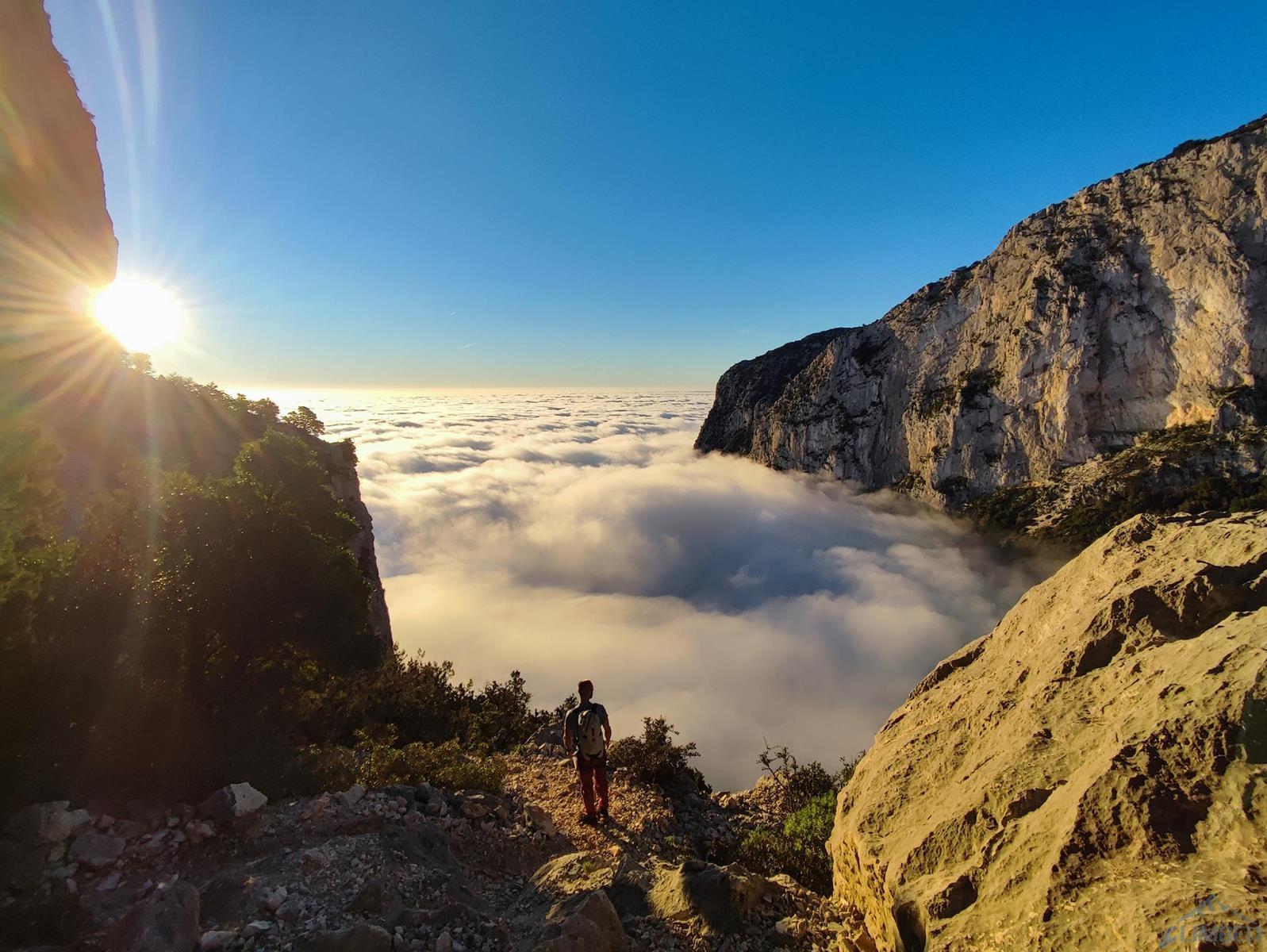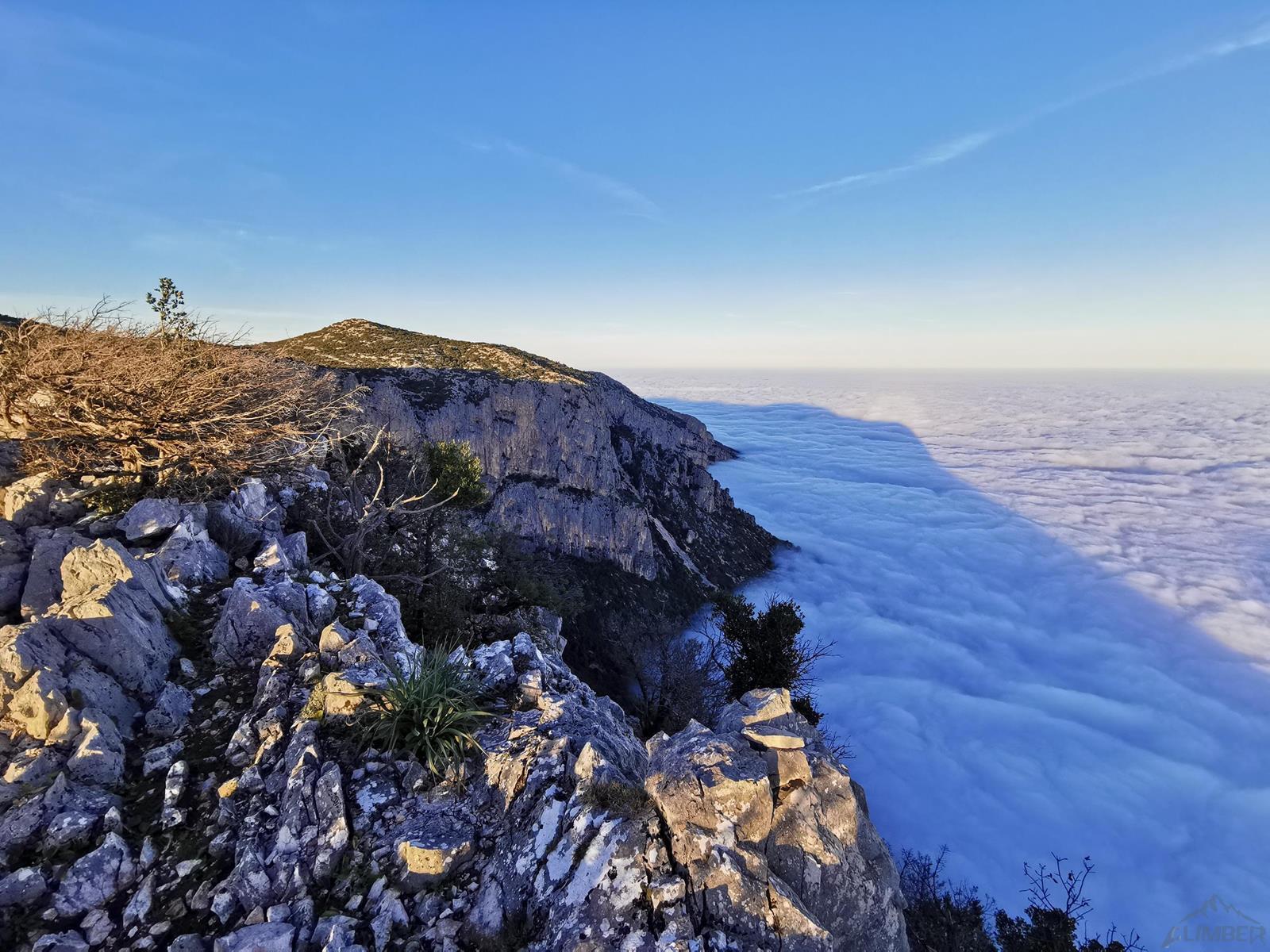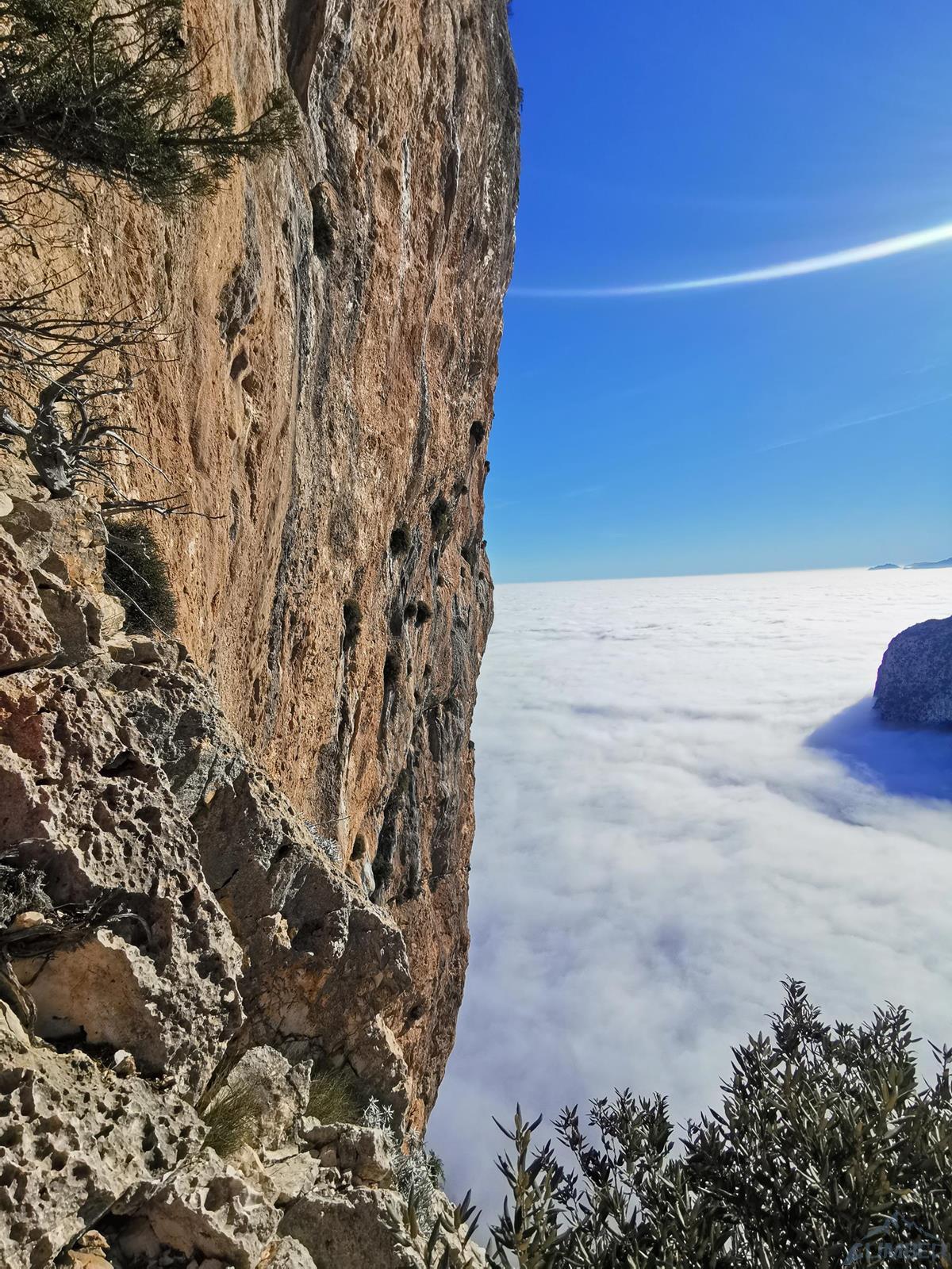 Wyciąg siódmy (6c, 25 m) startuje pionowo do góry po dobrych chwytach, trudno robi się dopiero pod koniec gdy wykonać musimy bulderowy trawers po ostrych jak żyletki chwytach. Za pierwszym razem wypadam pod koniec, druga próba (PP) jest już jednak skuteczna. Do końca drogi pozostaje jeden wyciąg – oryginalny wariant (6c+, 15 m) prowadzi w lewo, nowszy (dłuższy ale łatwiejszy bo 6c) w prawo, co ważne nie idziemy wprost bo jest to 7b należące do drogi dochodzącej z dołu. Wybieram pierwszą opcję i o ile początek jest łatwy, o tyle trudności nie puszczają już przy tym stanie stóp – bulder ma zaledwie kilka ruchów ale chwyty oraz stopnie są bardzo małe. Próbuję dwa razy od dołu, za trzecim razem idę już po bloku i godząc się z drugim AF na drodze pokonuję trudności i wychodzę do stanowiska na tarasie za przełamaniem ściany. Po chwili dołącza do mnie partnerka, rozwiązujemy się i szczęśliwi, że udało przejść się ścianę ruszamy na szczyt – na początek krótka skalna grańka po prawej (II), dalej kilka półek i ścianek. Na wierzchołku Punta Giradili zamiast morza, podobnie jak cały dzień, obserwujemy morze chmur i zbliżający się zachód Słońca. Marzymy o łyku wody, której w ścianie mieliśmy zdecydowanie za mało i po chwili nasze marzenia się spełniają – na szczycie pojawia się dwójka turystów i odstępują nam jedną z przyniesionych butelek 😊.
