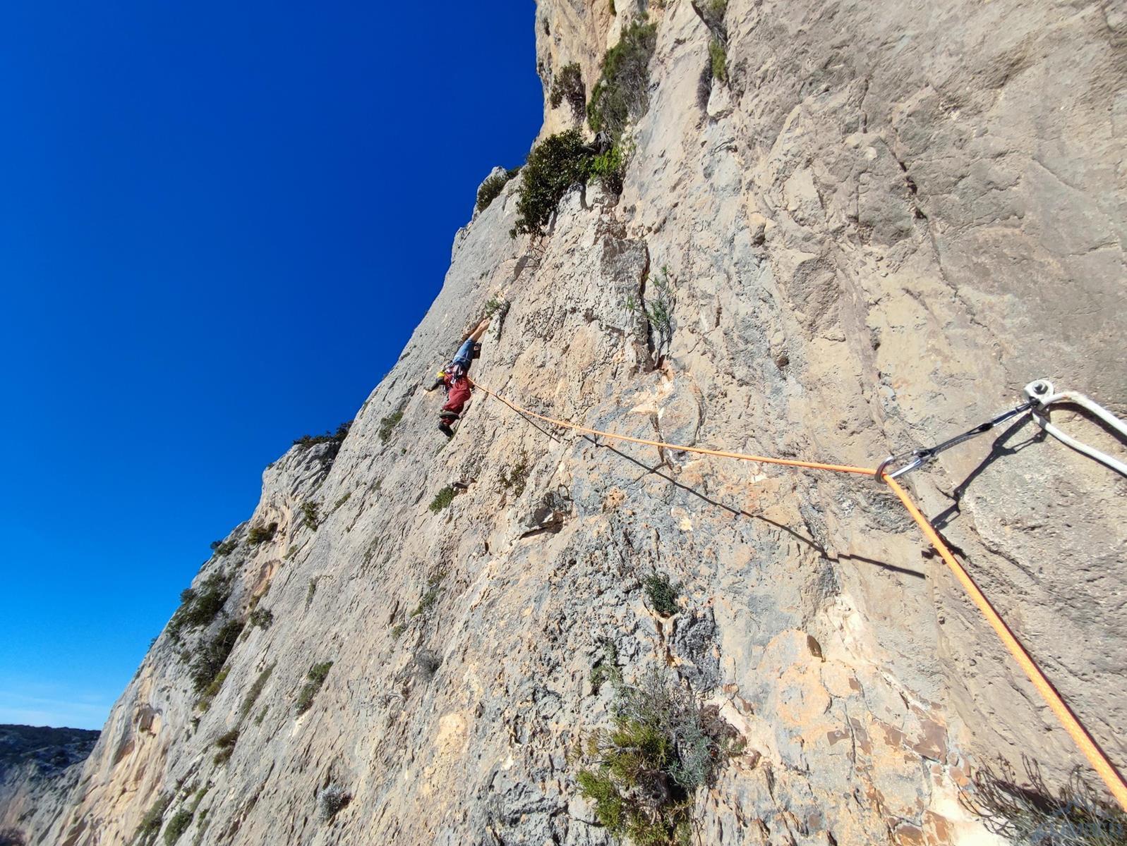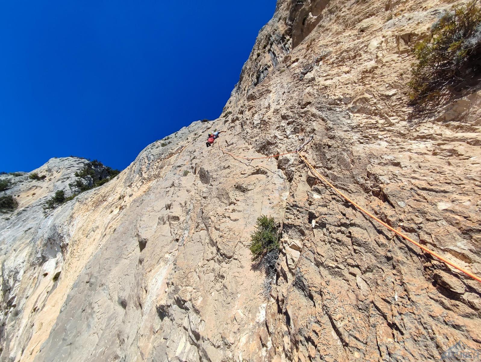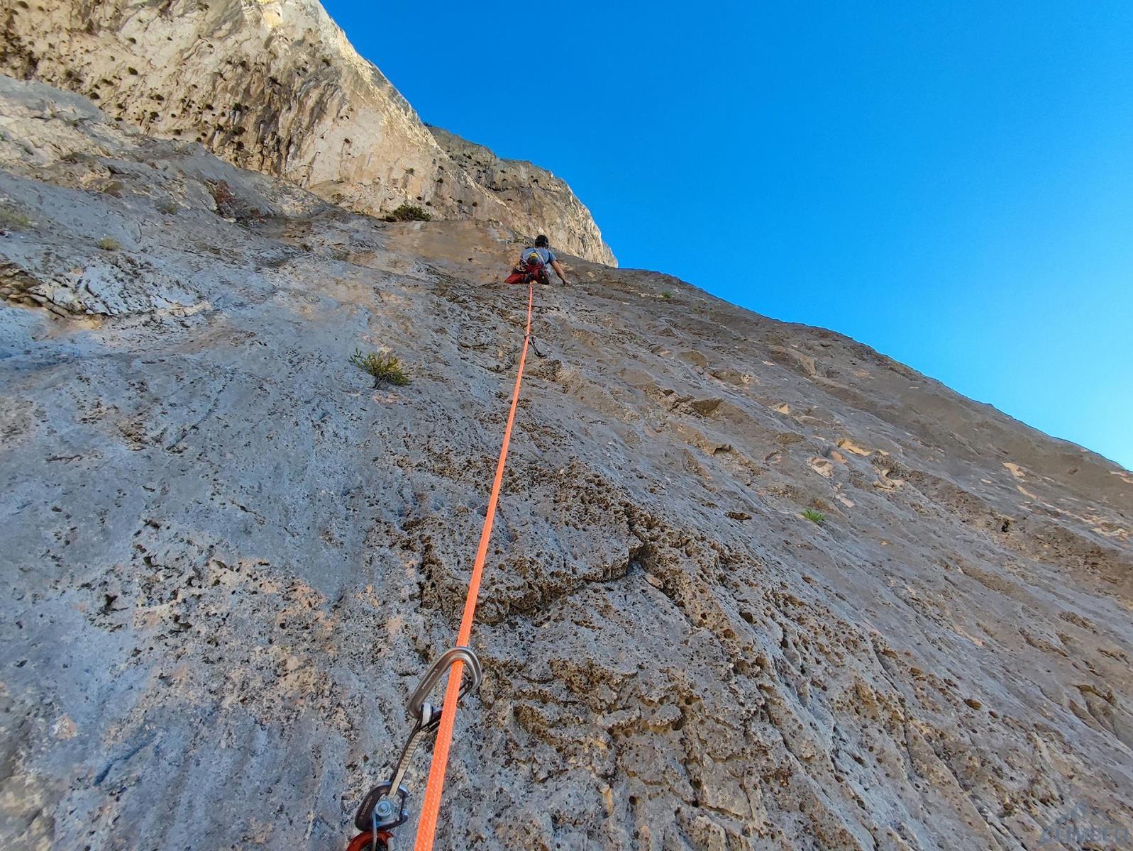 Pocieszam się, że trudności za nami i do końca „tylko” cztery wyciągi, z czego dwa łatwiejsze. Słońce daje się jednak mocno we znaki i coraz trudniej stawać na małe stopnie w postaci dziurek, a na drodze są ich setki. Po raz kolejny przeklinamy się za zabranie na wyjazd tylko ciasnych sportowych butów – wielowyciągów nie było przecież w planach… Piąty wyciąg (6b, 30 m) to piękne techniczne wspinanie – idziemy skośnie w lewo i do góry, trudności odpuszczają dopiero pod koniec (5b) gdy przechodzimy na szarą płytę podziurawioną jak szwajcarski ser. Kolejny odcinek (6a, 40m) jest najłatwiejszym na drodze – wspinamy się trawersem w lewo do ładnej szarej płyty i nią (nie depresją po prawej) po dobrych chwytach kontynuujemy na wygodną półkę ze stanowiskiem, dobrą na dłuższą przerwę.