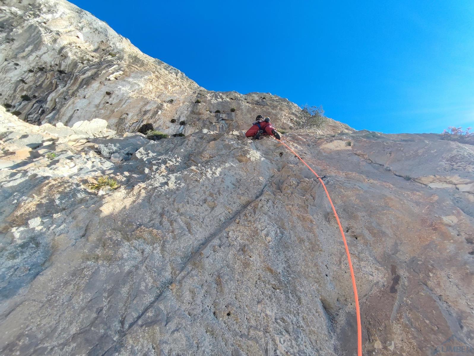 Pierwszy wyciąg jest długi (50 m) i w górnej części mocno ciągowy (6b+) – startujemy piękną szarą płytą, która po około 20 metrach staje dęba. Do stanowiska czeka nas teraz wspinanie po dziurach i krawądkach, skała jest świetna, ostra i tarciowa. Fragmentami zastanawiam się nawet czy nie wbiliśmy w inną drogę, z pierwszym wyciągiem 6c+, jesteśmy jednak tam gdzie trzeba a pierwsze wrażenia zrzucam na efekt nierozgrzania. Trzeba tylko przyzwyczaić się do większych odległości pomiędzy spitami, są fragmenty gdy kolejnego punktu trzeba się doszukiwać 😉. Drugi wyciąg mimo niskiej wyceny (6a+) nie jest za darmo – pokonujemy techniczną ściankę i kierujemy się w prawo na kant filara, gdzie czeka nas wspinanie w pięknie urzeźbionej skale aż do stanowiska (po ok. 40 m).