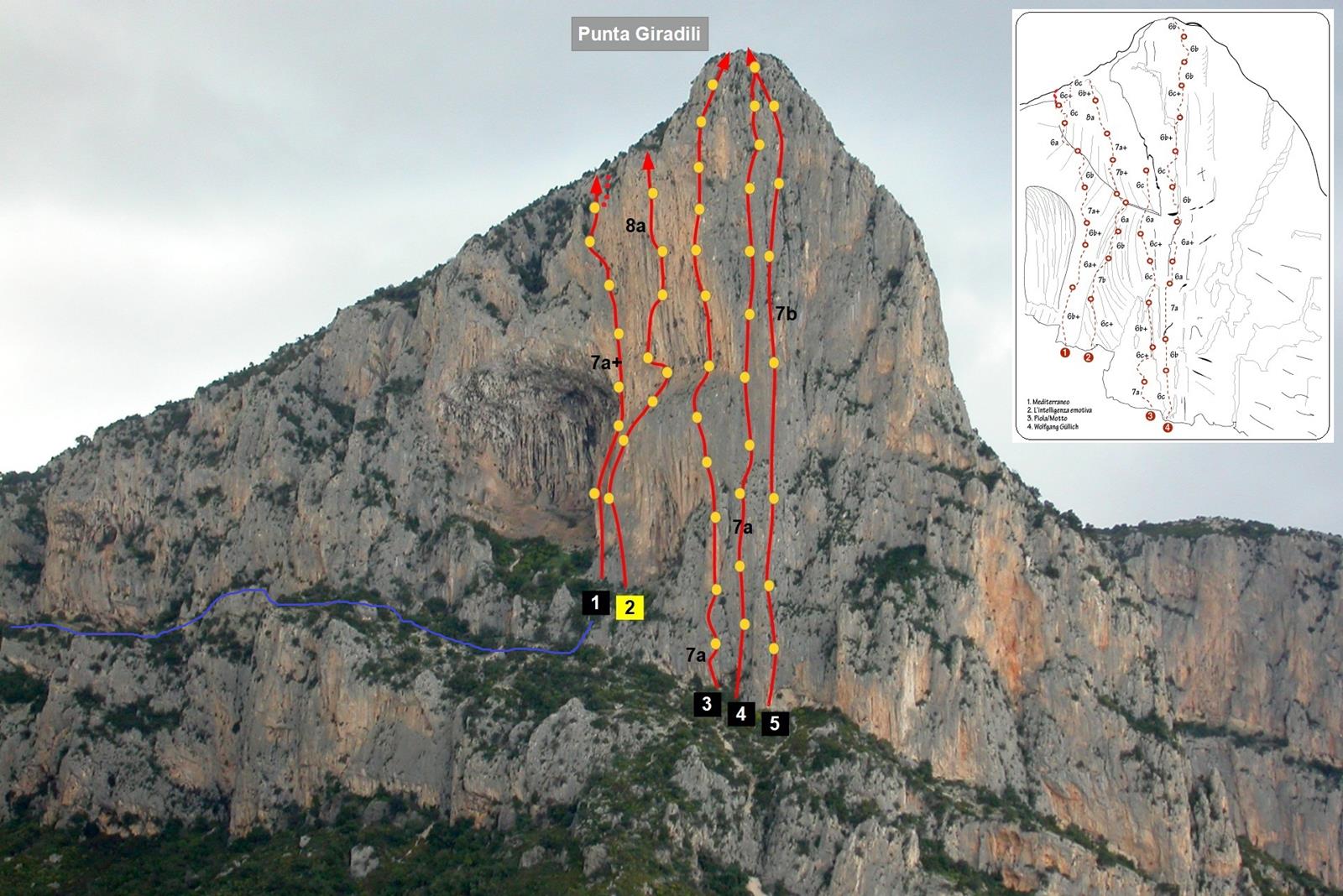 Początkowo nie byliśmy co prawda przekonani, ale po namowach Jerry’ego, który dowiedziawszy się, że jesteśmy na Sardynii od razu napisał „Musicie iść na Giradili!” oraz przy nawracającym natrętnie widokiem ściany w głowie, namawiam Anię byśmy jednak spróbowali – drogi są obite, jedyne co więc nam grozi to wycof. A co powspinamy w pięknej ścianie to nasze! Pierwszym wyborem była co prawda droga Wolfgang Güllich (7a), z powodu długości (12 wyciągów) i ciągowego charakteru decydujemy się jednak na innego klasyka, trudniejszego tylko na jednym wyciągu, za to sporo krótszego (8 wyciągów) - Mediterraneo (7a+). Krótki dzień (koniec grudnia) to jedno, nie spodziewaliśmy się jednak, że dojdzie do tego niesamowity skwar (południowa wystawa), co przy wspinaniu po długich pionowych wyciągach (z krawądkami i dziurami) w ciasnych butach oznacza nie tylko zmagania z trudnościami wspinaczkowymi ale i z własnym progiem bólu 😉. Finalnie drogę udaje się przejść, co prawda w nie najczystszym stylu ale z dużą satysfakcją i niesamowitym bagażem wrażeń. Zdecydowanie był to jeden z lepszych wspinaczkowych dni w moim życiu i gorąco zachęcam do przejścia tej pięknej ściany, nawet jeżeli wydaje się, że zadanie może przerosnąć!