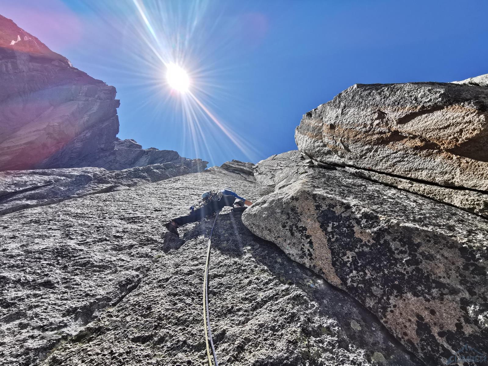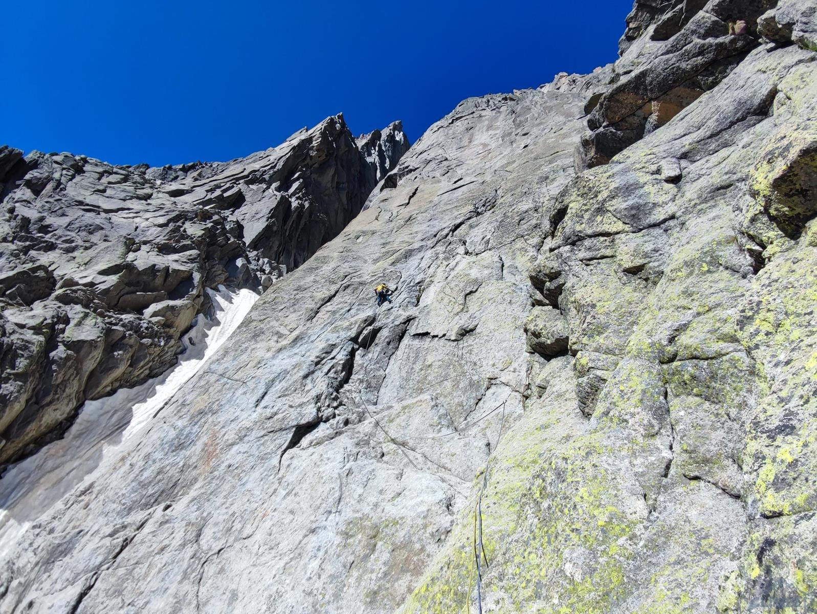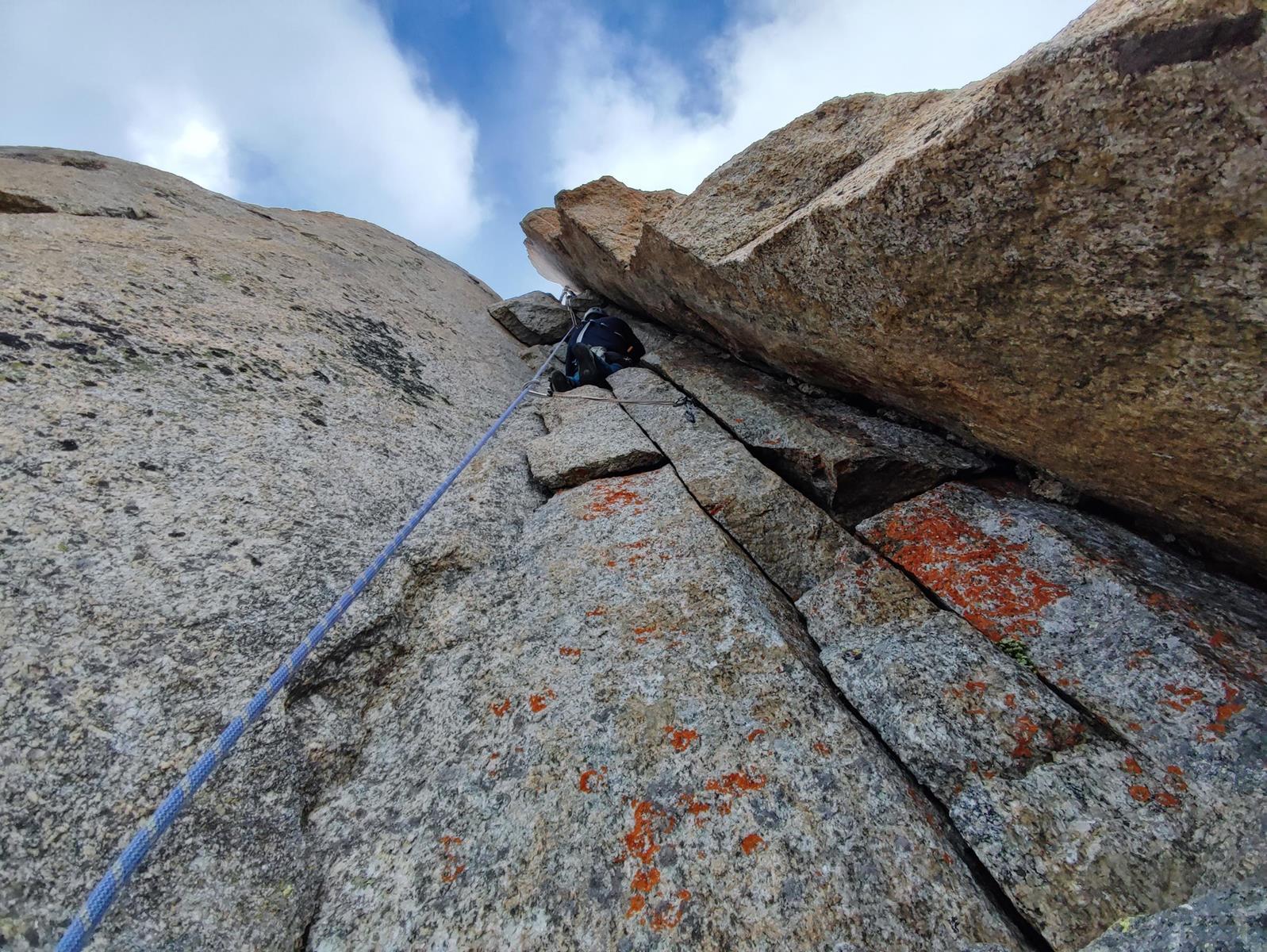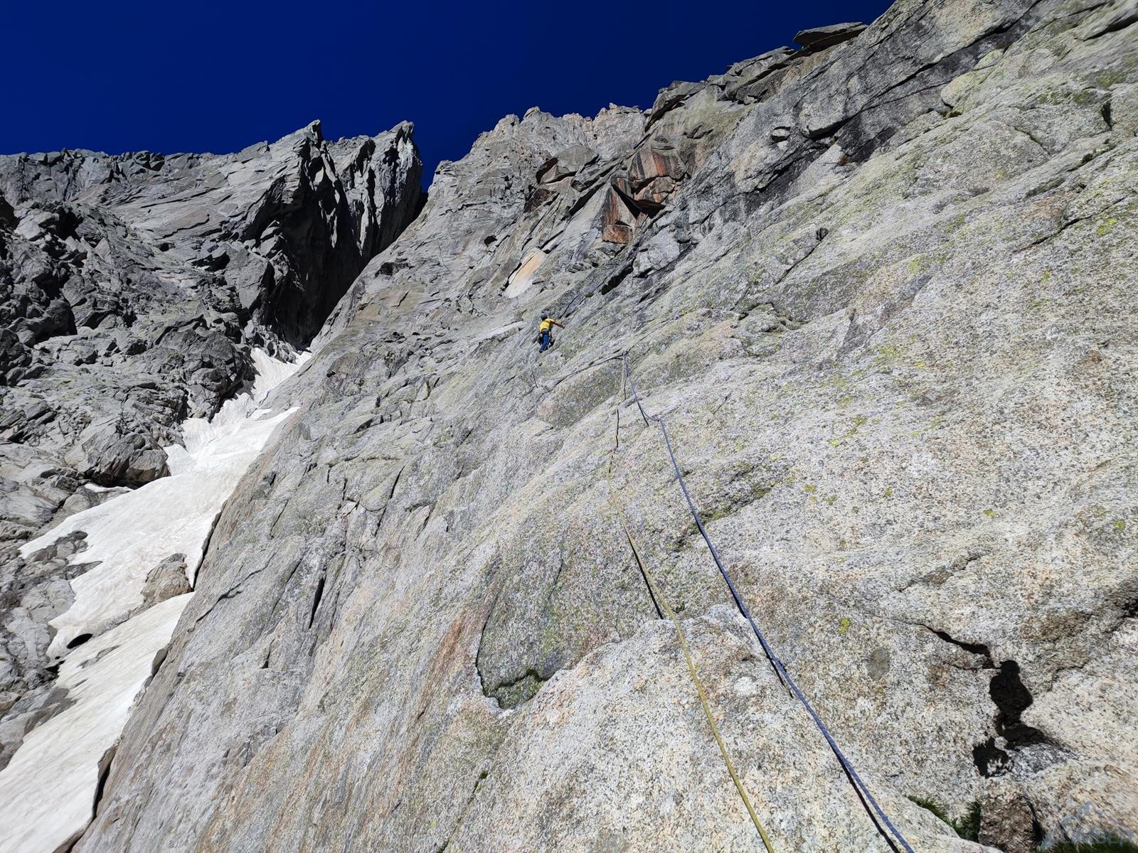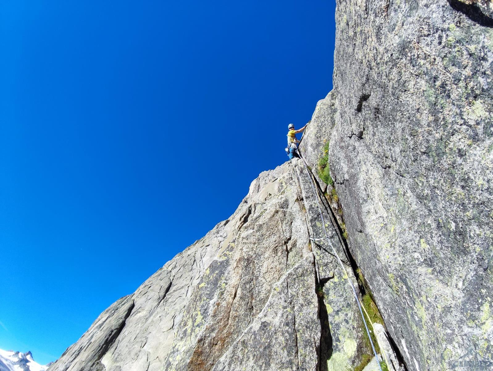 Podejście jest szybkie i ewidentne – z przełęczki nad schroniskiem schodzimy na stabilny i jednolity lodowiec Trelaporte, którym w kilkanaście minut docieramy pod ścianę. Na naszej drodze jest jeden zespół, tuż obok na sąsiedniej Aiguille Du Roc dwie ekipy rozpoczynają wspinanie na innych klasykach, które też rozważaliśmy – Pedro Polar (6b) i Children of the moon (6b). Startujemy w charakterystycznym miejscu – na trójkątnym skalnym bloku pod przewieszką. Prowadzę dziś pierwszą połowę drogi (Romek drugą), po zmianie butów i pozostawieniu zbędnego sprzętu pod ścianą wychodzę (4c) na półkę 10 metrów wyżej – do pierwszego stanowiska. Wspinać zaczynamy się ok. 7:30 i po chwili dosięga nas Słońce – gdyby nie zespół przed nami dobrze byłoby zacząć godzinę wcześniej. Cała droga wyposażona jest w stałe stanowiska zjazdowe, a asekuracja na poszczególnych wyciągach jest komfortowa - spity na płytach i dobra własna w rysach (wystarczy set BD od 0.3 do 2, duble 0.5, 0.75 i 1, kilka kości).