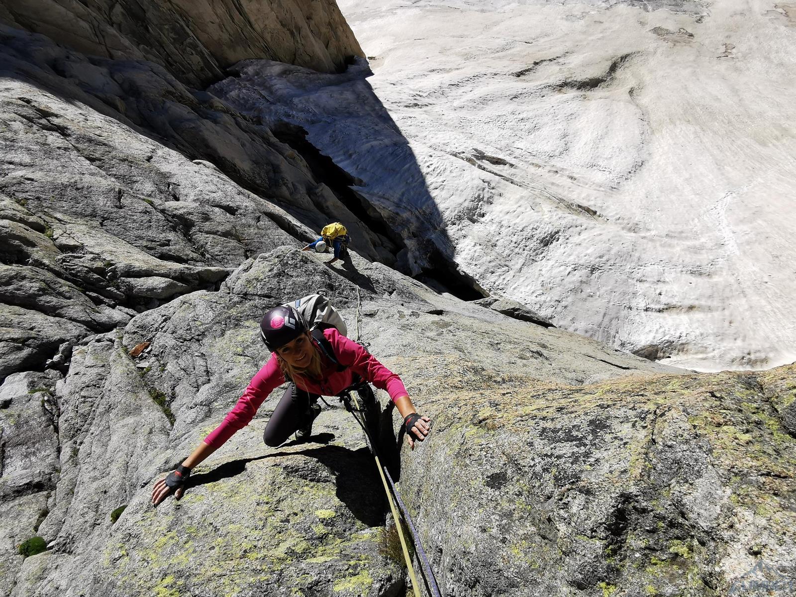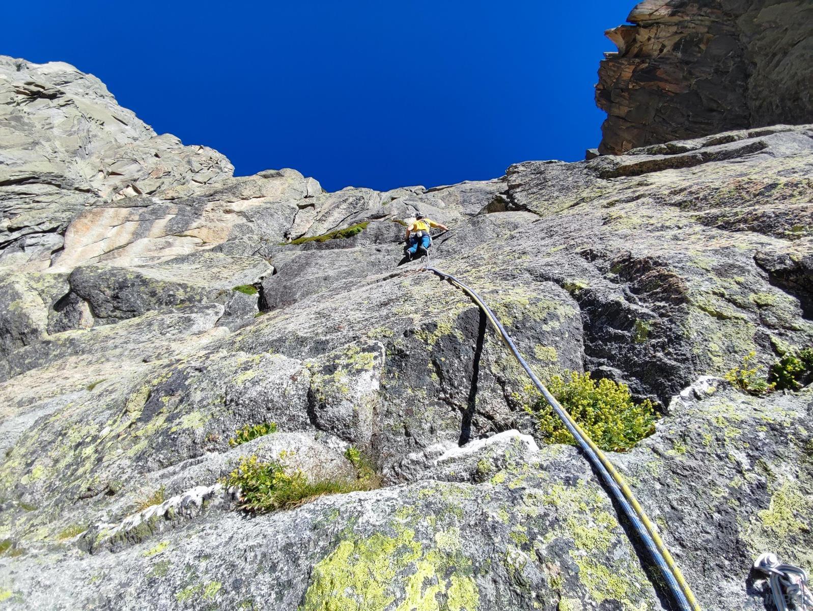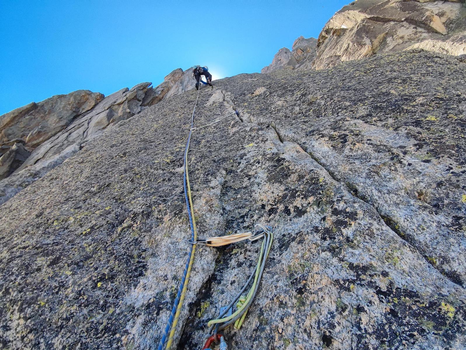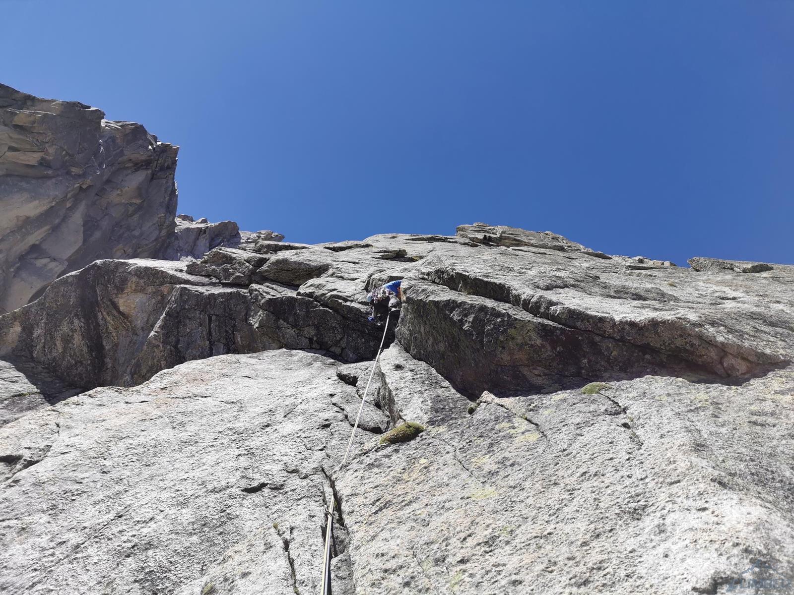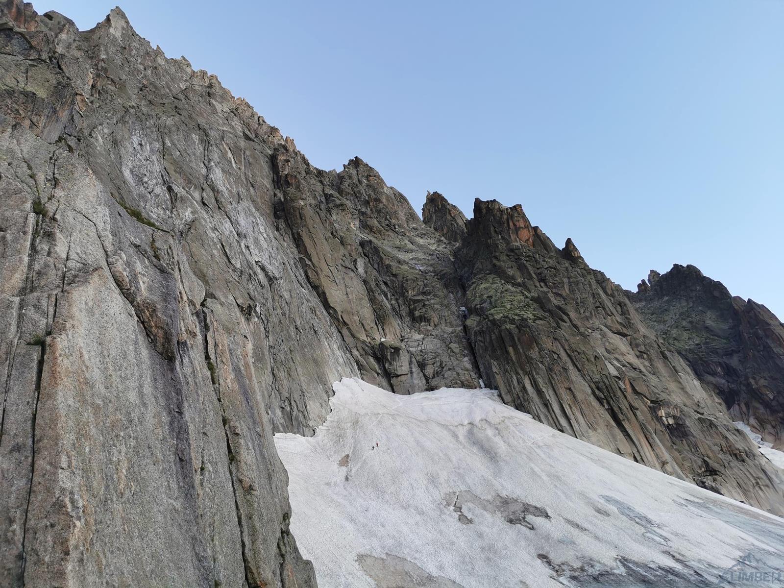 Podejście jest szybkie i ewidentne – z przełęczki nad schroniskiem schodzimy na stabilny i jednolity lodowiec Trelaporte, którym w kilkanaście minut docieramy pod ścianę. Na naszej drodze jest jeden zespół, tuż obok na sąsiedniej Aiguille Du Roc dwie ekipy rozpoczynają wspinanie na innych klasykach, które też rozważaliśmy – Pedro Polar (6b) i Children of the moon (6b). Startujemy w charakterystycznym miejscu – na trójkątnym skalnym bloku pod przewieszką. Prowadzę dziś pierwszą połowę drogi (Romek drugą), po zmianie butów i pozostawieniu zbędnego sprzętu pod ścianą wychodzę (4c) na półkę 10 metrów wyżej – do pierwszego stanowiska. Wspinać zaczynamy się ok. 7:30 i po chwili dosięga nas Słońce – gdyby nie zespół przed nami dobrze byłoby zacząć godzinę wcześniej. Cała droga wyposażona jest w stałe stanowiska zjazdowe, a asekuracja na poszczególnych wyciągach jest komfortowa - spity na płytach i dobra własna w rysach (wystarczy set BD od 0.3 do 2, duble 0.5, 0.75 i 1, kilka kości).