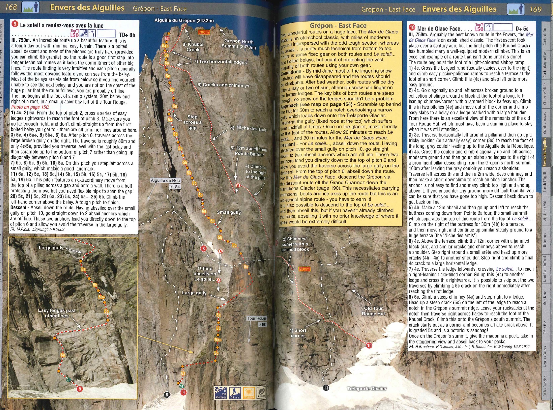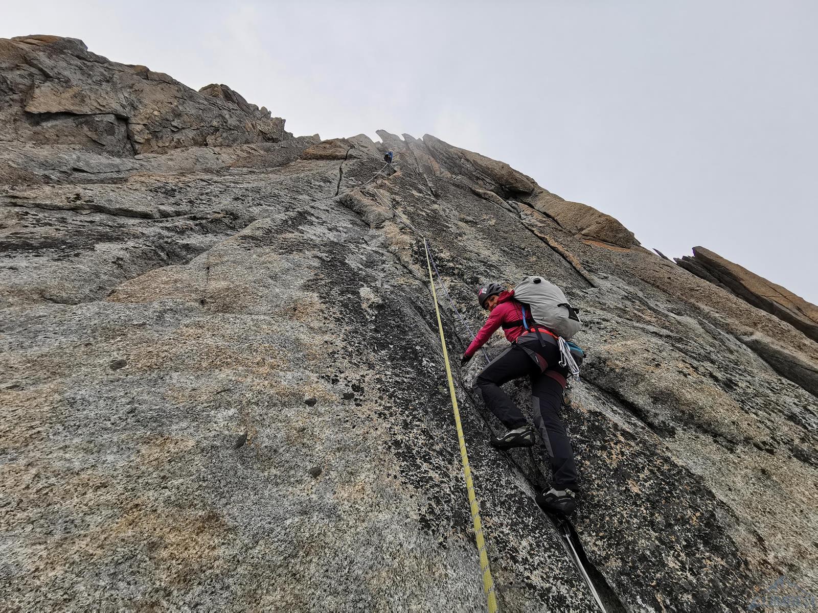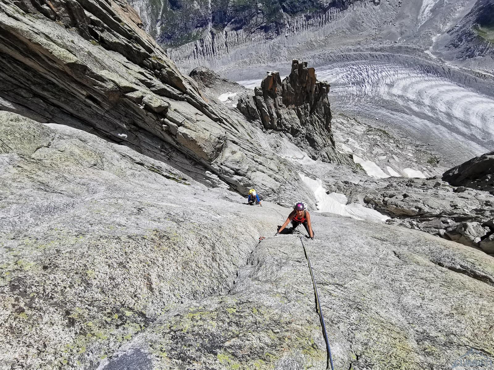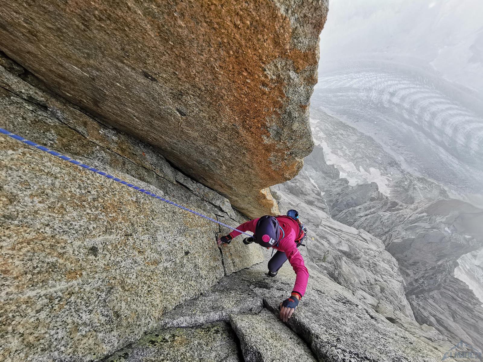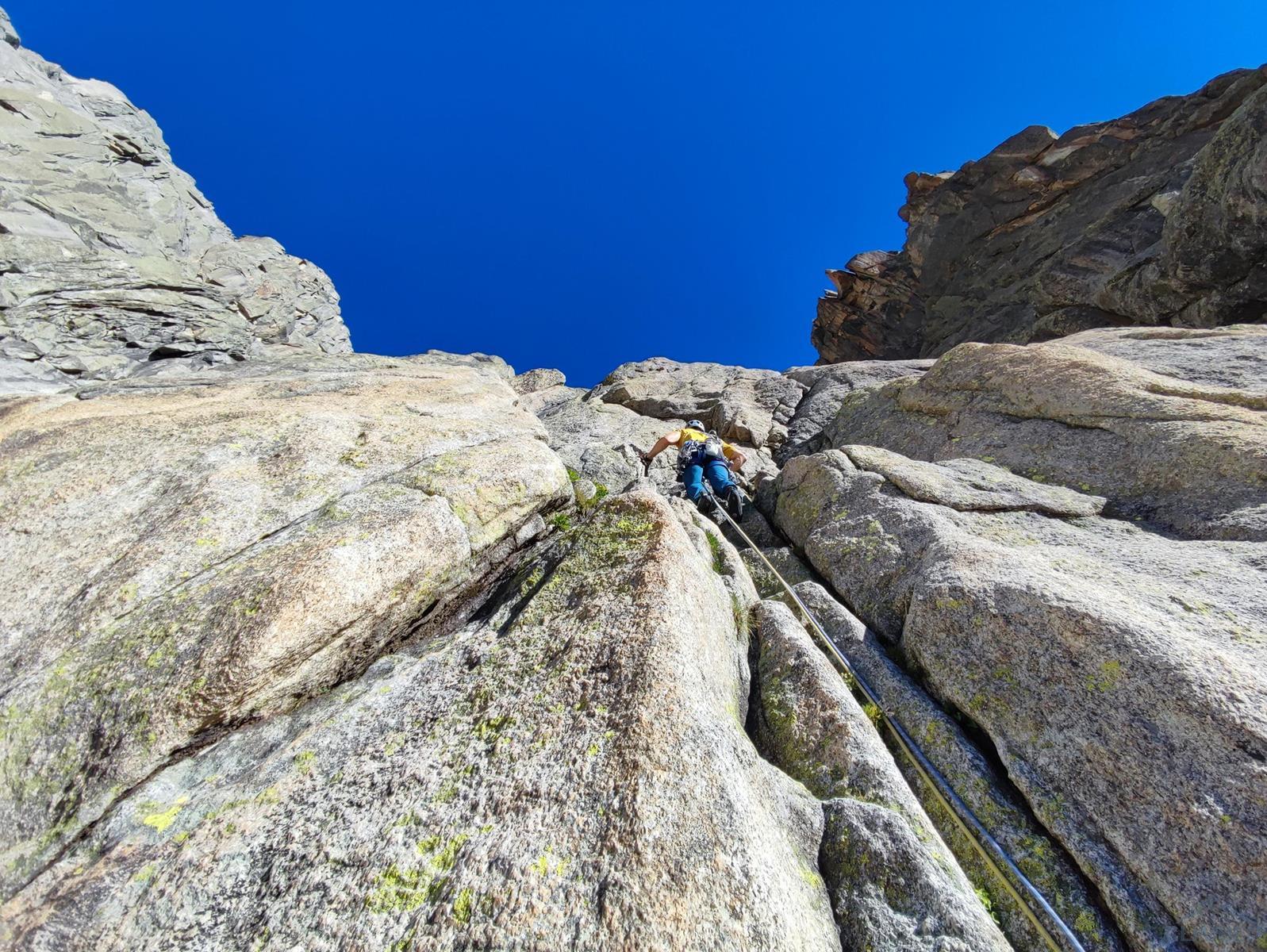Podejście jest szybkie i ewidentne – z przełęczki nad schroniskiem schodzimy na stabilny i jednolity lodowiec Trelaporte, którym w kilkanaście minut docieramy pod ścianę. Na naszej drodze jest jeden zespół, tuż obok na sąsiedniej Aiguille Du Roc dwie ekipy rozpoczynają wspinanie na innych klasykach, które też rozważaliśmy – Pedro Polar (6b) i Children of the moon (6b). Startujemy w charakterystycznym miejscu – na trójkątnym skalnym bloku pod przewieszką. Prowadzę dziś pierwszą połowę drogi (Romek drugą), po zmianie butów i pozostawieniu zbędnego sprzętu pod ścianą wychodzę (4c) na półkę 10 metrów wyżej – do pierwszego stanowiska. Wspinać zaczynamy się ok. 7:30 i po chwili dosięga nas Słońce – gdyby nie zespół przed nami dobrze byłoby zacząć godzinę wcześniej. Cała droga wyposażona jest w stałe stanowiska zjazdowe, a asekuracja na poszczególnych wyciągach jest komfortowa - spity na płytach i dobra własna w rysach (wystarczy set BD od 0.3 do 2, duble 0.5, 0.75 i 1, kilka kości).