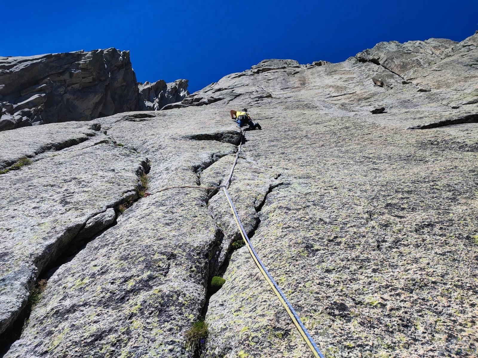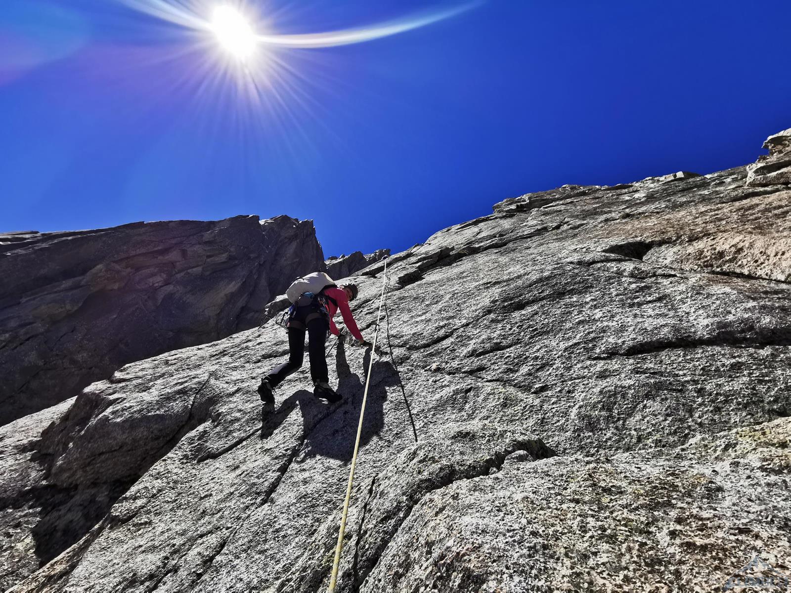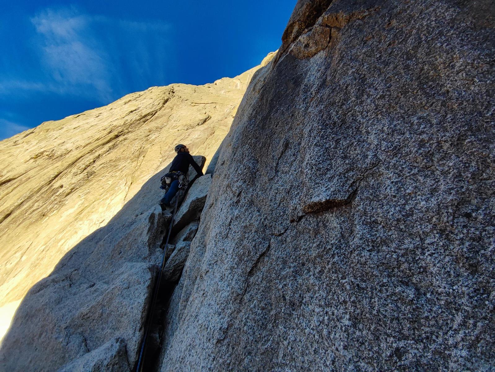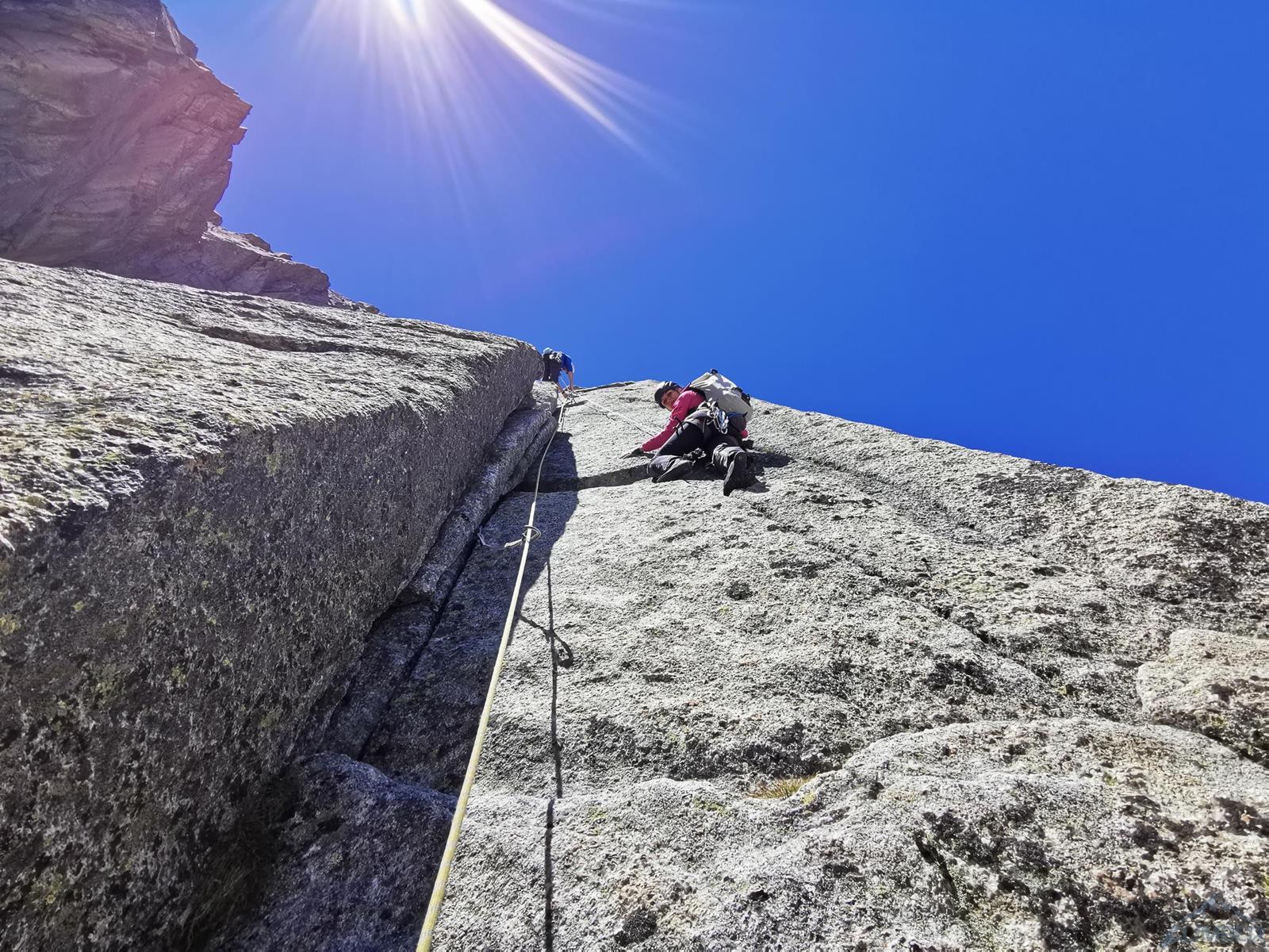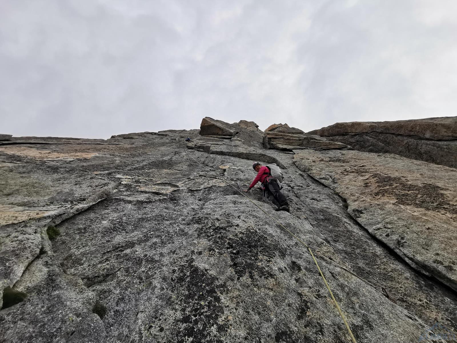 Wyciąg 11ty (6a, 55m) jest bardzo ciekawy – na początek schodzimy w dół 2 metry (poręczówka ale zbędna bo łatwo), trawersujemy w lewo, pokonujemy pionowe zacięcie i wchodzimy w piękną gładką płytę – wg mnie jeden z trudniejszych odcinków na drodze. Na wyciągu 12tym (5c, 50m) czeka nas kolejna perełka – odstrzelona płyta i rysy, palce lizać 😊. Zmieniamy się na prowadzeniu – na pierwszego idzie odtąd Romek, a ja mogę już bezstresowo towarzyszyć Ani w delektowaniu się granitową ucztą i podziwianiu widoków. Druga połowa drogi prowadzi wzdłuż wielkiego filara i jest bardziej ewidentna i efektowna od części pierwszej, obie zajęły nam mniej więcej tyle samo czasu (po 5 i pół godziny).
