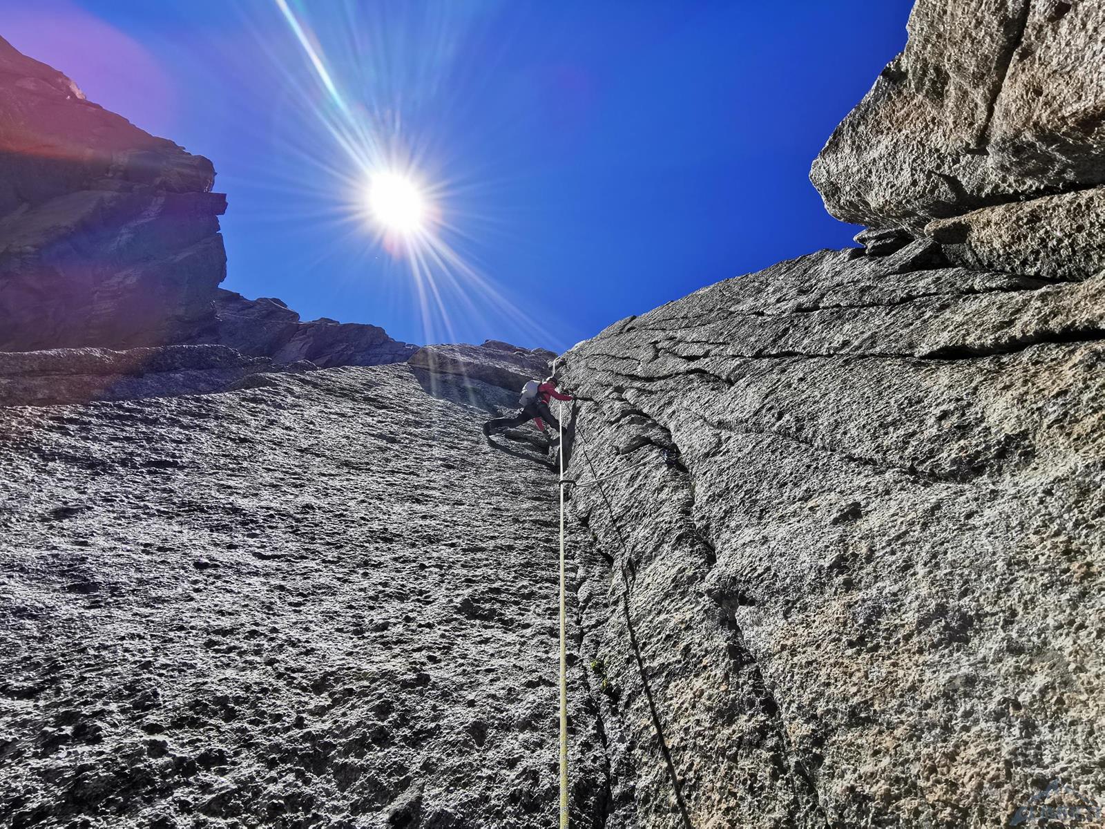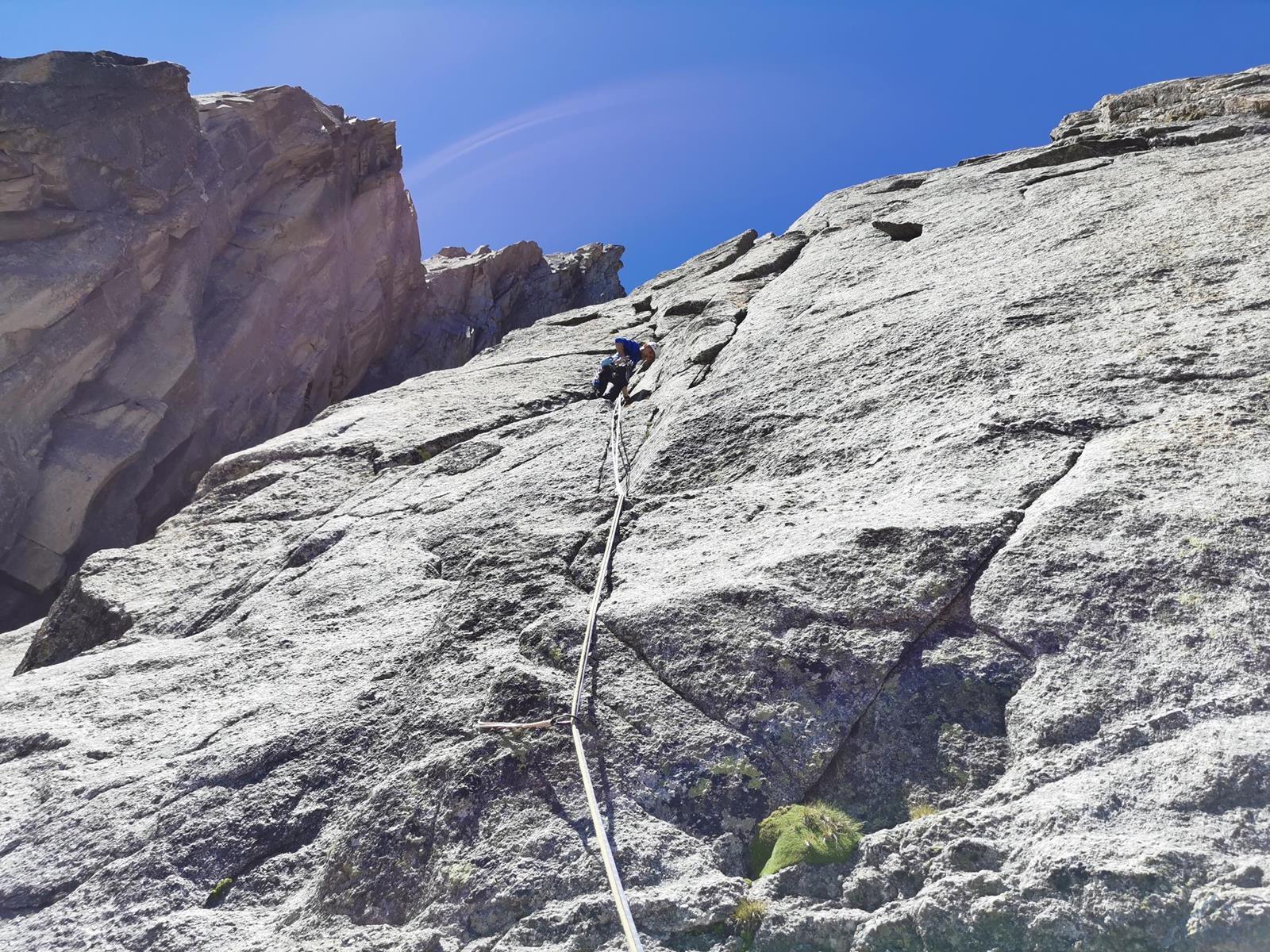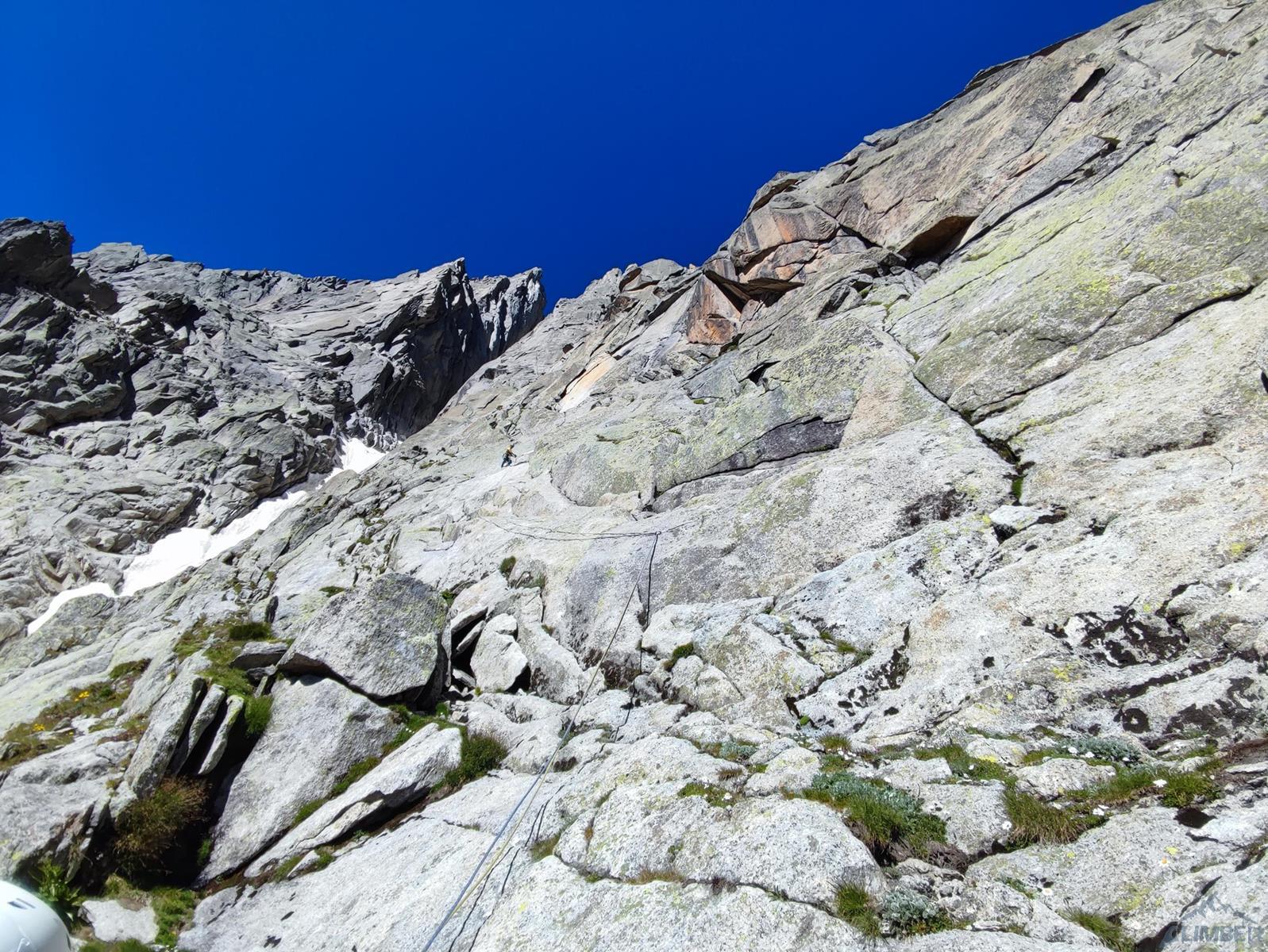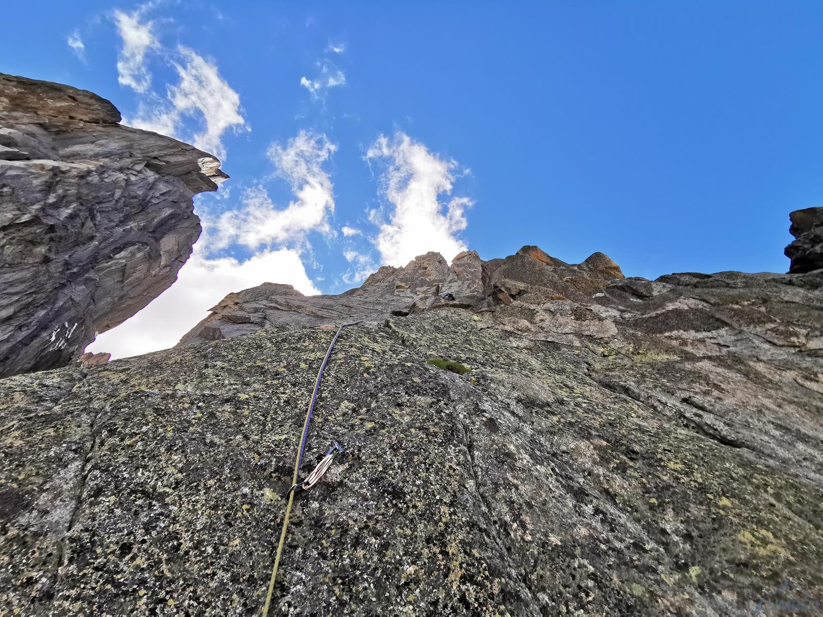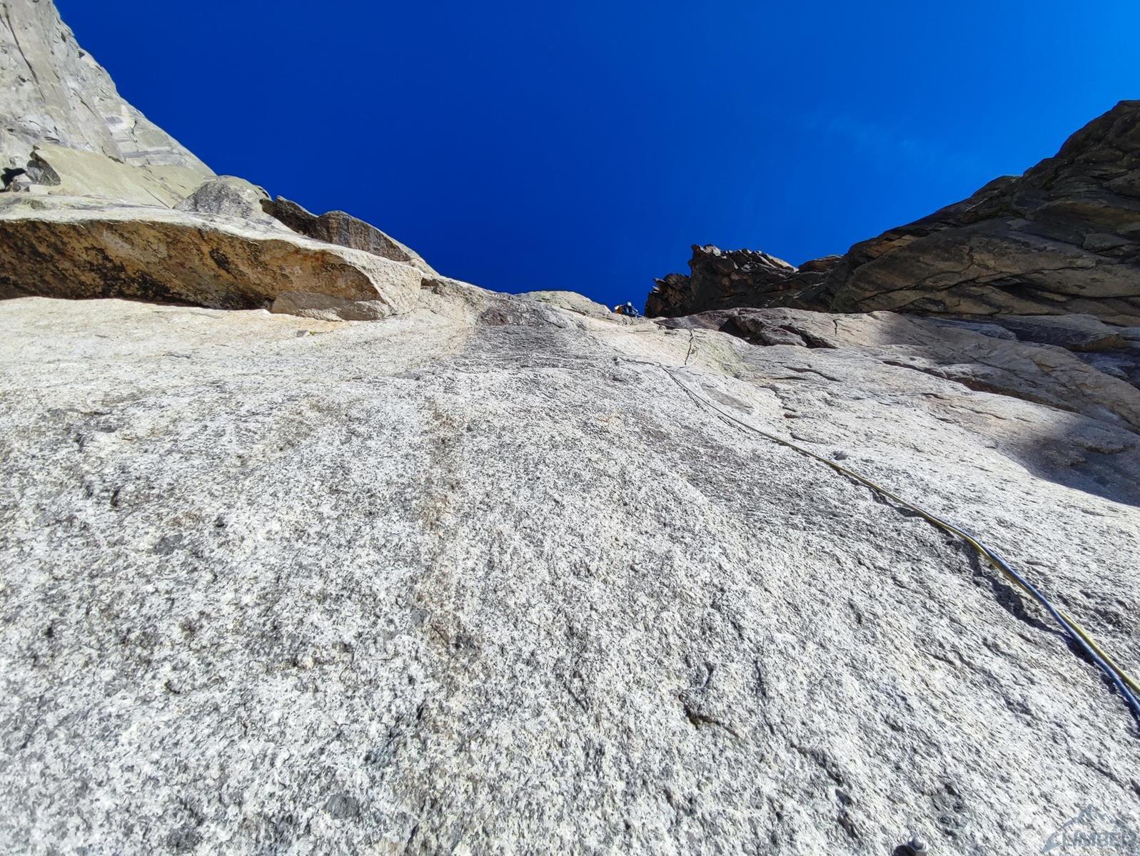 Wyciąg 19-ty (6a, 40m) zaczynamy od pięknej rysy, która wyprowadza nas na spiętrzenie filara, gdzie czeka niespodzianka – półtorametrowy krok nad przepaścią! Miejsce to pokonujemy za pomocą poręczówki, skacząc lub robiąc szpagat - jeżeli starczy nam zasięgu… Na wyciągu 20-tym (5c, 50m) wspinamy się zacięciami, na 21-tym (5c, 50m) płytą, na 22-gim (5c, 50m) pilnujemy by pod skośnym okapem strawersować do zacięcia w lewo, na kolejnym (5c, 50m) przecinamy drogę normalną i kierujemy się pionowo do góry . Swoją drogą wydaje się, że końcówka drogi jest na wyciągniecie ręki a tu kolejne 50 metrów, i kolejne, i kolejne – wspinanie nadal jest piękne i cieszy ale stopy już trochę bolą 😊.