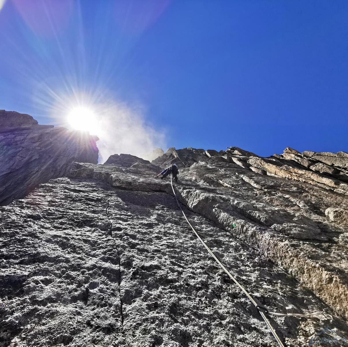 Wycena: VII   Wycena uzupełniająca: 6b TD+   Asekuracja: RS2   Długość [m]: 1200   Wyciągi: 25   Czas [h]: 11   Wystawa: SE   Ocena: 9/10   Komentarz: Deniwelacja 800m.