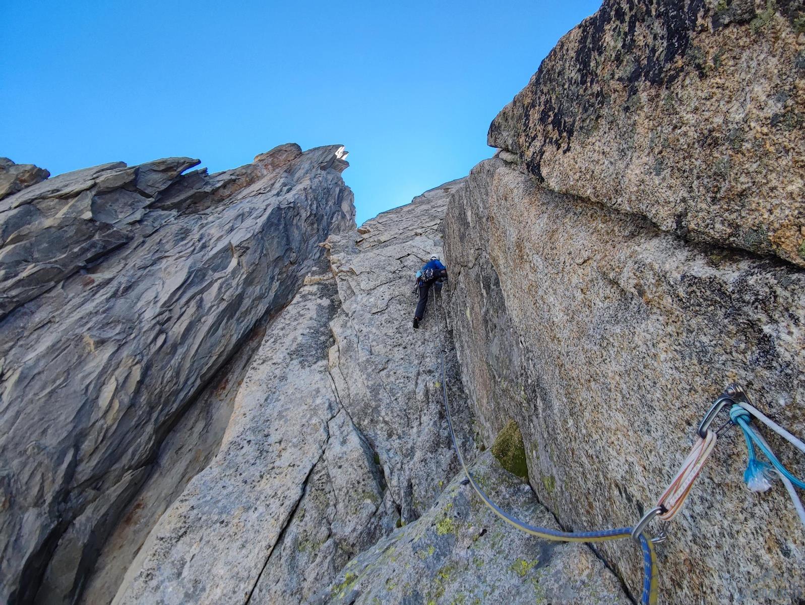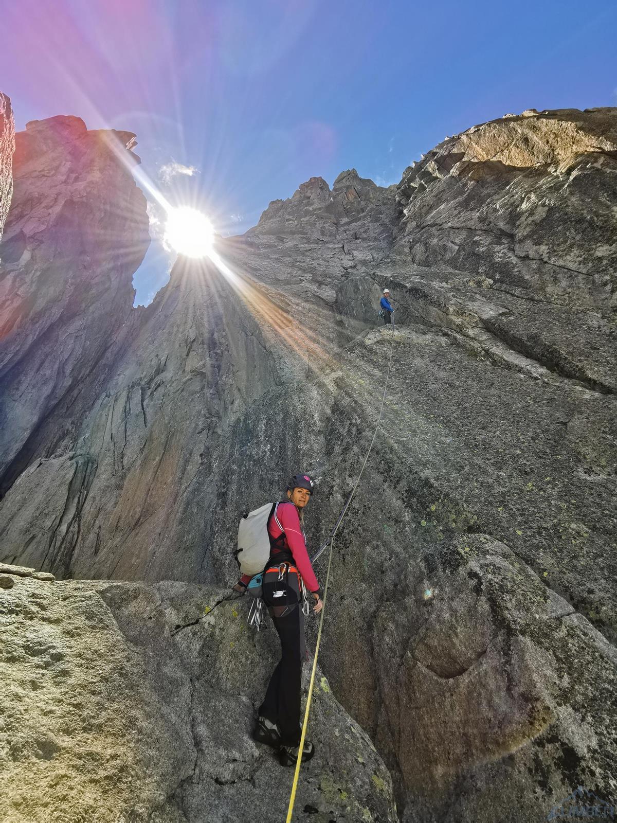 Wyciąg 24-ty (6a+, 50m) jest jednym z ciekawszych – prowadzi wzdłuż pięknych zacięć i rys. Crux drogi (wg topo) czeka nas jednak na ostatnim odcinku (6b, 40m) – komin wygląda jednak na trudniejszy niż jest w rzeczywistości, choć warto robić go bez plecaka. U nas tym razem nie tylko prowadzący idzie na lekko – zostawiamy z Anią toboły na stanowisku, do którego zaraz zjedziemy, dzięki czemu sprawnie i szybko pokonujemy ostatnie metry i dołączamy do Romka czekającego pod piękną iglicą na grani. Po krótkiej przerwie wracamy do plecaków, ubieramy zabrane podejściówki i ok. 19-tej zaczynamy zjazdy.