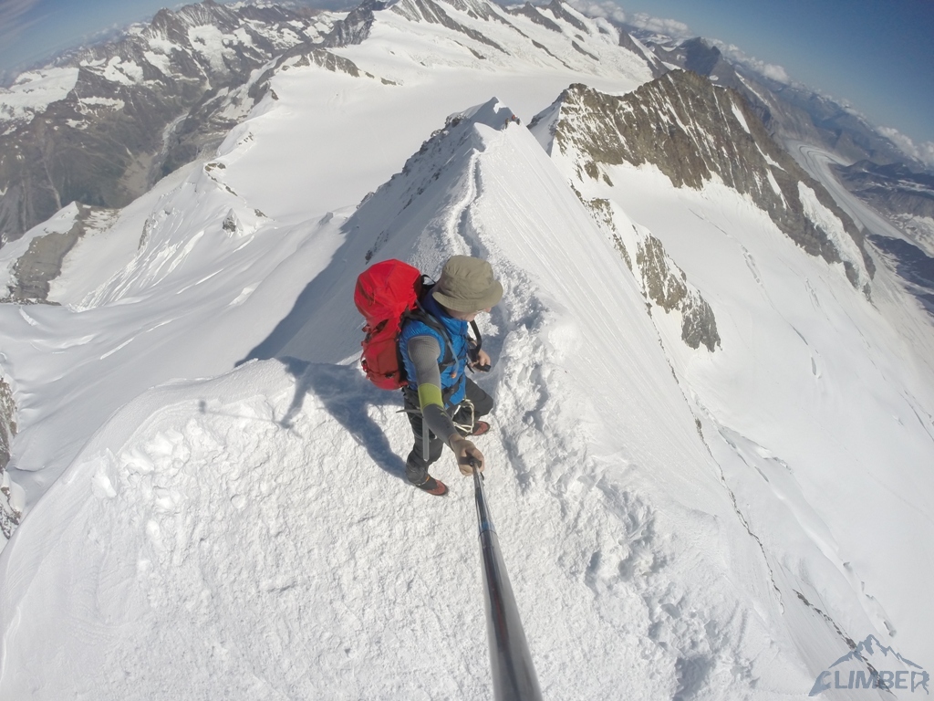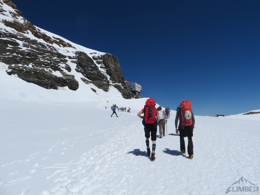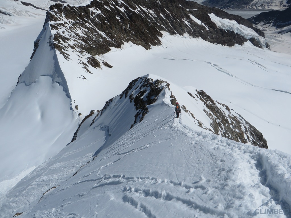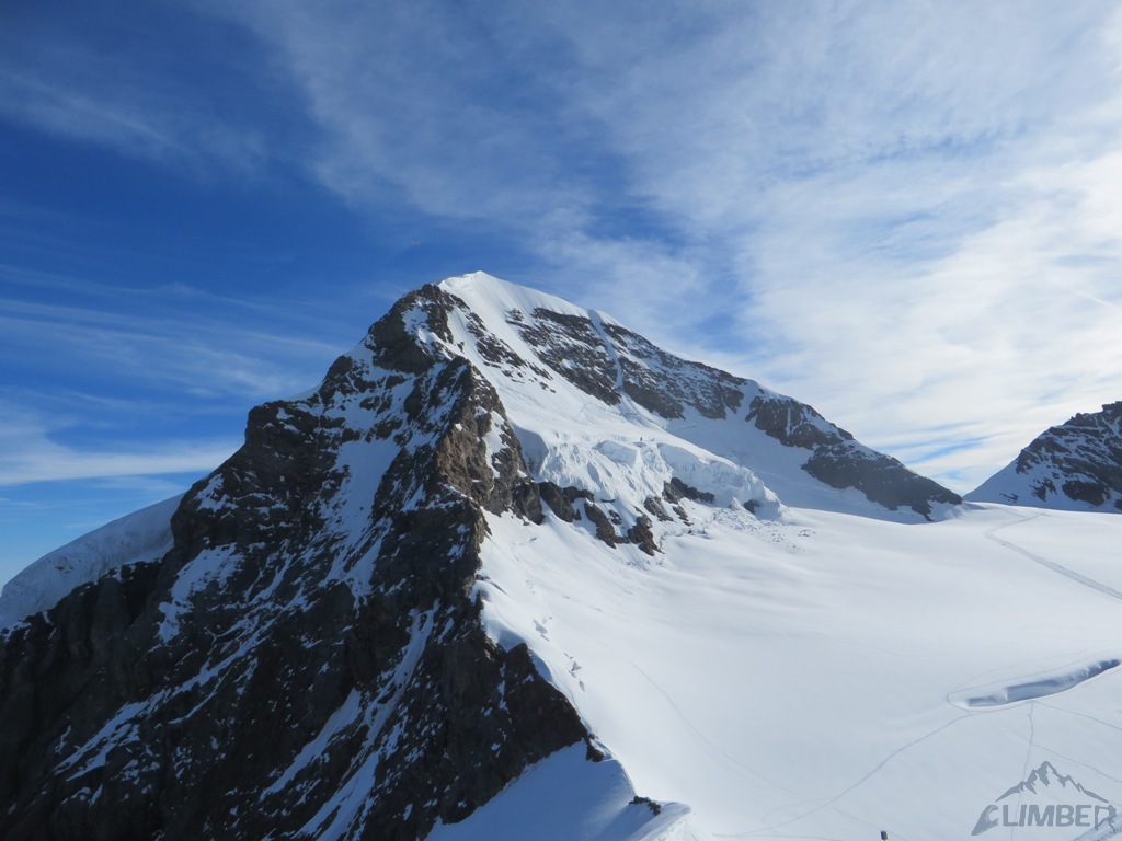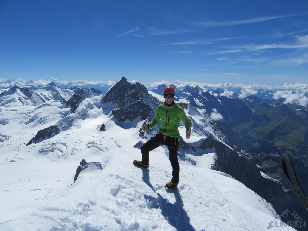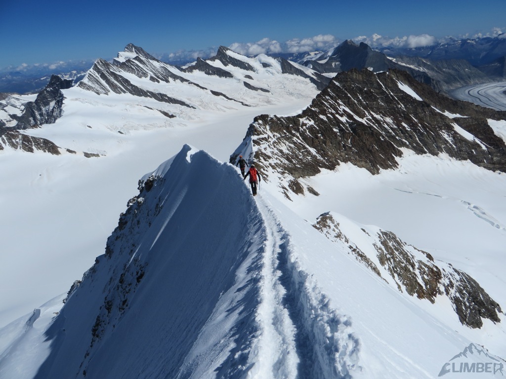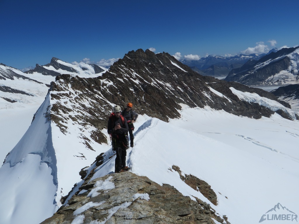 Po skorzystaniu ze słynnej kolejki Eiger Express do schroniska Mönchsjoch (3650 m.) docieramy około 13, szybki przepak i ruszamy w stronę pierwszego celu. Słońce strasznie daje popalić, a ja pluję sobie w brodę, że zabrałem tylko zimowe spodnie. Dodatkowo pierwszy raz odczuwam co to znaczy brak aklimatyzacji, na grani szczytowej mocno kręci mi się w głowie co biorąc pod uwagę lufę z jednej i z drugiej strony, nie jest zbyt komfortowe. Szczyt zdobywamy jednak sprawnie i bez przygód oraz niespodziewanych trudności (nie asekurujemy się w żadnym miejscu), spokojnie zdążamy na zamówioną kolację chociaż nikt nie ma apetytu z powodu coraz gorszego bólu głowy. Noc nie będzie za przyjemna, a kolejnego dnia czeka nas kolejny cel - Jungfrau (relacja TUTAJ).