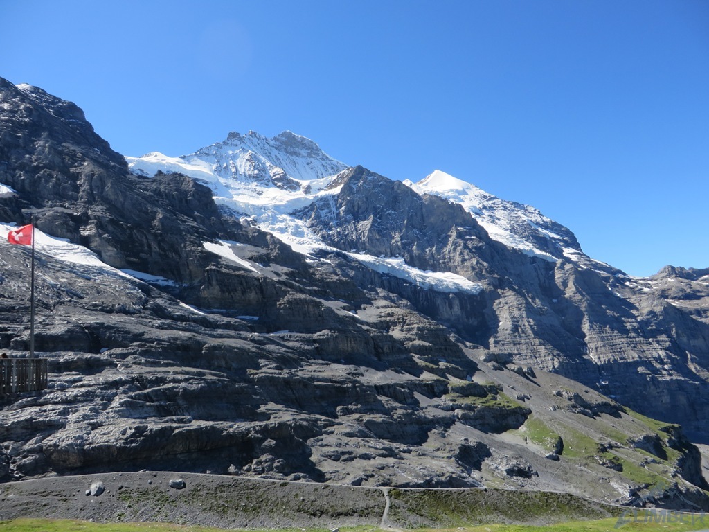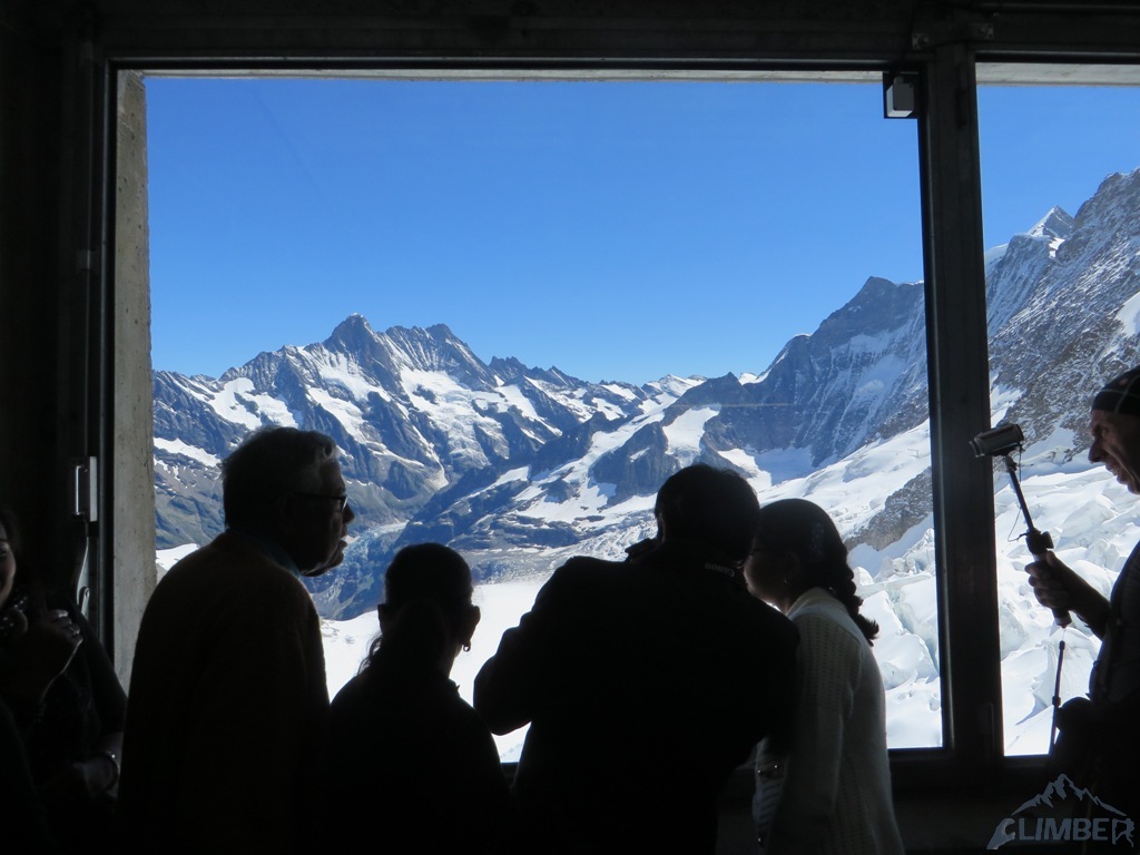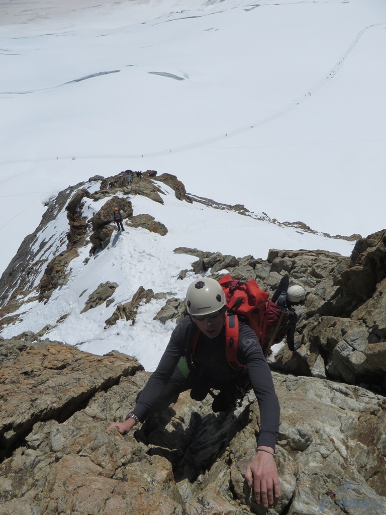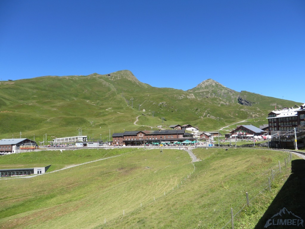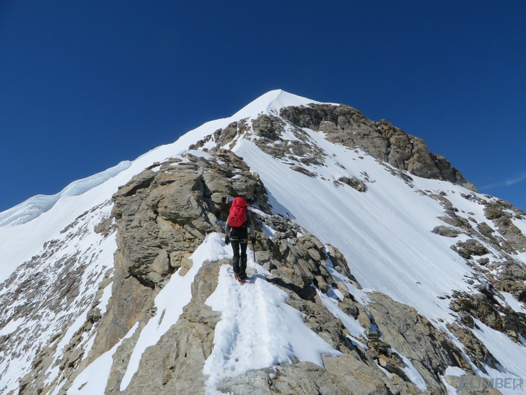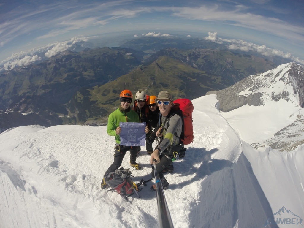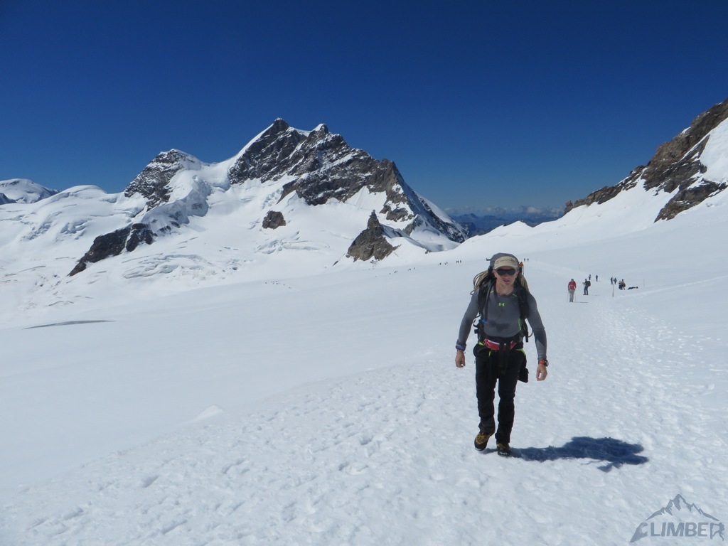 Po skorzystaniu ze słynnej kolejki Eiger Express do schroniska Mönchsjoch (3650 m.) docieramy około 13, szybki przepak i ruszamy w stronę pierwszego celu. Słońce strasznie daje popalić, a ja pluję sobie w brodę, że zabrałem tylko zimowe spodnie. Dodatkowo pierwszy raz odczuwam co to znaczy brak aklimatyzacji, na grani szczytowej mocno kręci mi się w głowie co biorąc pod uwagę lufę z jednej i z drugiej strony, nie jest zbyt komfortowe. Szczyt zdobywamy jednak sprawnie i bez przygód oraz niespodziewanych trudności (nie asekurujemy się w żadnym miejscu), spokojnie zdążamy na zamówioną kolację chociaż nikt nie ma apetytu z powodu coraz gorszego bólu głowy. Noc nie będzie za przyjemna, a kolejnego dnia czeka nas kolejny cel - Jungfrau (relacja TUTAJ).