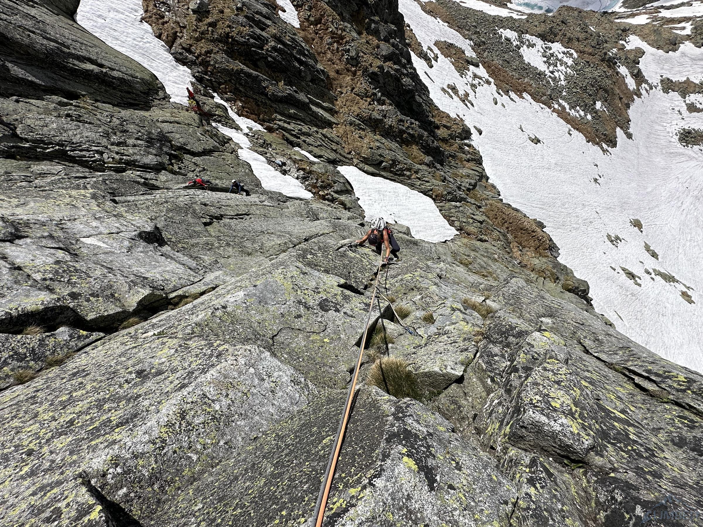 Po zjeździe Kominem Puskasa jesteśmy z powrotem pod ścianą, choć emocje z drogi pozostaną z nami dłużej – nie spodziewaliśmy się, że tak krótka droga dostarczy nam ich aż tyle 😊. Polecam lubiącym taternickie wyzwania - na drodze bardziej niż moc przydaje się doświadczenie wspinaczkowe w górskich formacjach i opanowanie.