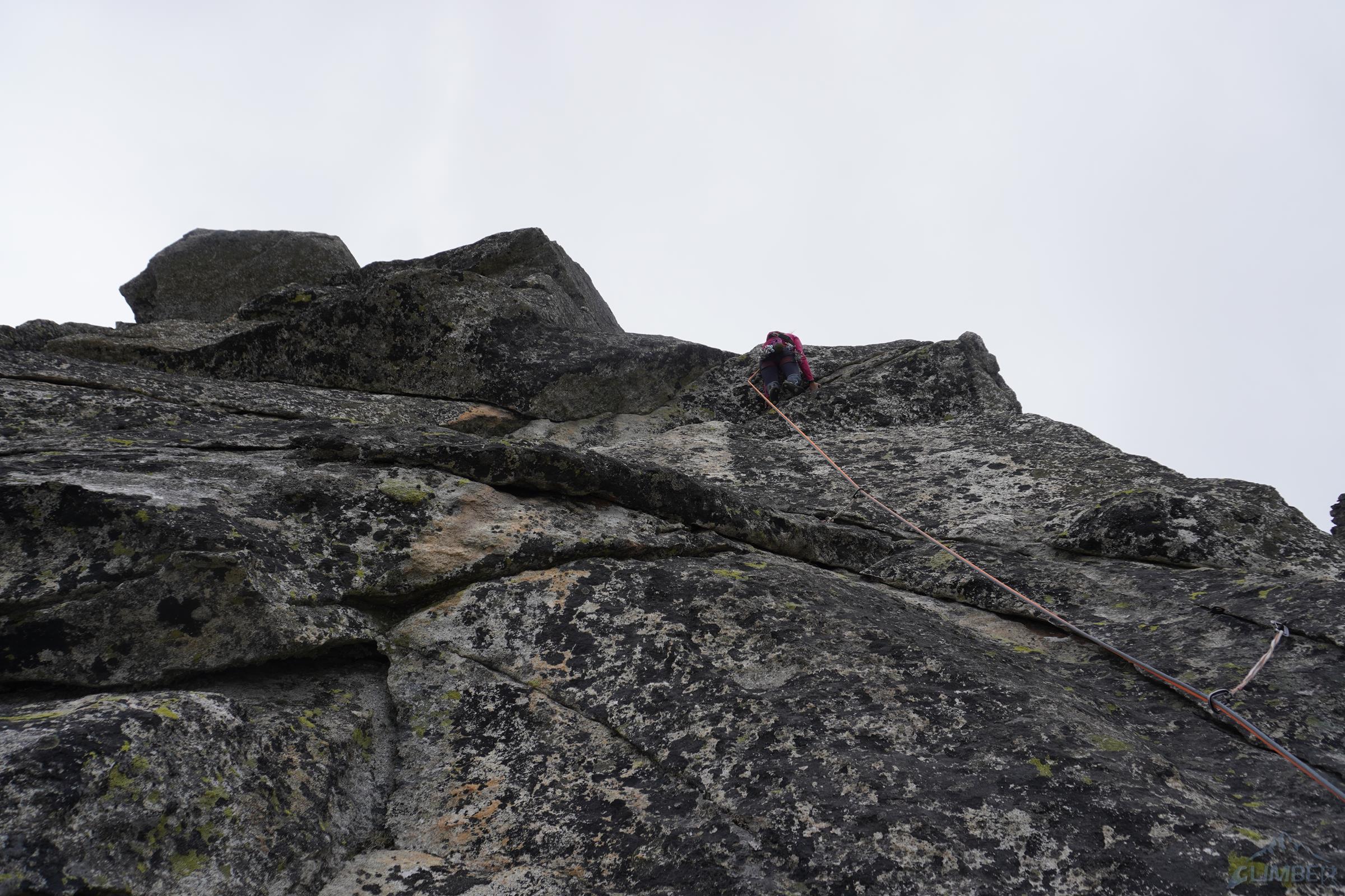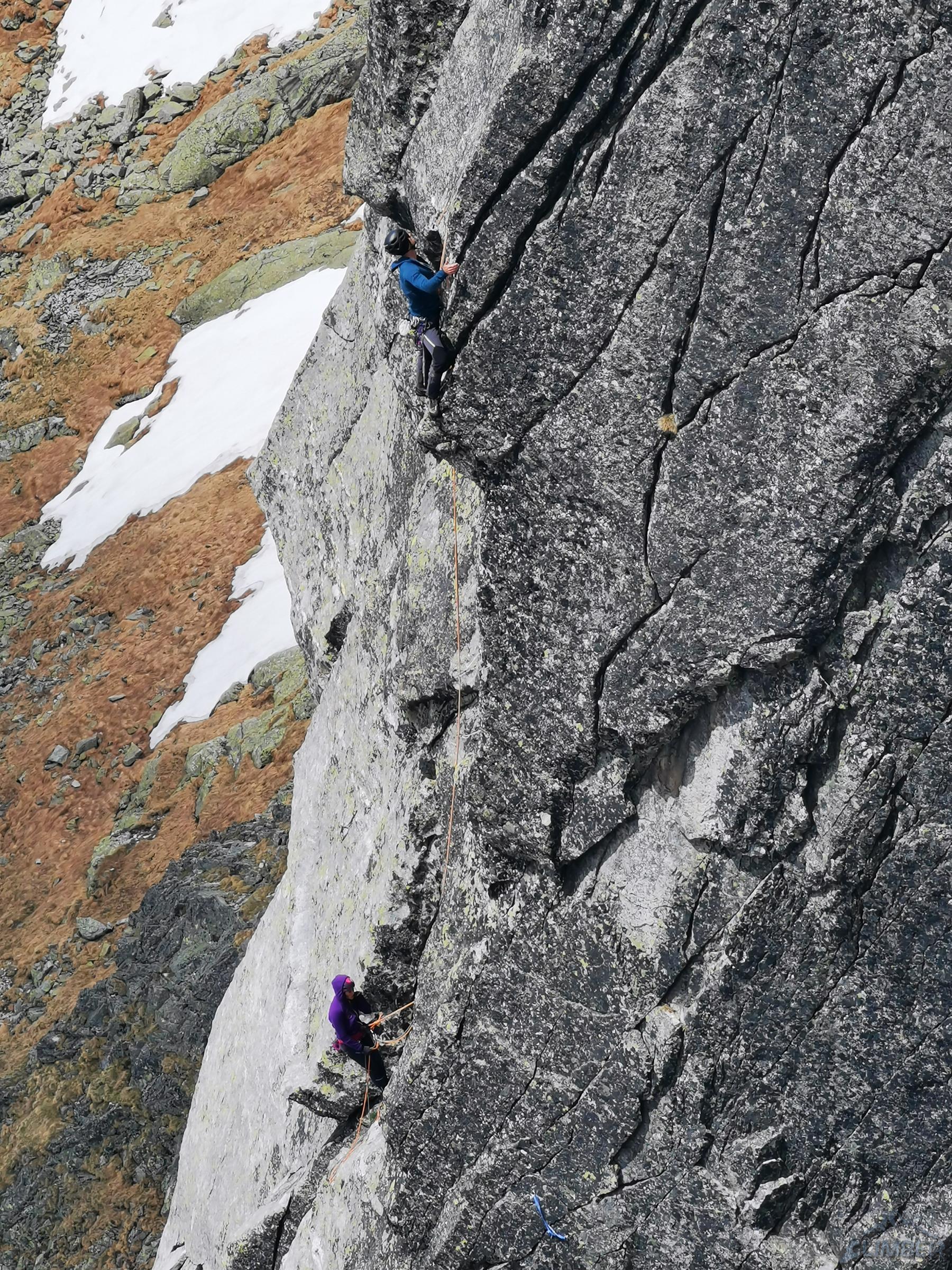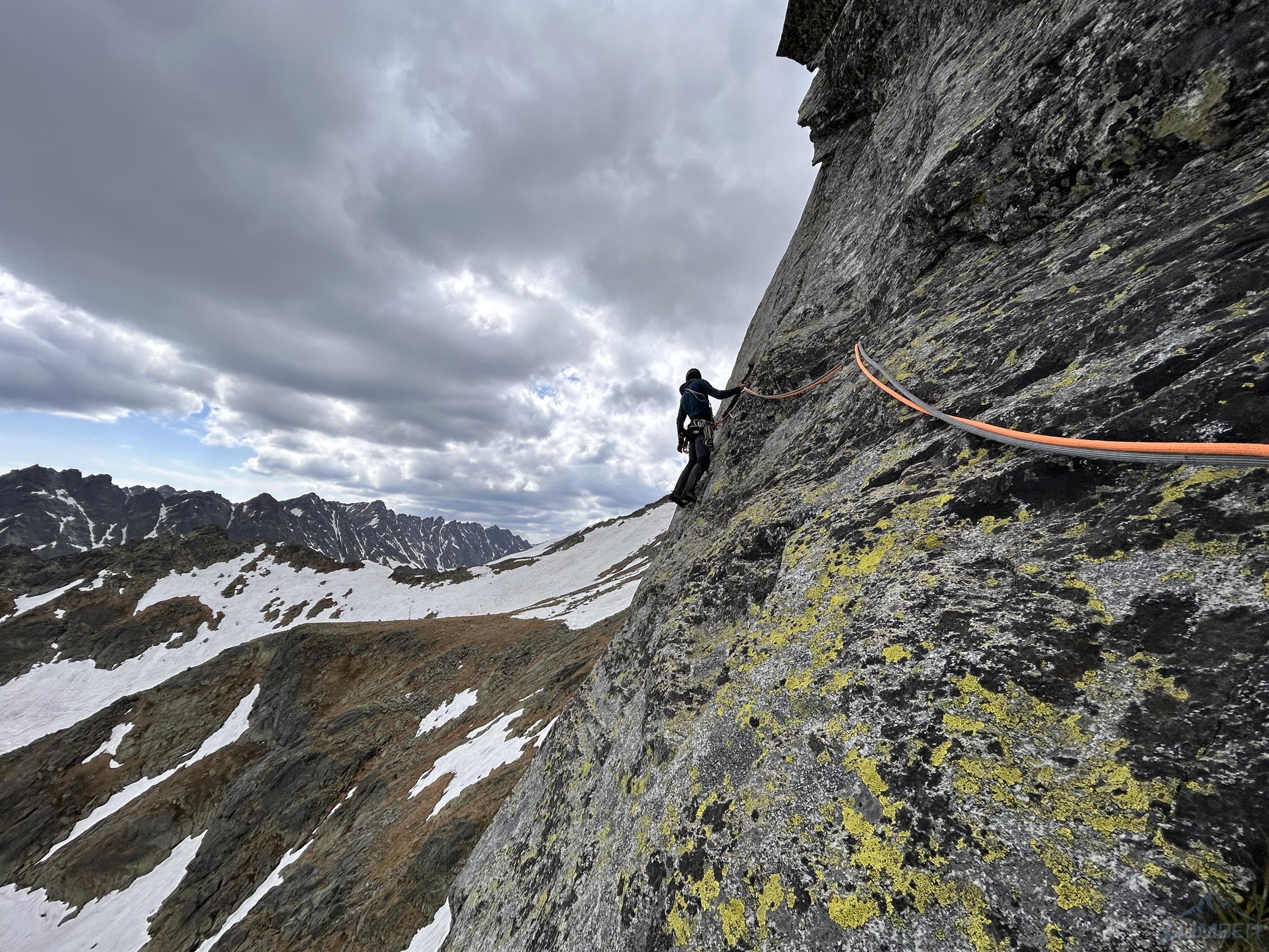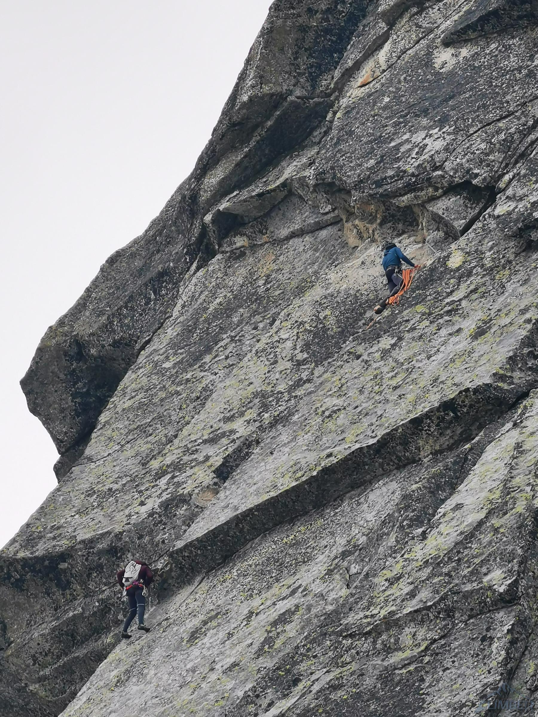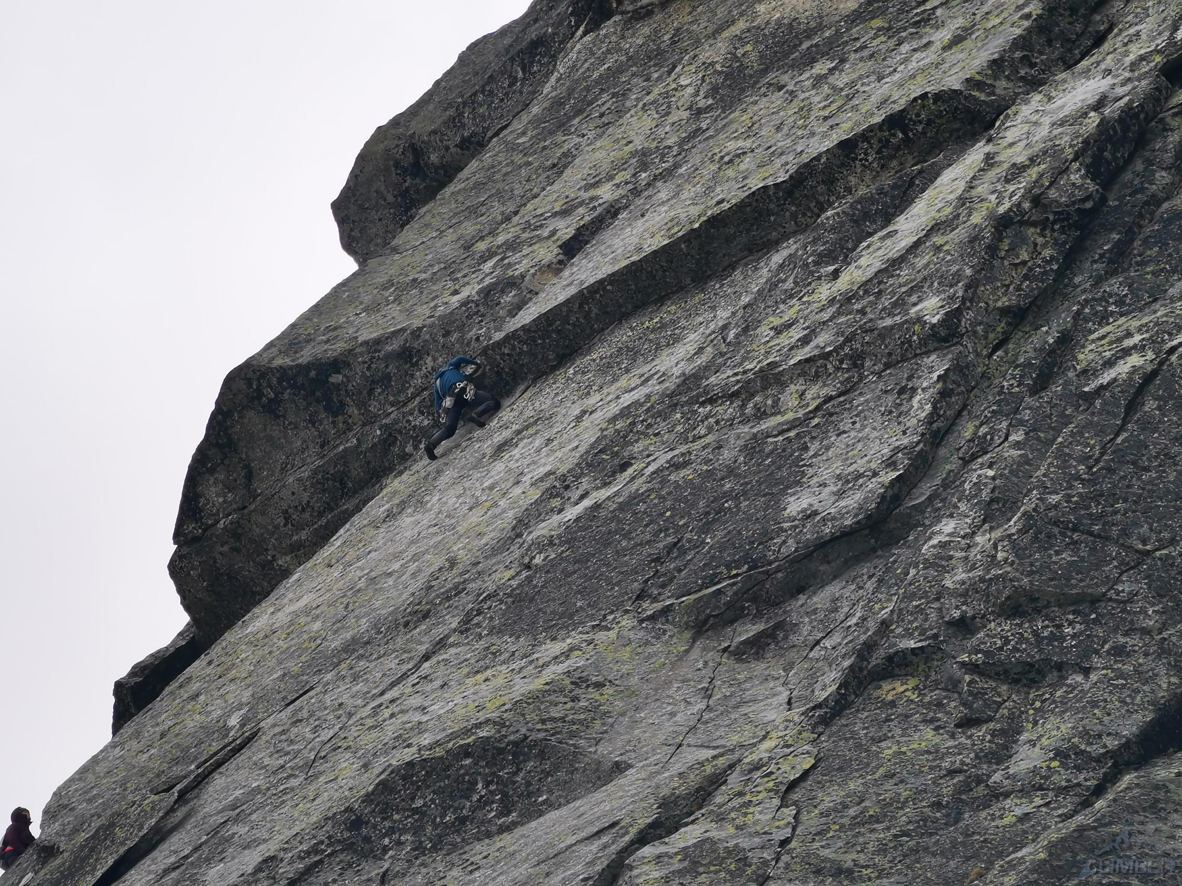 Po powrocie na ziemię mam spore wątpliwości czy wchodzić w Orolína (a właściwie Kývala-Orolín-Zeitler) – zimy wiatr i chmury dokuczają, jest już przed 14-tą, do tego obiecywałem Ani, że nie będę jej już zabierał na „trudne i straszne” dla niej rzeczy. A droga zgodnie z przewidywaniami okazuje się małym egzaminem z taternictwa – daje mi popalić na prowadzeniu, a partnerce stresujące asekurowanie i czyszczenie przelotów tak nadwyręża nerwy, że pod sam koniec prawie kończy się wycofem. Swoje zrobiły jednak zmęczenie, pogoda, brak młotka (polecam zabrać bo nieliczne już dobre haki wyciągałem czasem palcami!) i stresujące prowadzenie każdego wyciągu OS-em (hacząc i zakładając porządne przeloty byłoby dużo łatwiej). Także z odpowiednim podejściem i przygotowaniem nie ma co straszyć bo warto się wybrać 😊! Co do schematu, polecam MasterTopo ze świetnym zbliżeniem ściany SW, choć obejdzie się i z topo jakie narysowałem – od drugiego wyciągu droga jest bardzo ewidentna.