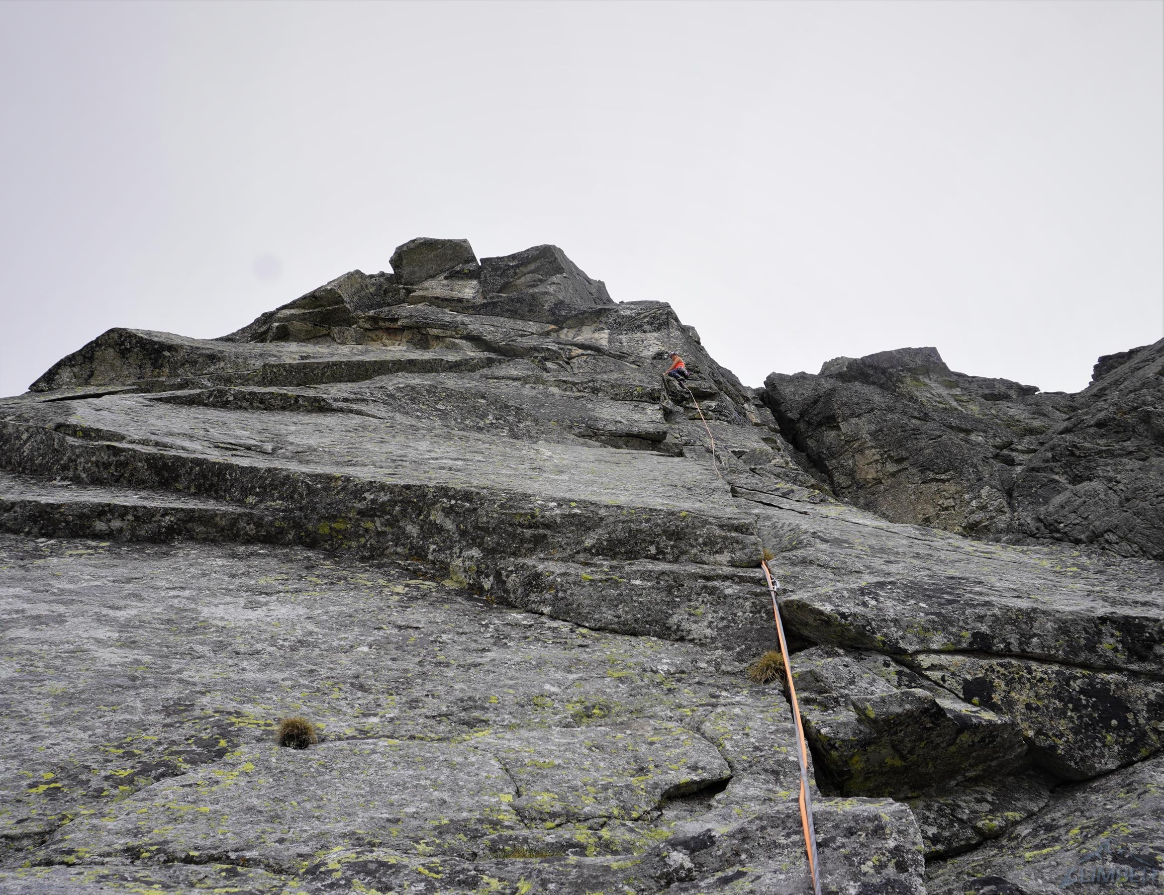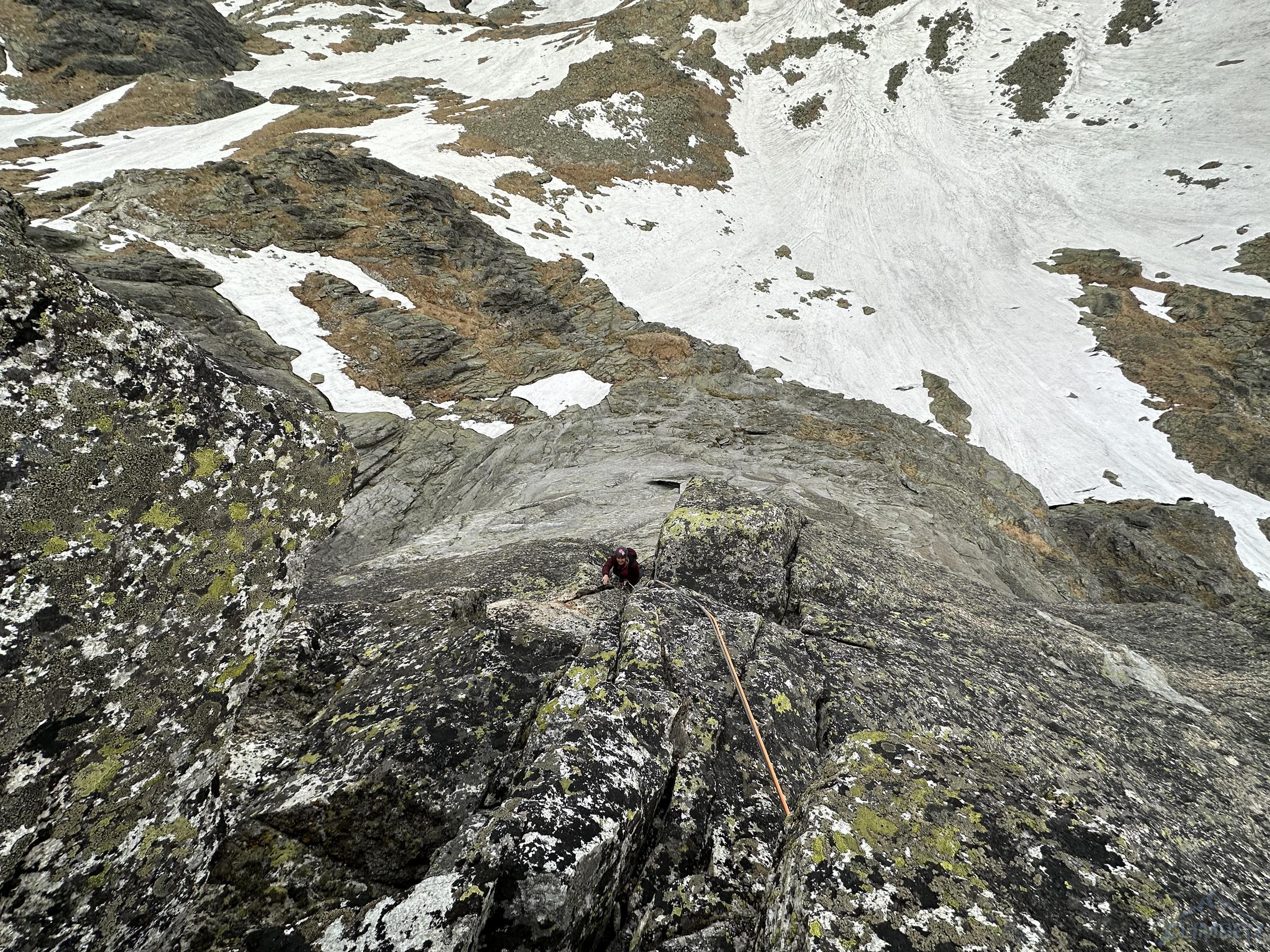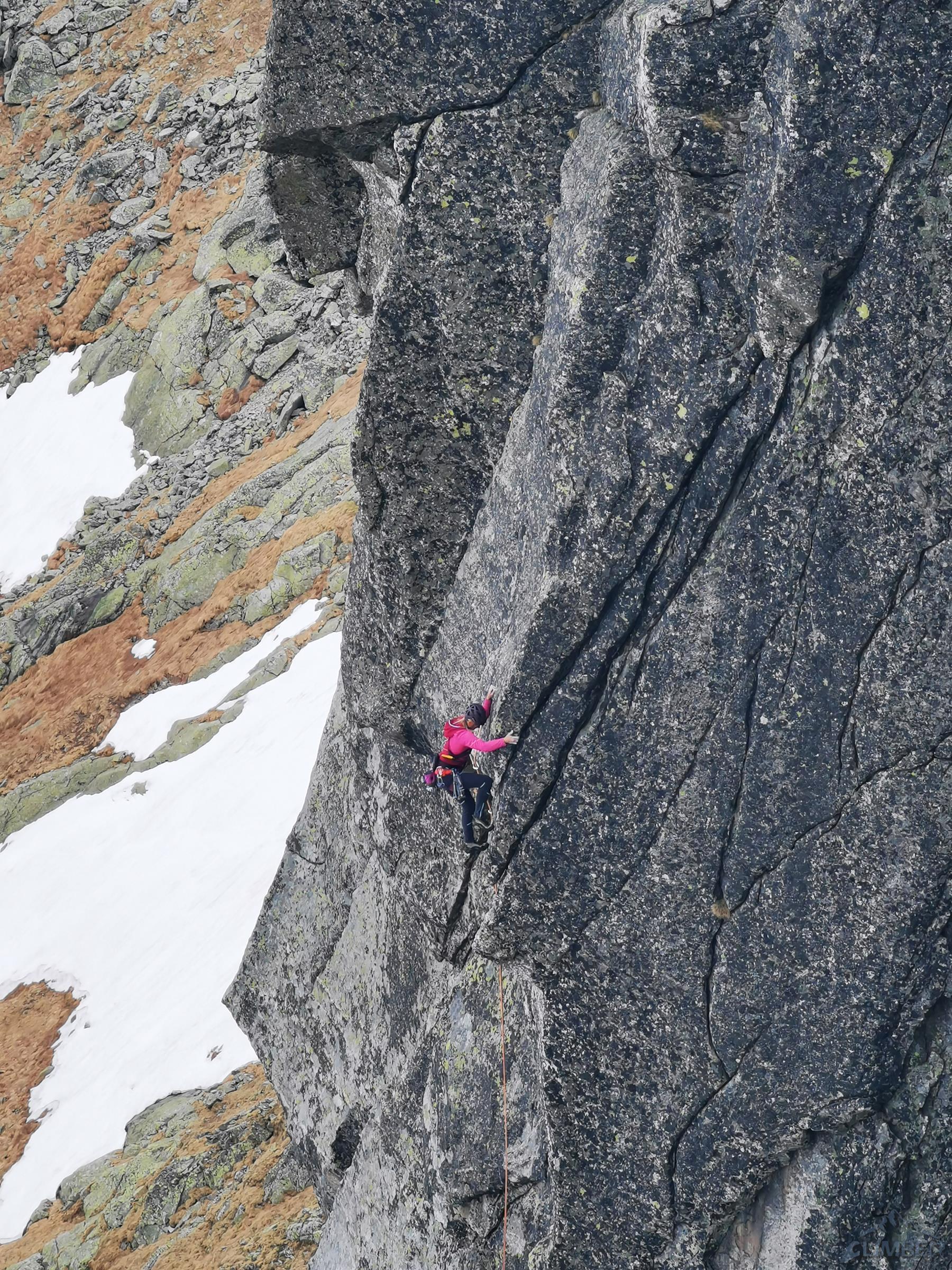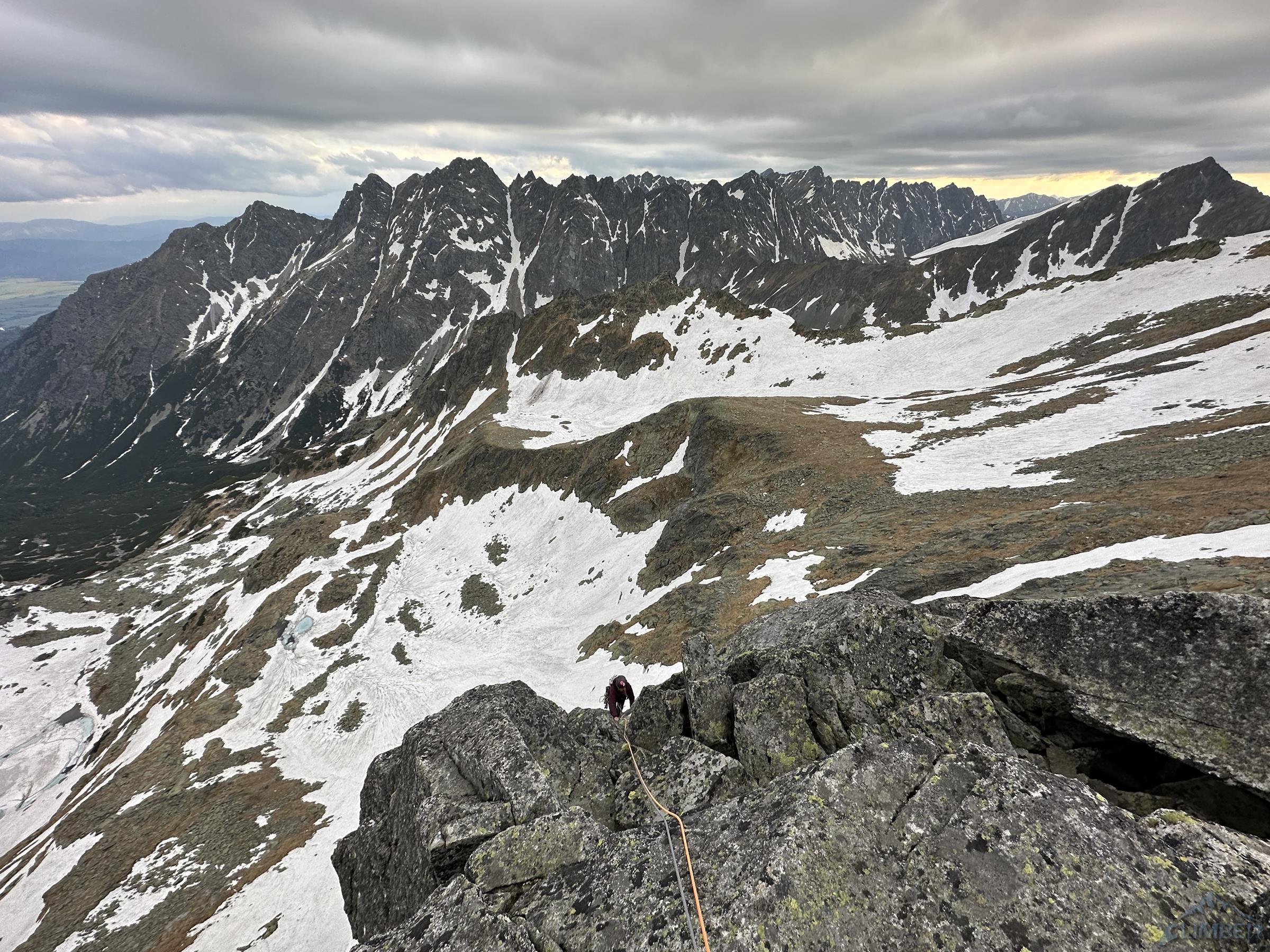 Po powrocie na ziemię mam spore wątpliwości czy wchodzić w Orolína (a właściwie Kývala-Orolín-Zeitler) – zimy wiatr i chmury dokuczają, jest już przed 14-tą, do tego obiecywałem Ani, że nie będę jej już zabierał na „trudne i straszne” dla niej rzeczy. A droga zgodnie z przewidywaniami okazuje się małym egzaminem z taternictwa – daje mi popalić na prowadzeniu, a partnerce stresujące asekurowanie i czyszczenie przelotów tak nadwyręża nerwy, że pod sam koniec prawie kończy się wycofem. Swoje zrobiły jednak zmęczenie, pogoda, brak młotka (polecam zabrać bo nieliczne już dobre haki wyciągałem czasem palcami!) i stresujące prowadzenie każdego wyciągu OS-em (hacząc i zakładając porządne przeloty byłoby dużo łatwiej). Także z odpowiednim podejściem i przygotowaniem nie ma co straszyć bo warto się wybrać 😊! Co do schematu, polecam MasterTopo ze świetnym zbliżeniem ściany SW, choć obejdzie się i z topo jakie narysowałem – od drugiego wyciągu droga jest bardzo ewidentna.