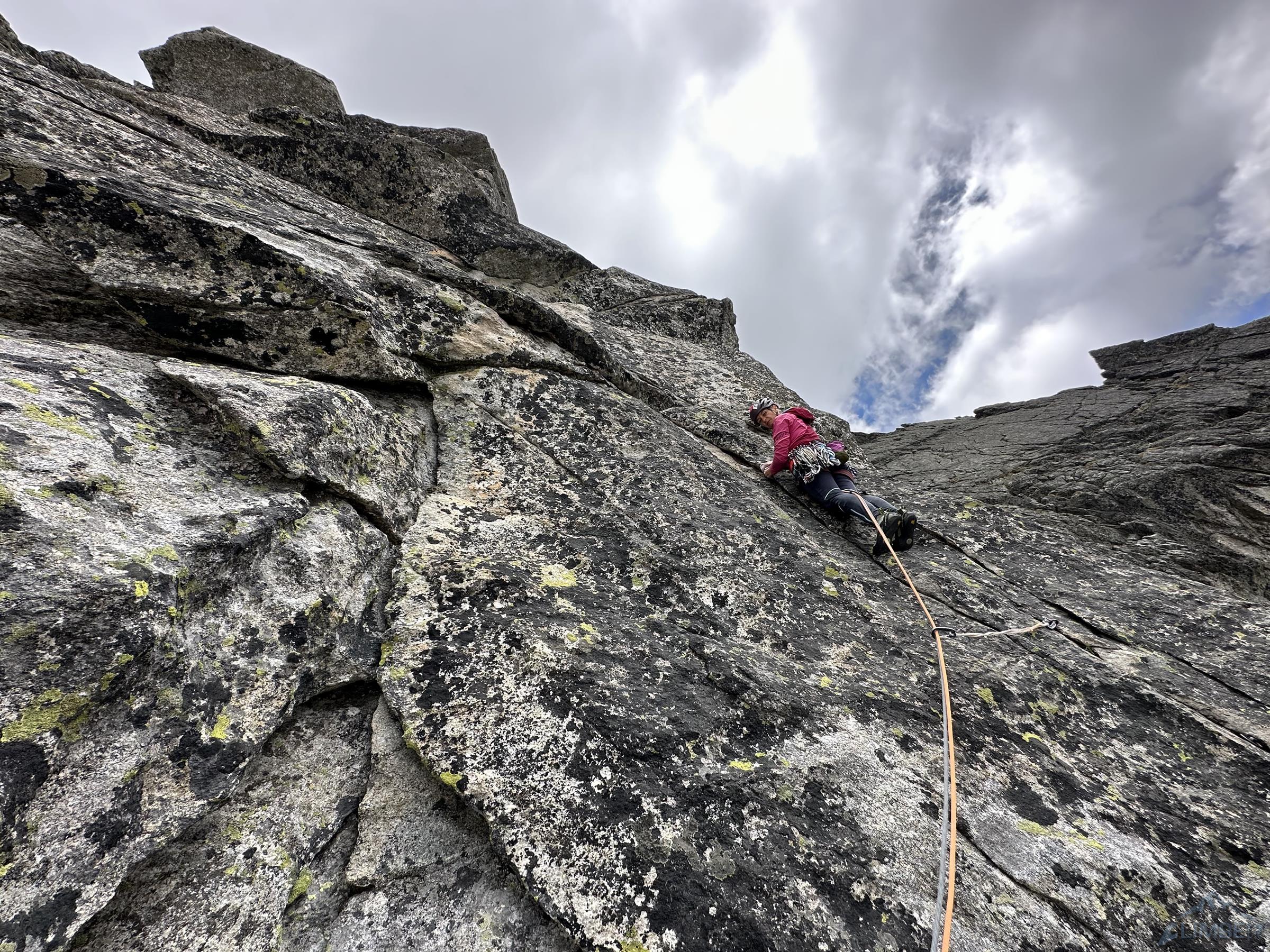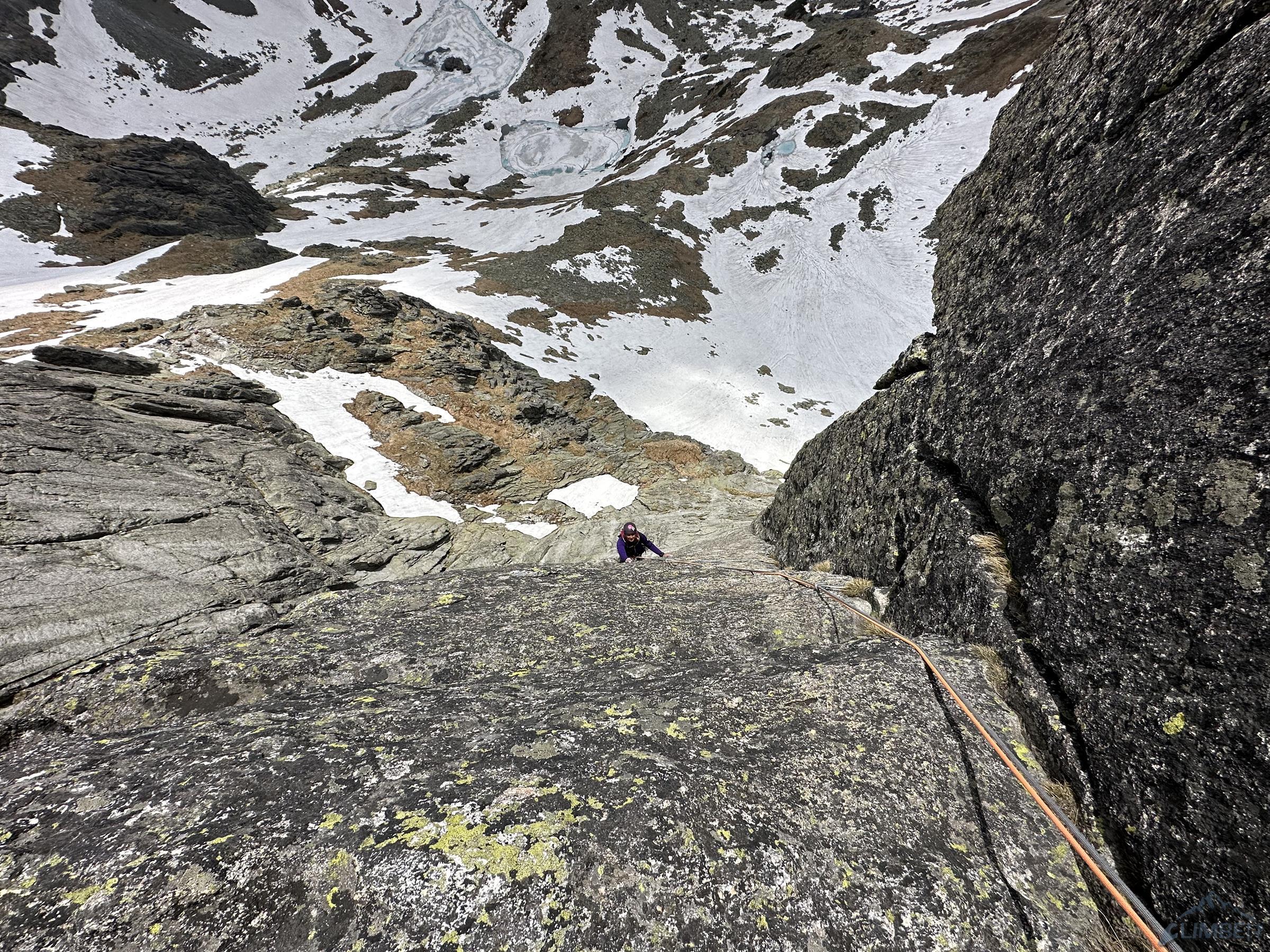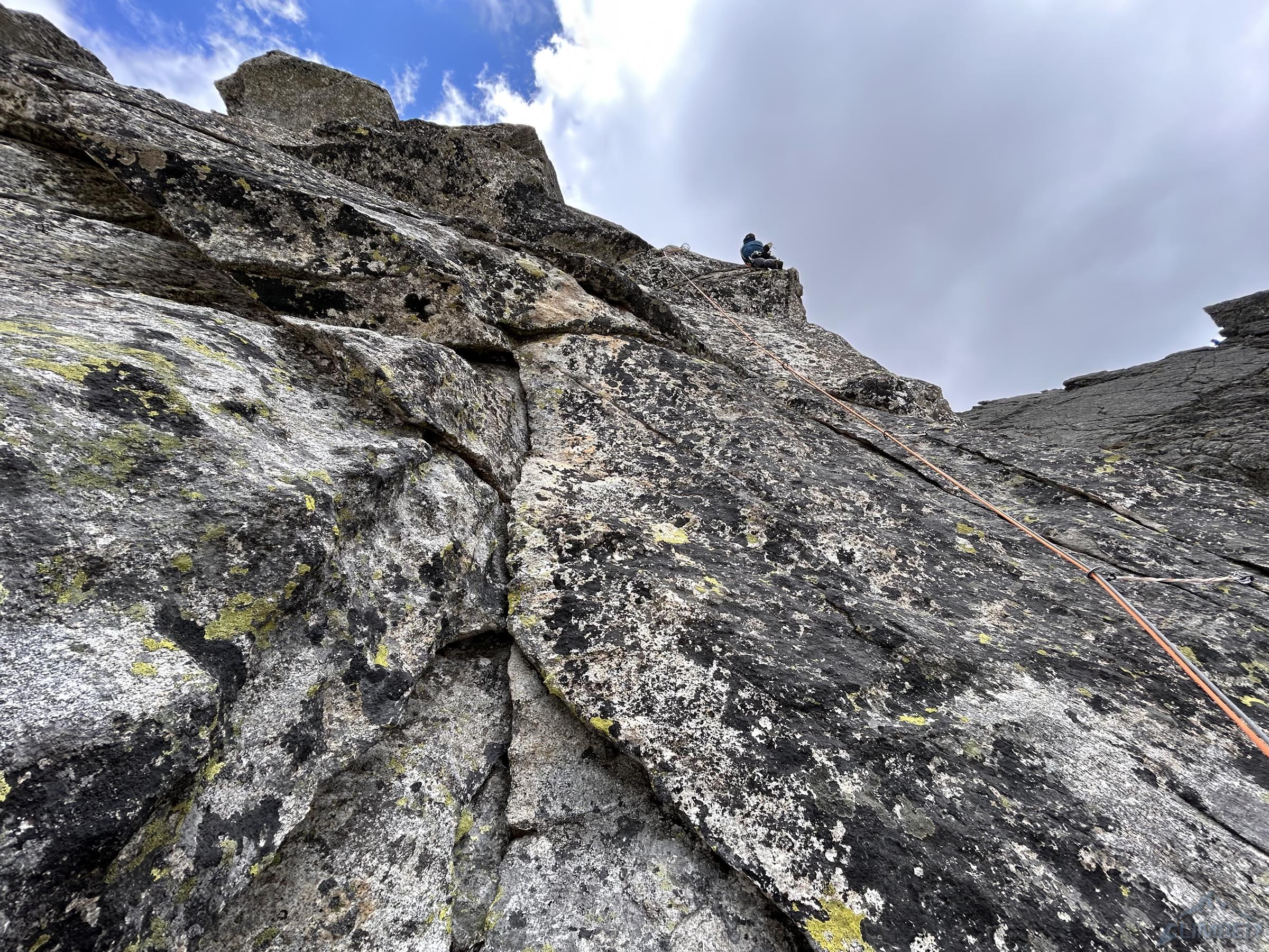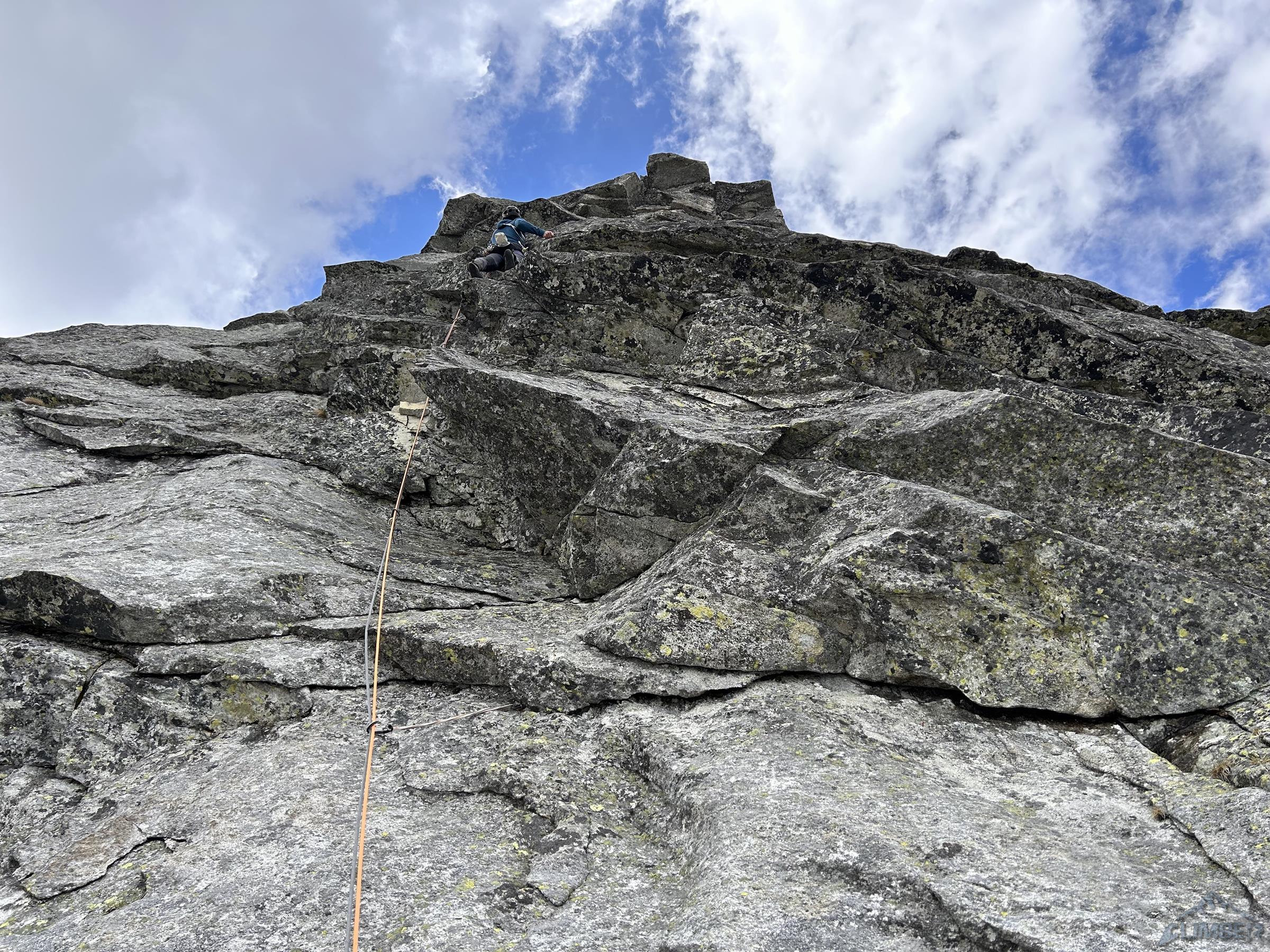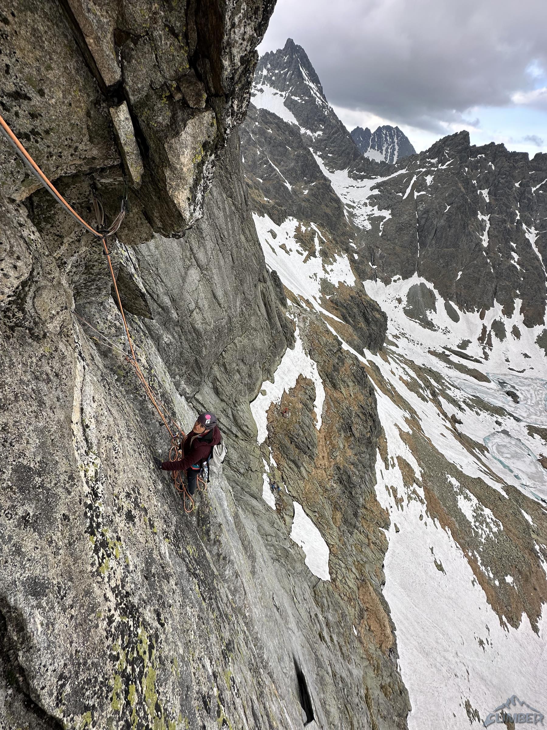 Po powrocie na ziemię mam spore wątpliwości czy wchodzić w Orolína (a właściwie Kývala-Orolín-Zeitler) – zimy wiatr i chmury dokuczają, jest już przed 14-tą, do tego obiecywałem Ani, że nie będę jej już zabierał na „trudne i straszne” dla niej rzeczy. A droga zgodnie z przewidywaniami okazuje się małym egzaminem z taternictwa – daje mi popalić na prowadzeniu, a partnerce stresujące asekurowanie i czyszczenie przelotów tak nadwyręża nerwy, że pod sam koniec prawie kończy się wycofem. Swoje zrobiły jednak zmęczenie, pogoda, brak młotka (polecam zabrać bo nieliczne już dobre haki wyciągałem czasem palcami!) i stresujące prowadzenie każdego wyciągu OS-em (hacząc i zakładając porządne przeloty byłoby dużo łatwiej). Także z odpowiednim podejściem i przygotowaniem nie ma co straszyć bo warto się wybrać 😊! Co do schematu, polecam MasterTopo ze świetnym zbliżeniem ściany SW, choć obejdzie się i z topo jakie narysowałem – od drugiego wyciągu droga jest bardzo ewidentna.