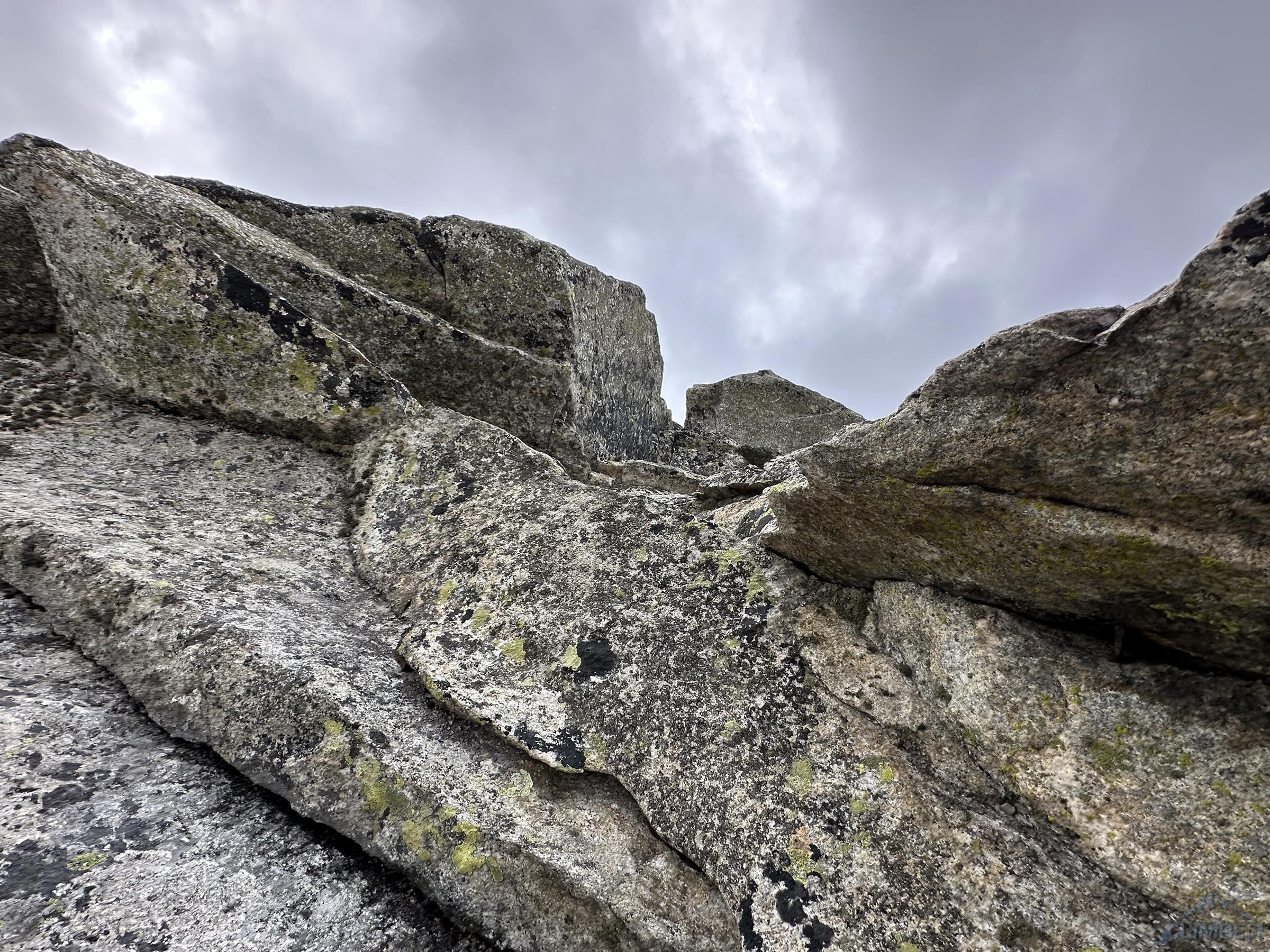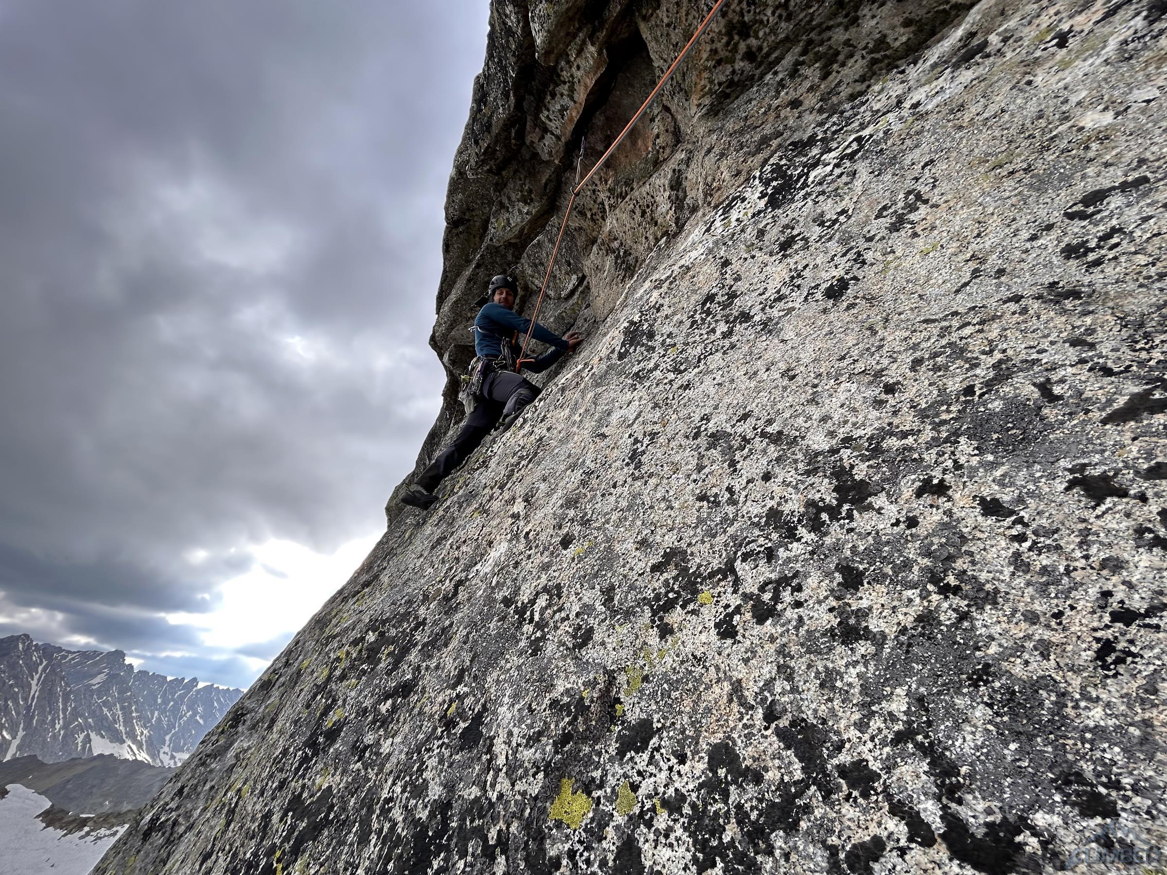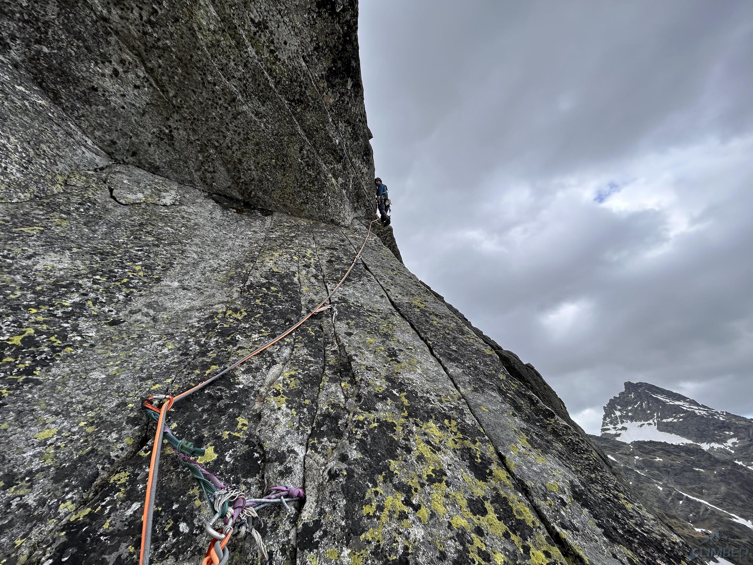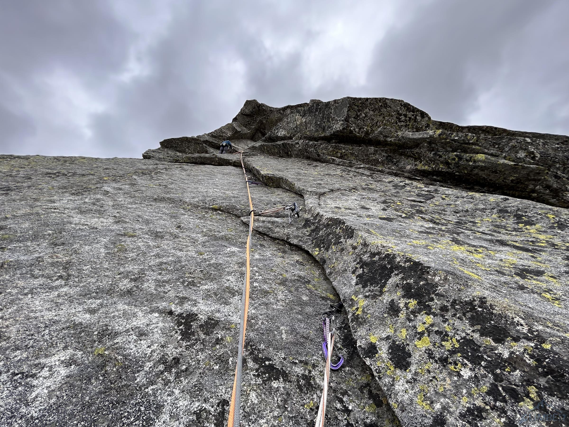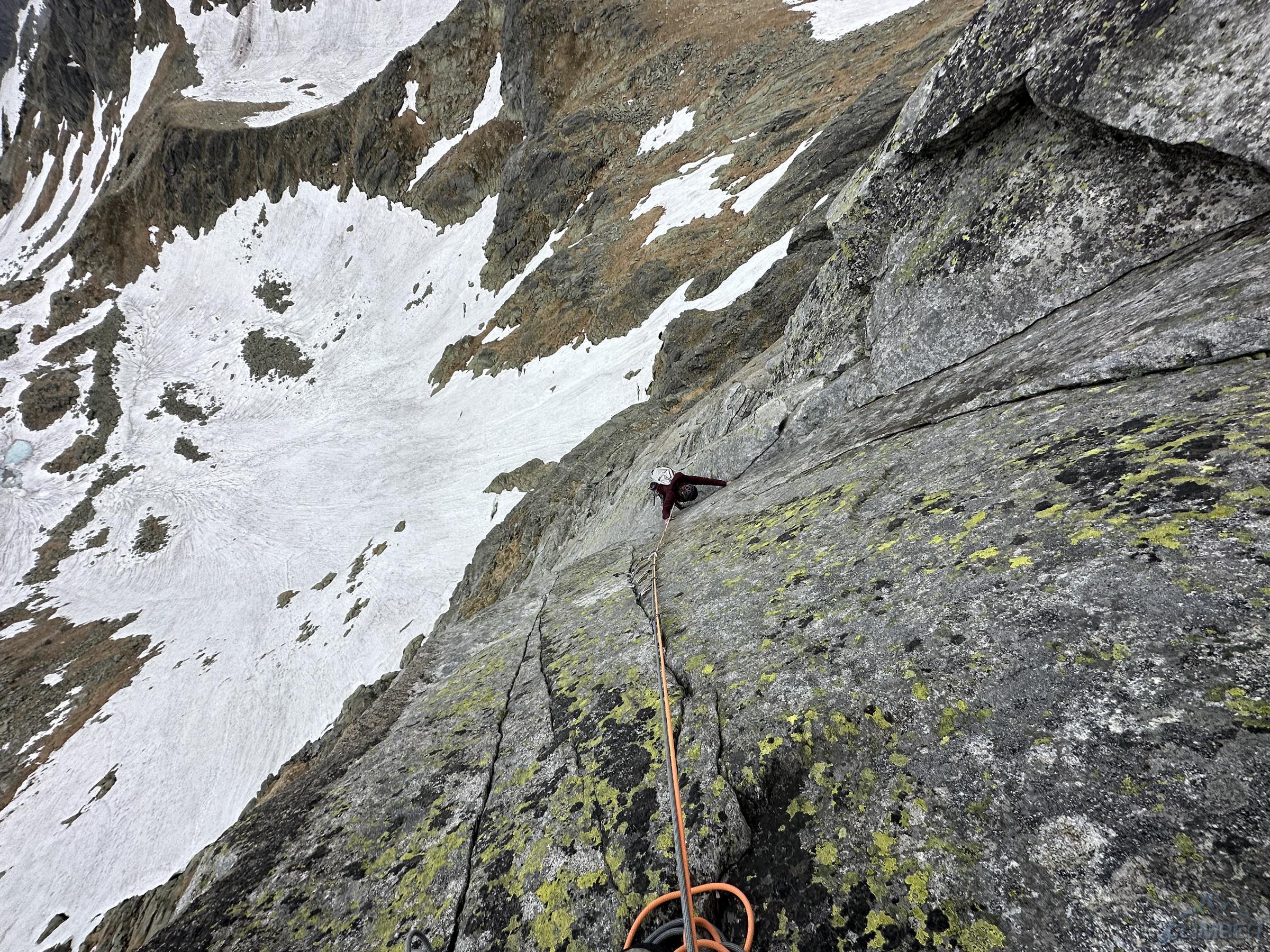 Po powrocie na ziemię mam spore wątpliwości czy wchodzić w Orolína (a właściwie Kývala-Orolín-Zeitler) – zimy wiatr i chmury dokuczają, jest już przed 14-tą, do tego obiecywałem Ani, że nie będę jej już zabierał na „trudne i straszne” dla niej rzeczy. A droga zgodnie z przewidywaniami okazuje się małym egzaminem z taternictwa – daje mi popalić na prowadzeniu, a partnerce stresujące asekurowanie i czyszczenie przelotów tak nadwyręża nerwy, że pod sam koniec prawie kończy się wycofem. Swoje zrobiły jednak zmęczenie, pogoda, brak młotka (polecam zabrać bo nieliczne już dobre haki wyciągałem czasem palcami!) i stresujące prowadzenie każdego wyciągu OS-em (hacząc i zakładając porządne przeloty byłoby dużo łatwiej). Także z odpowiednim podejściem i przygotowaniem nie ma co straszyć bo warto się wybrać 😊! Co do schematu, polecam MasterTopo ze świetnym zbliżeniem ściany SW, choć obejdzie się i z topo jakie narysowałem – od drugiego wyciągu droga jest bardzo ewidentna.