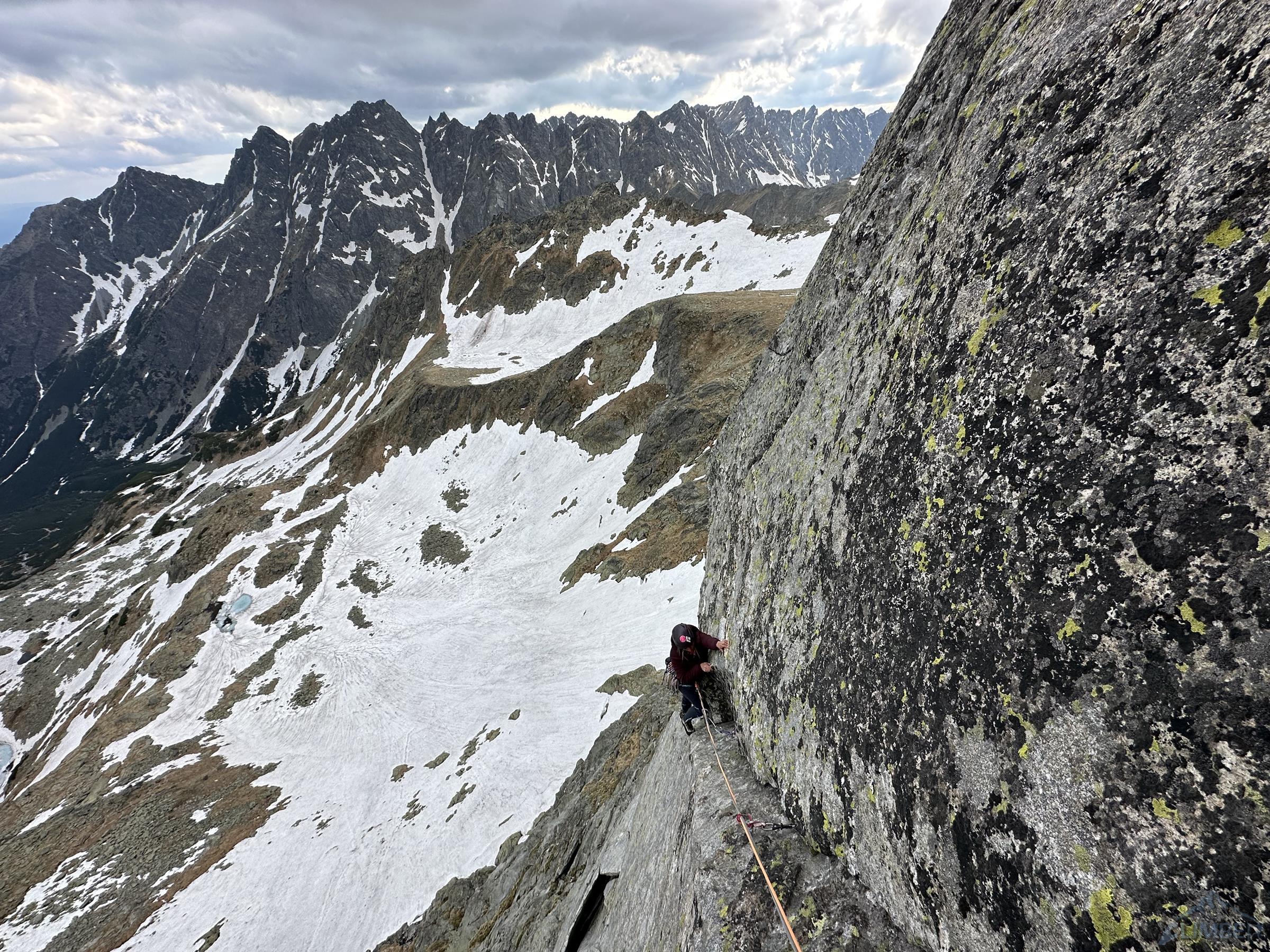 Kluczowy, trzeci odcinek (VI+/VII-) zaczyna się od ciekawej rysy, którą kierujemy się skośnie w lewo pod okap z hakami, gdzie czeka siłowy trawers po podchwytach na powietrzny stopień na kancie. Po wpięciu do spita pora na główne trudności drogi – wymagające wejście na dość gładką płytę. Ania sprawnie dociera do cruxa, nie daje niestety rady go rozpracować i zmieniam ją na prowadzeniu. O tym, że bulder nie jest banalny przypominam sobie po chwili gdy muszę go powtarzać (mimo iż kilka lat wcześniej udało poprowadzić się OS-em). Po trawersie do zacięcia po lewej pozostaje kilka łatwiejszych metrów do stanowiska. Ostatni wyciąg to już formalność – kontynuujemy komino-zacięciami (III) do zwieńczeniu filara i dalej do zjazdów Kominem Puškáša. Spiesząc się, ze stanowiska po trudnościach można też szybko zjechać do ziemi – linią drogi lub przez stanowisko z Medzi Legendami lub Hviezdovej.