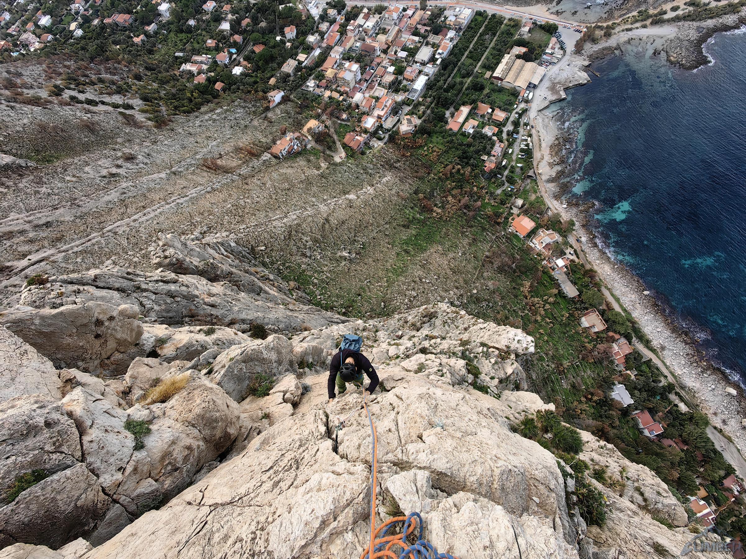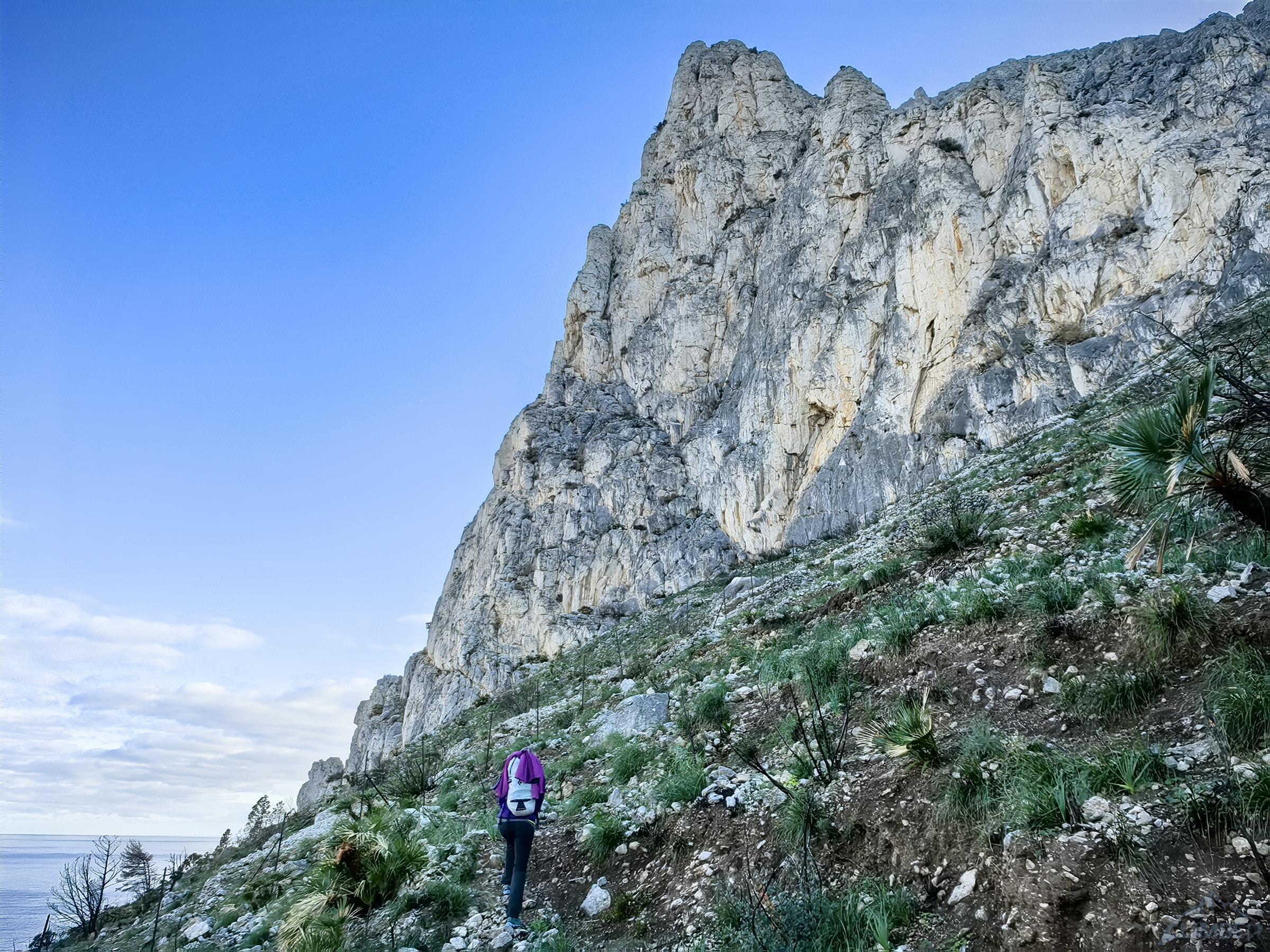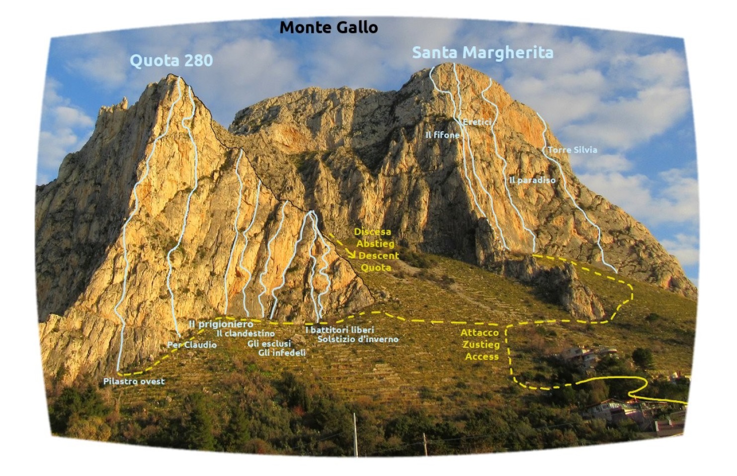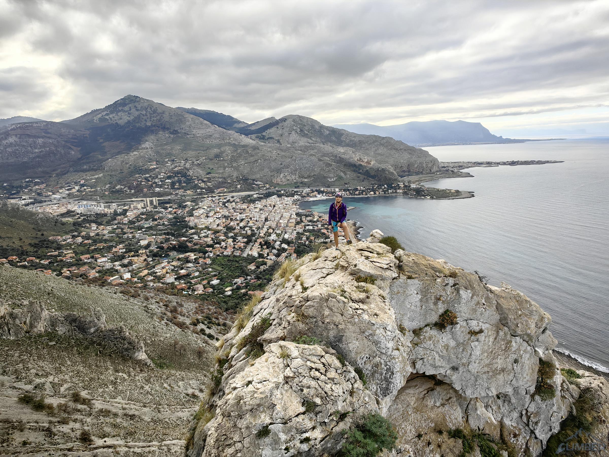 Północno-zachodni mur Monte Gallo ciągnie się od miasteczka Sferracavallo przez ponad dwa kilometry, na południowy wschód opada zaś niepozornymi wzgórzami. Masyw obejmuje kilka szczytów i turni – Quota 280 i Santa Margherita są dobrze opisane w nowym przewodniku i na stronie z jego skróconą wersją, TUTAJ. Drogi na pozostałych trzeba póki co wyszukiwać osobno, niektóre z nich wymienione są wśród sektorów opisanych TUTAJ. My póki co odwiedzamy dwie wspomniane ściany oraz Pizzo Sella – w sumie przechodzimy cztery lokalne klasyki. Na dwóch trudniejszych finalnie okazuje się, że muszę poprowadzić wszystkie wyciągi, Ani przypadają więc w całości dwie przystępniejsze drogi.