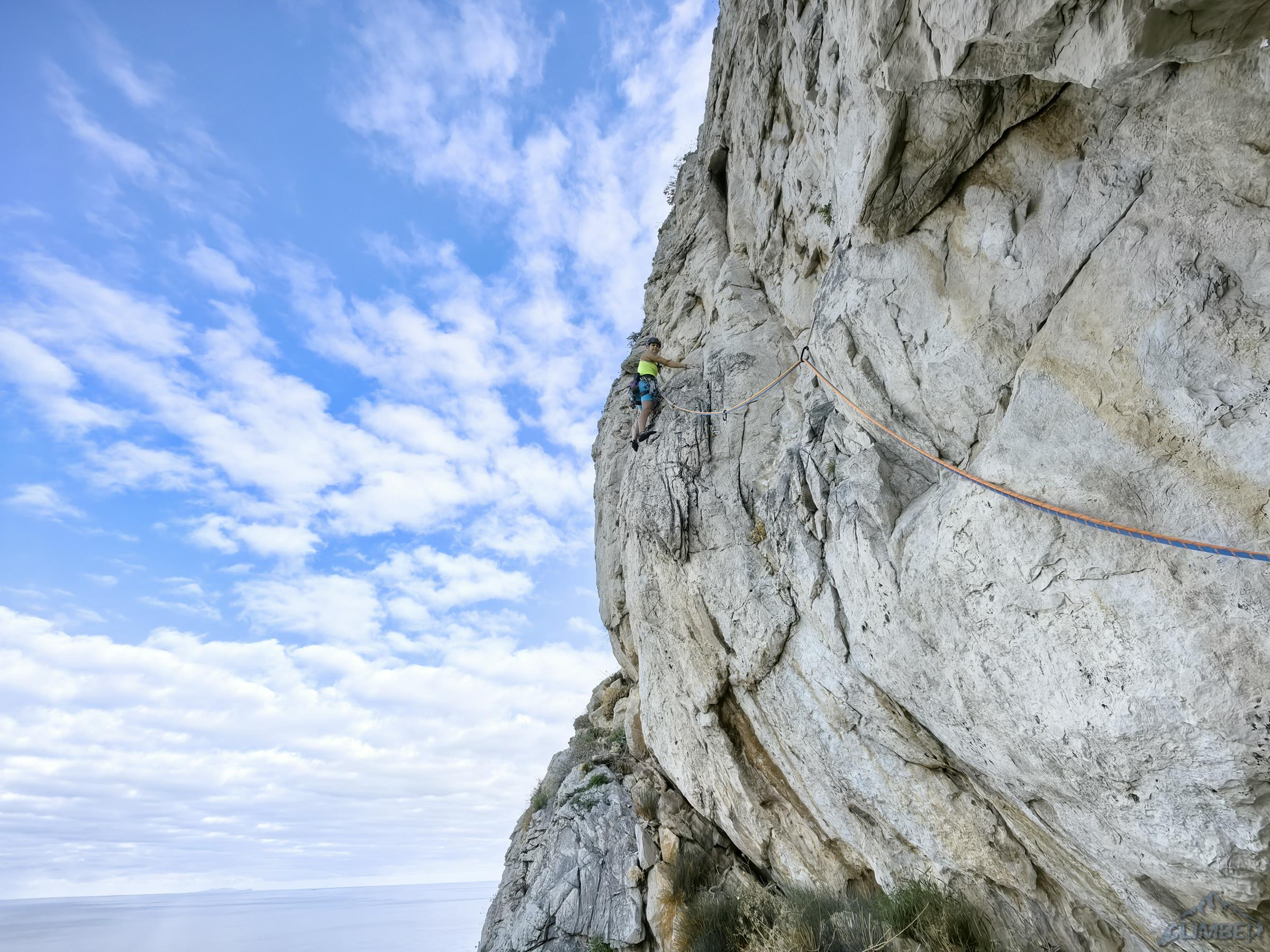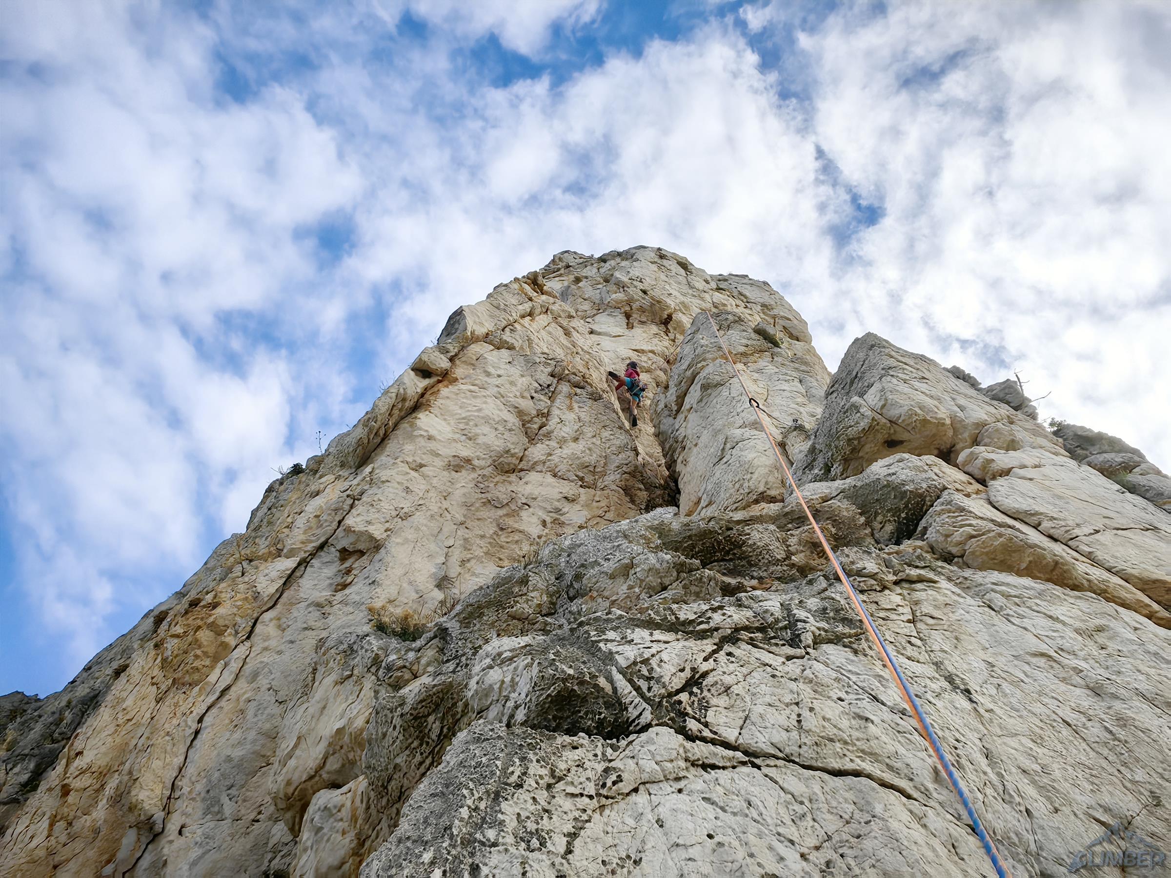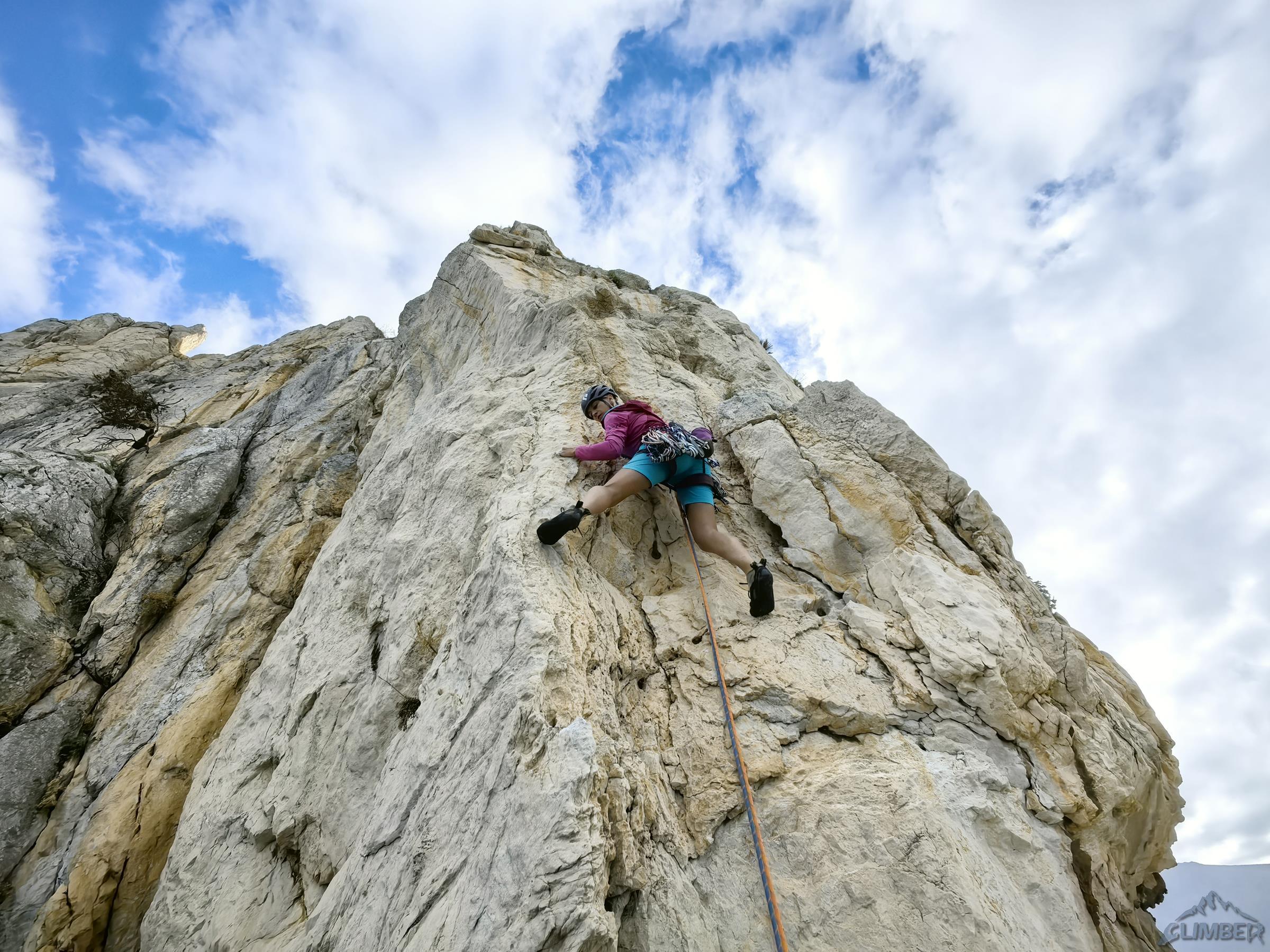 Zaczynamy od najdłuższej linii na położonej najbliżej miasteczka turni Quota 280, poprowadzonej jej zachodnim filarem. Via Pilastro Ovest (VII-/VII, 10 wyc.) to ładna i różnorodna drogą o głównie piątkowo-szóstkowych trudnościach z kilkoma siódemkowymi odcinkami, Ania mocniej walczy tylko na dwóch z nich i całość kończy OS-em. Poza pojedynczymi ringami na stanowiskach na całej długości są tylko dwa spity oraz kilka haków/pętli, konieczne jest więc osadzanie własnej asekuracji – przydaje się właściwie cały zestaw od #0.2 do #2 i kości (lub lepiej tricamy). Schemat jest bardzo szczegółowy – podane są nie tylko trudności poszczególnych odcinków, ale i długości wyciągów oraz stały sprzęt jaki na nich znajdziemy. Nie da się więc ani zaskoczyć ani zgubić 😊.