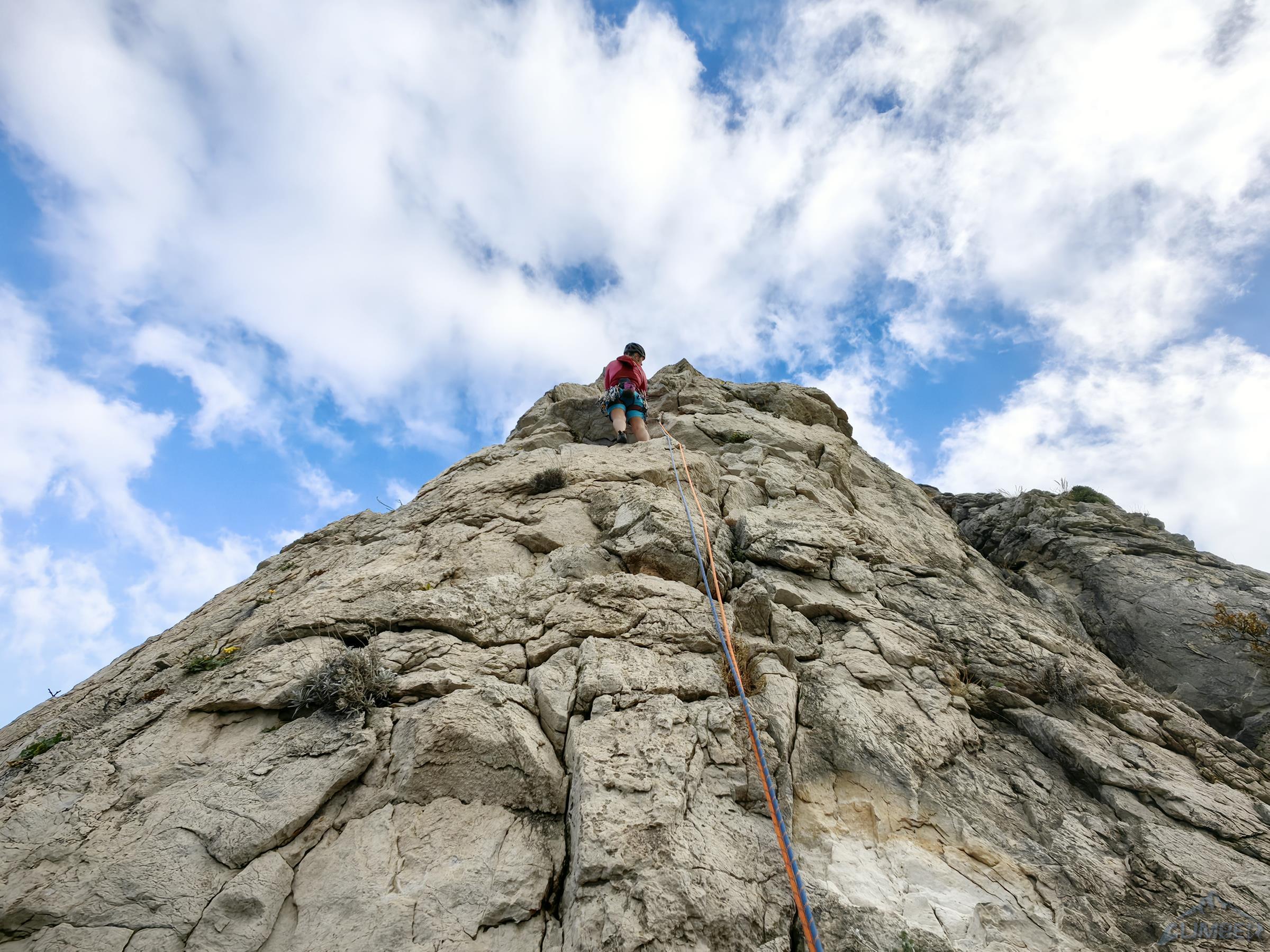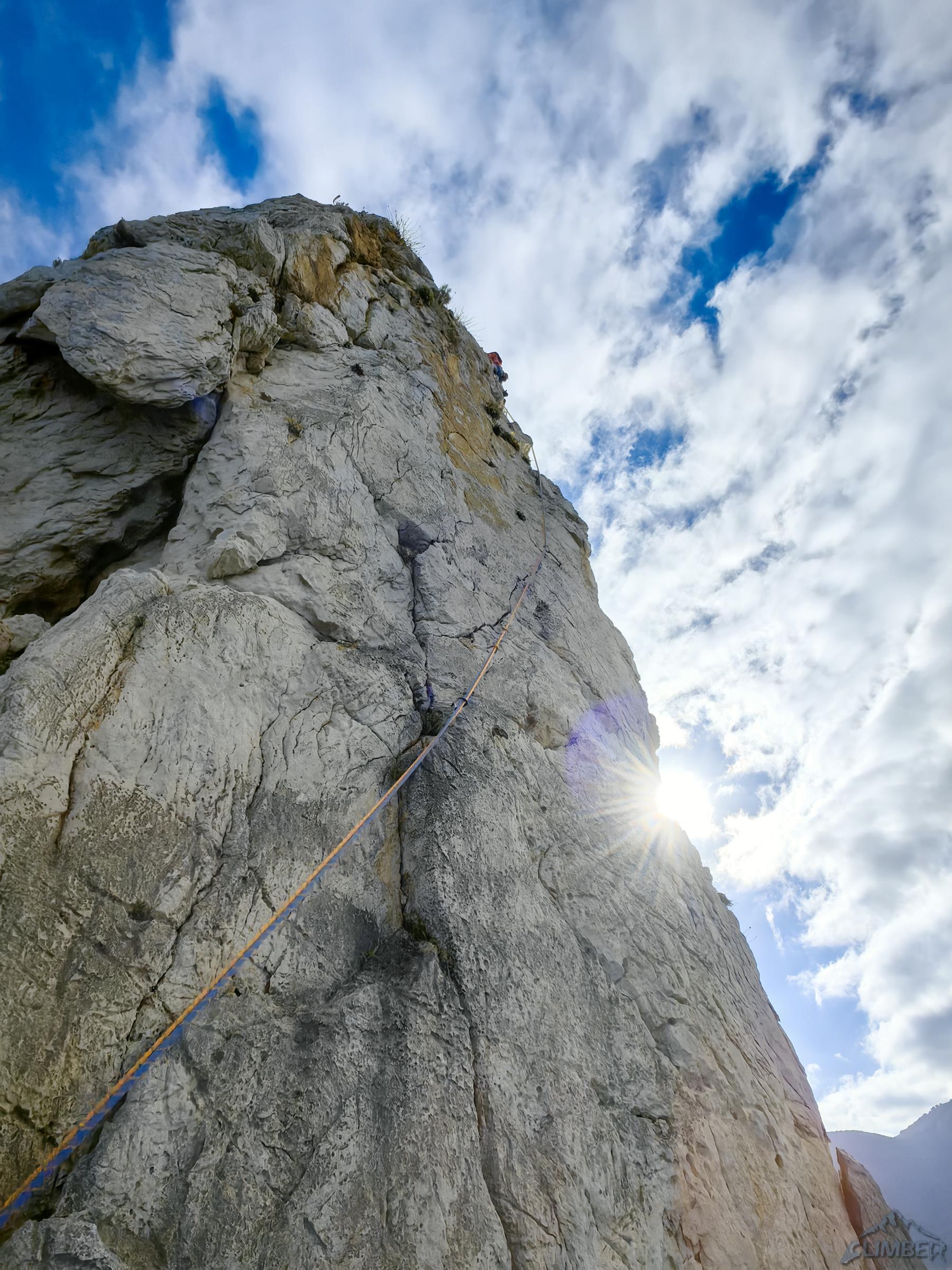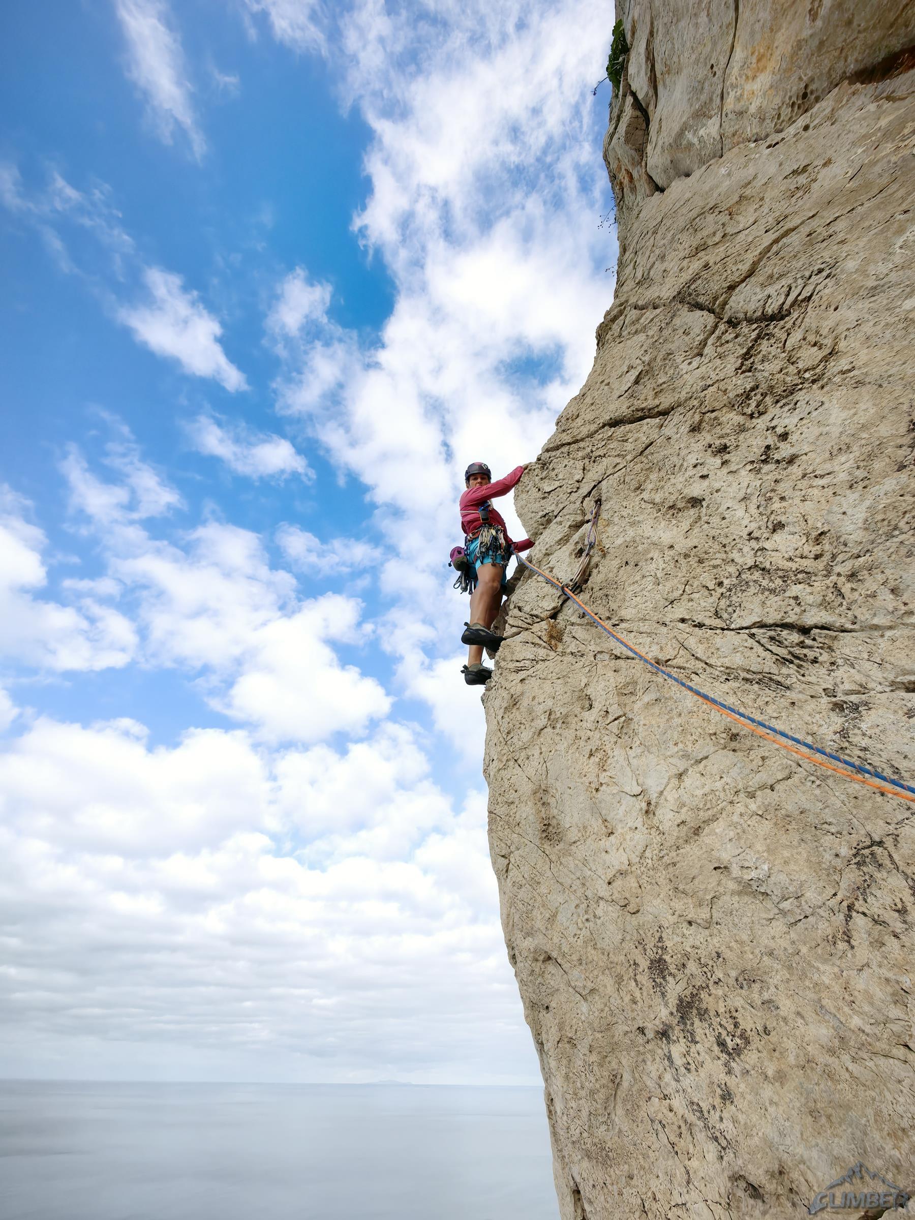 Zaczynamy od najdłuższej linii na położonej najbliżej miasteczka turni Quota 280, poprowadzonej jej zachodnim filarem. Via Pilastro Ovest (VII-/VII, 10 wyc.) to ładna i różnorodna drogą o głównie piątkowo-szóstkowych trudnościach z kilkoma siódemkowymi odcinkami, Ania mocniej walczy tylko na dwóch z nich i całość kończy OS-em. Poza pojedynczymi ringami na stanowiskach na całej długości są tylko dwa spity oraz kilka haków/pętli, konieczne jest więc osadzanie własnej asekuracji – przydaje się właściwie cały zestaw od #0.2 do #2 i kości (lub lepiej tricamy). Schemat jest bardzo szczegółowy – podane są nie tylko trudności poszczególnych odcinków, ale i długości wyciągów oraz stały sprzęt jaki na nich znajdziemy. Nie da się więc ani zaskoczyć ani zgubić 😊.