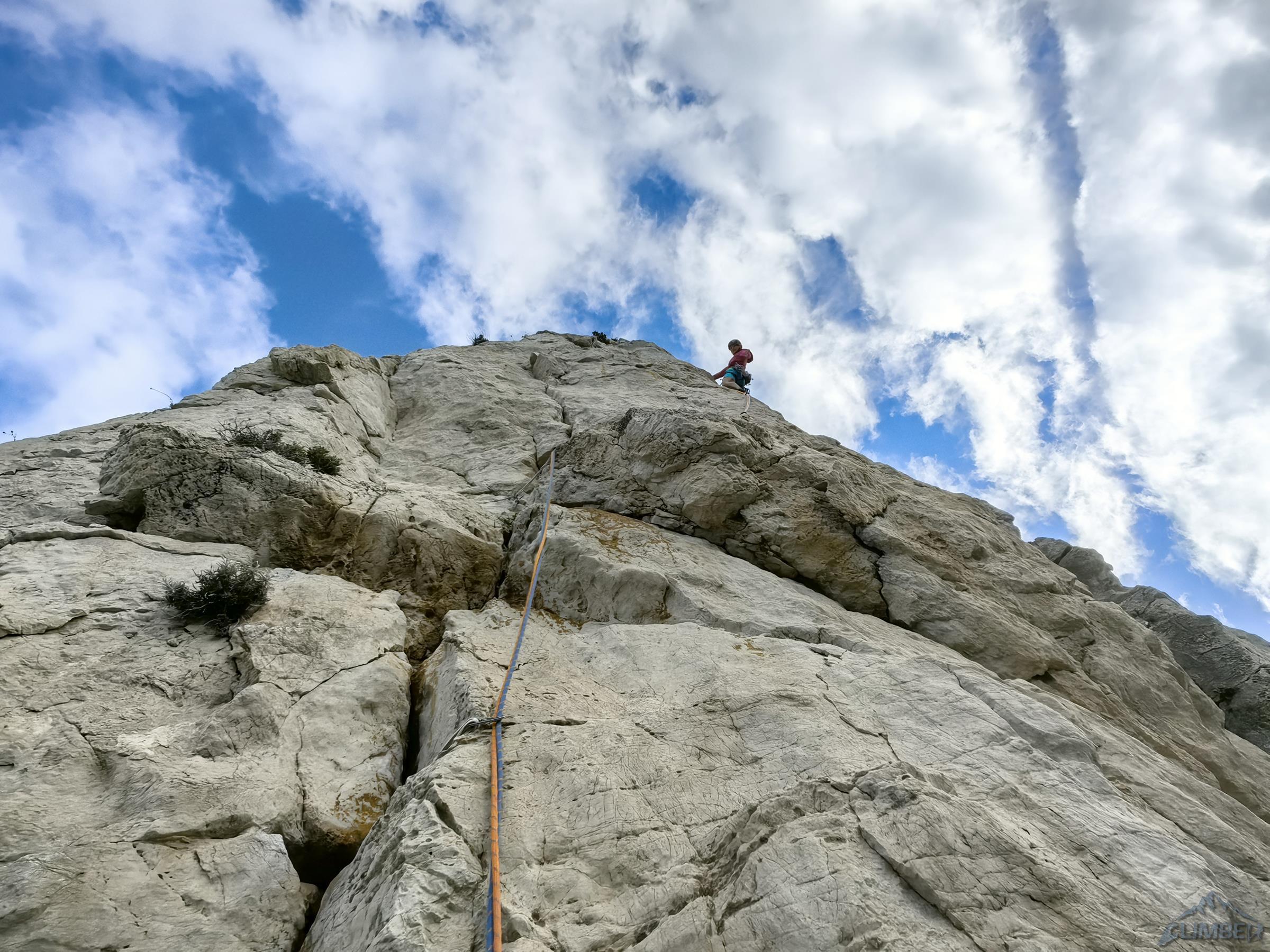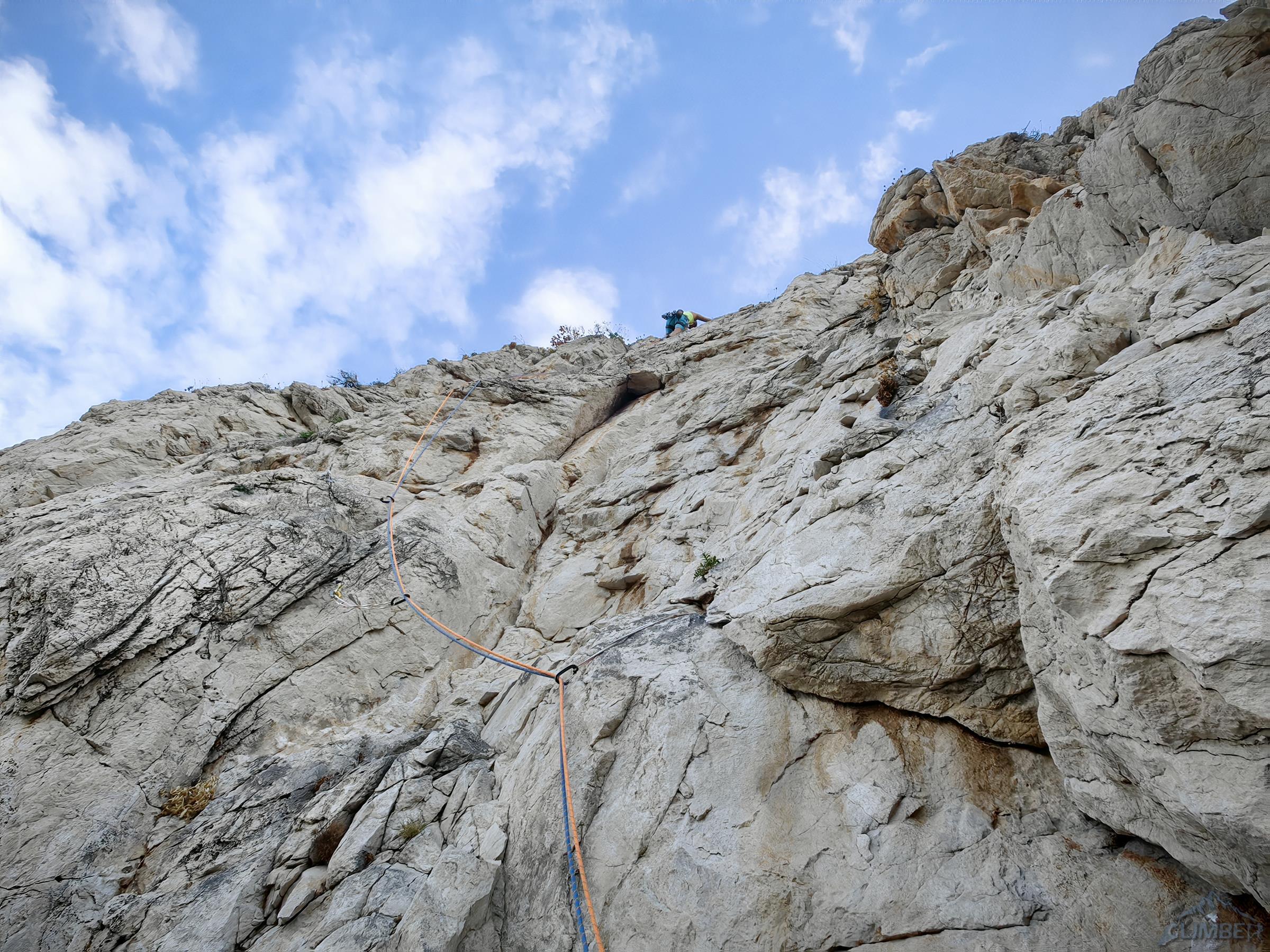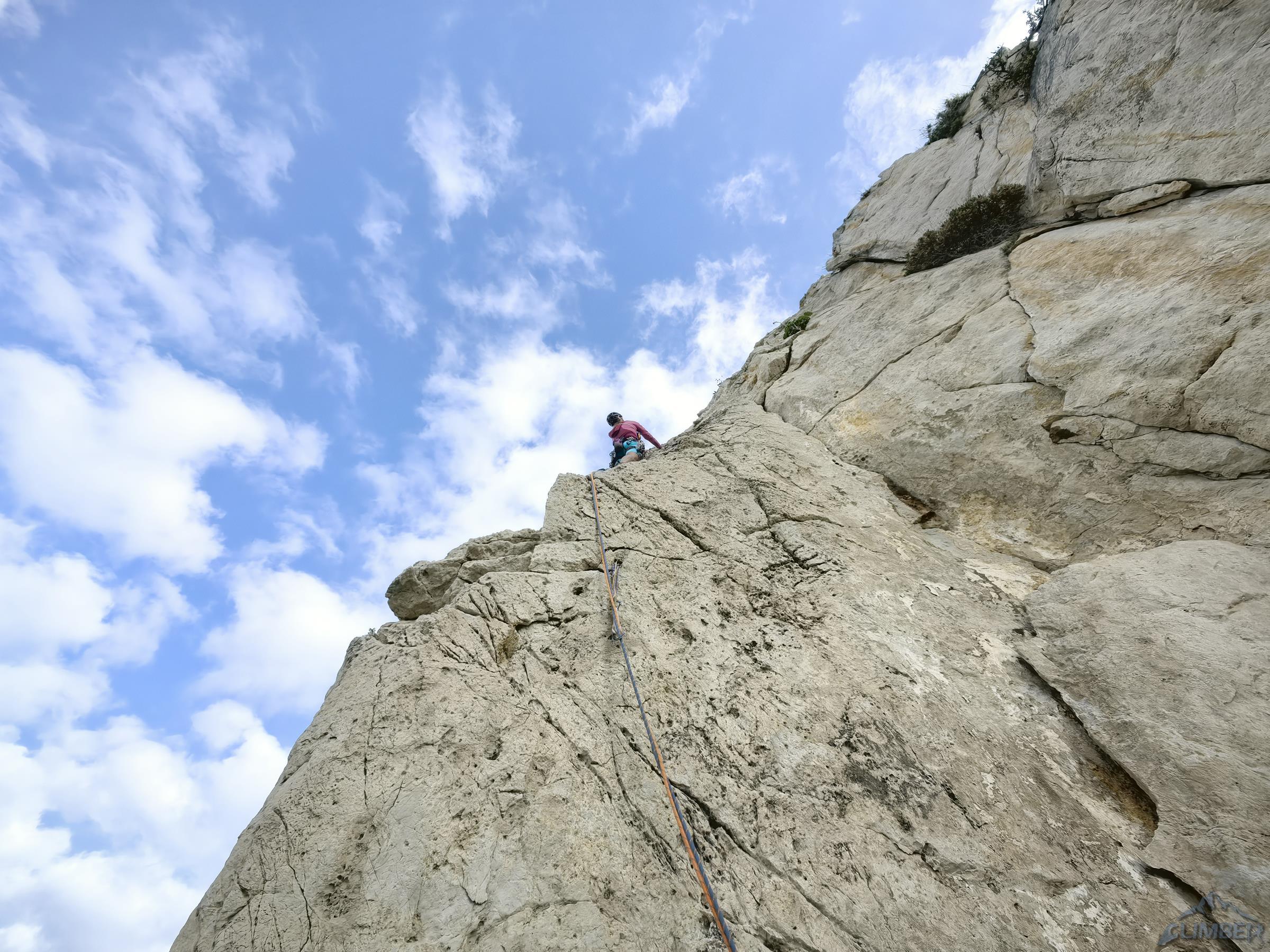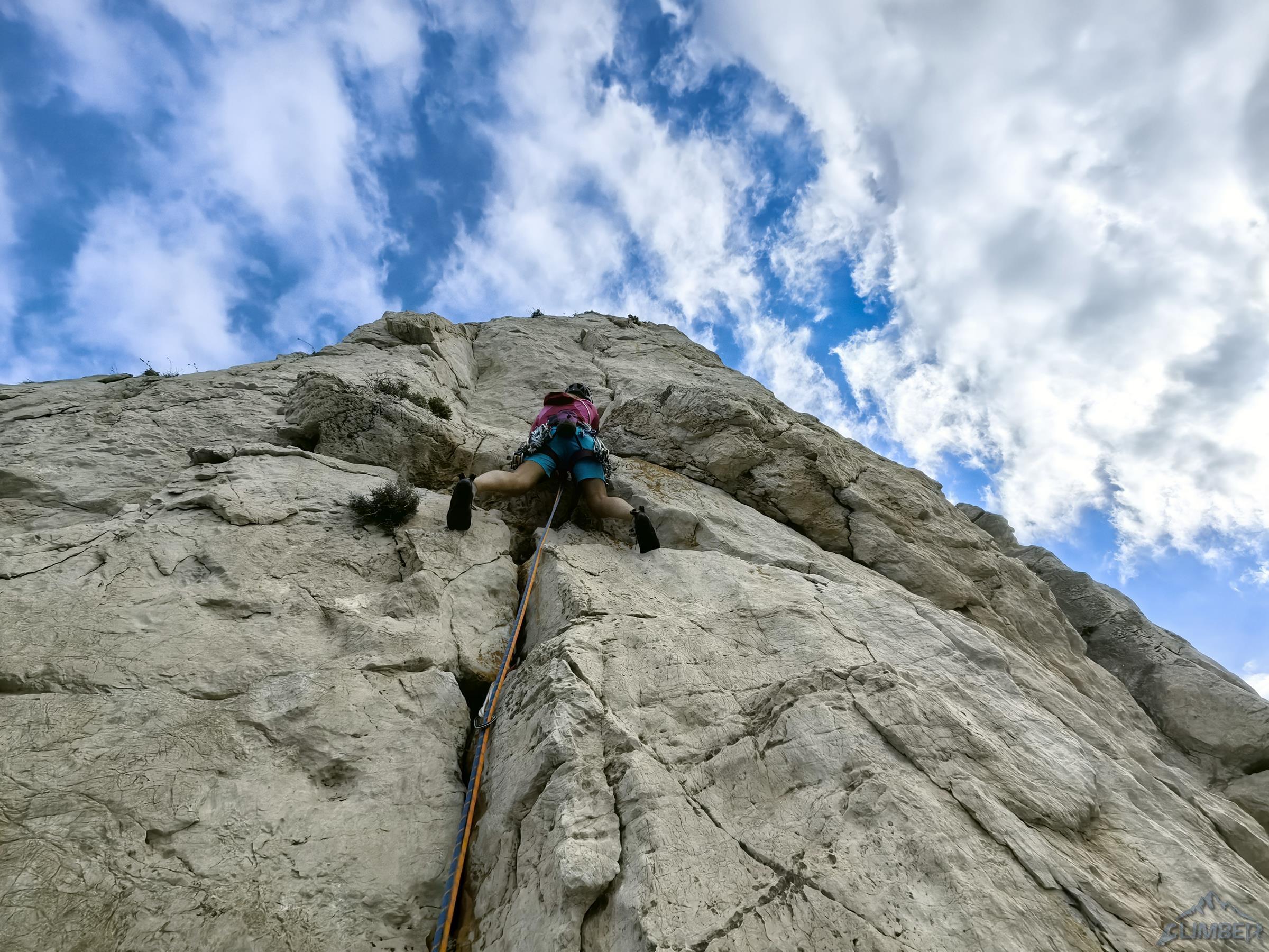 Zaczynamy od wspinania ładną szarą płytą (V-) i docieramy do stanowiska na półce. Na starcie drugiego wyciągu czeka jedno z najbardziej wymagających miejsc na drodze – bulderowe wyjście do rysy (VII-), Ania długo szuka odpowiedniego ustawienia ale w końcu odważnie pokonuje kilka przechwytów. Dalej robi się już łatwiej - trawersujemy mocno w lewo i kontynuujemy filarkiem (VI-) do kolejnej półki. Trzeci wyciąg to przyjemny pasaż dobrze urzeźbionym zacięciem w lewo (V+) oraz nieco kąśliwy krótki kominek na końcu (VI). Czwarty odcinek zaczyna się efektownym wyjściem płytą na kant (VII-), wyżej kontynuujemy już łatwym terenem (IV) aż za trawiasty taras. Na piątym wyciągu idziemy pod małą turnicę (VI-), którą omijamy z prawej strony i odbijamy zacięciem w lewo (V+) na kant filara.