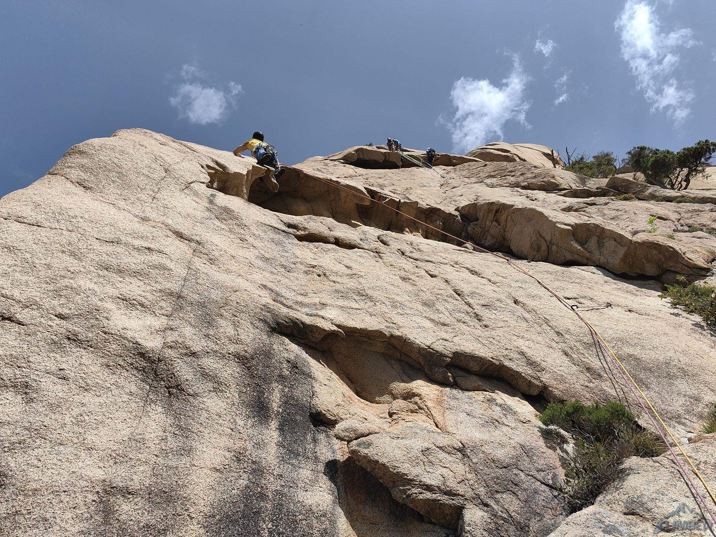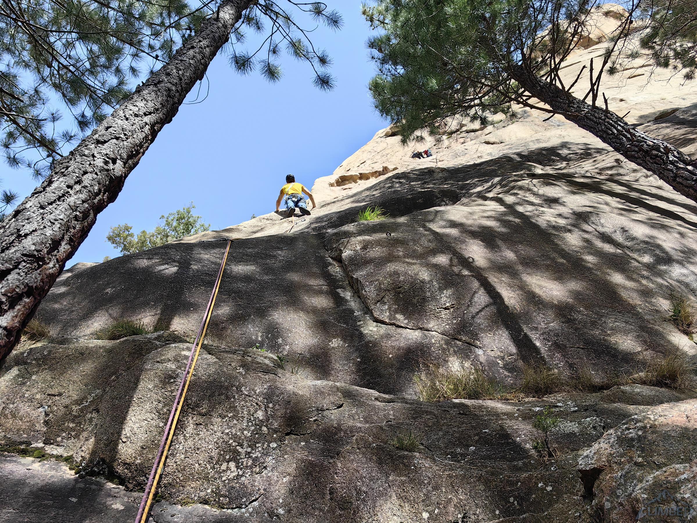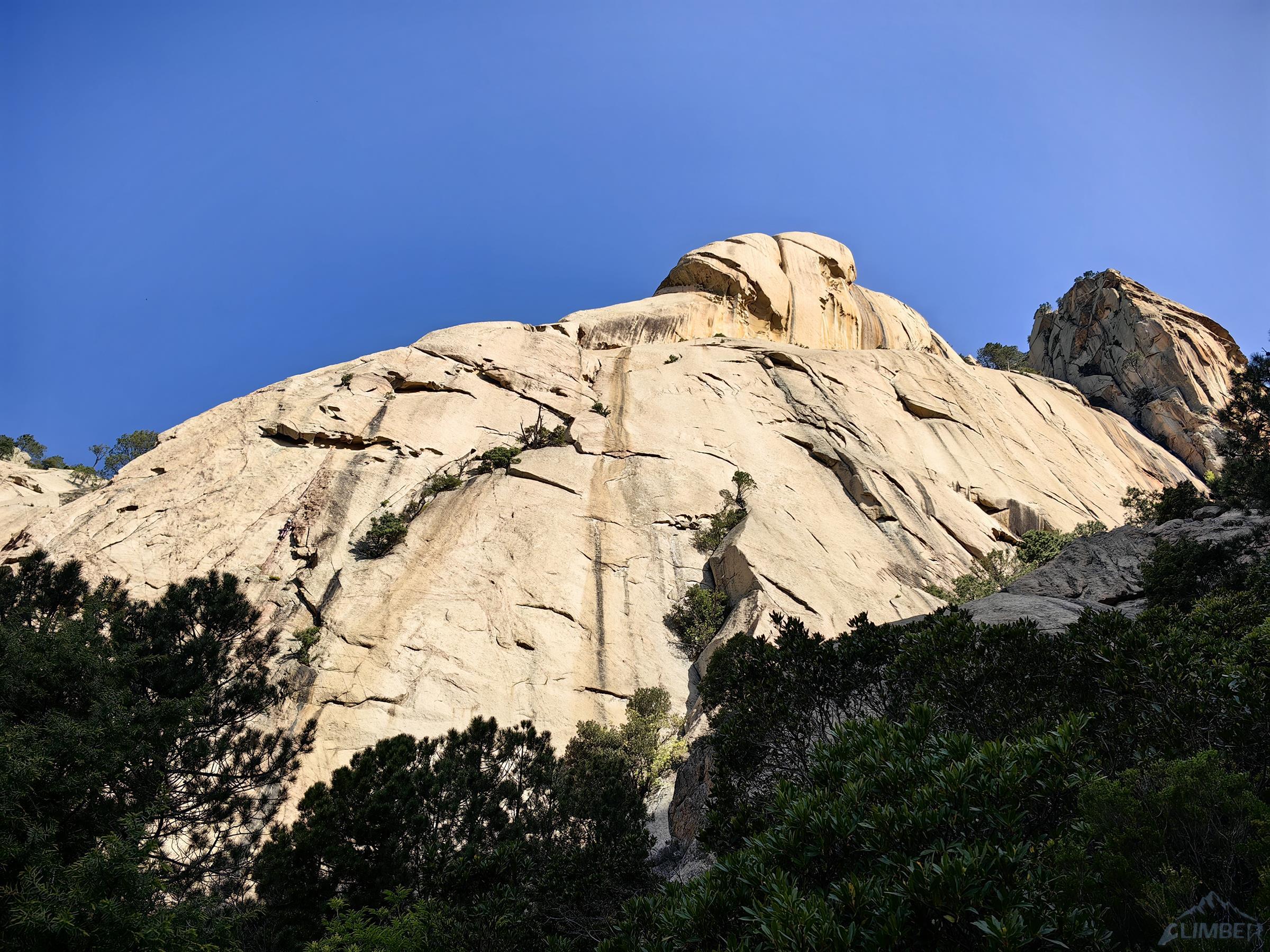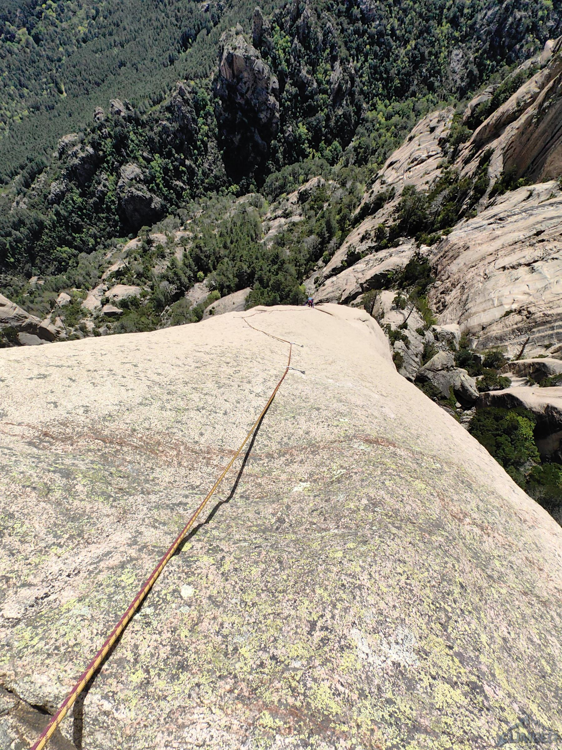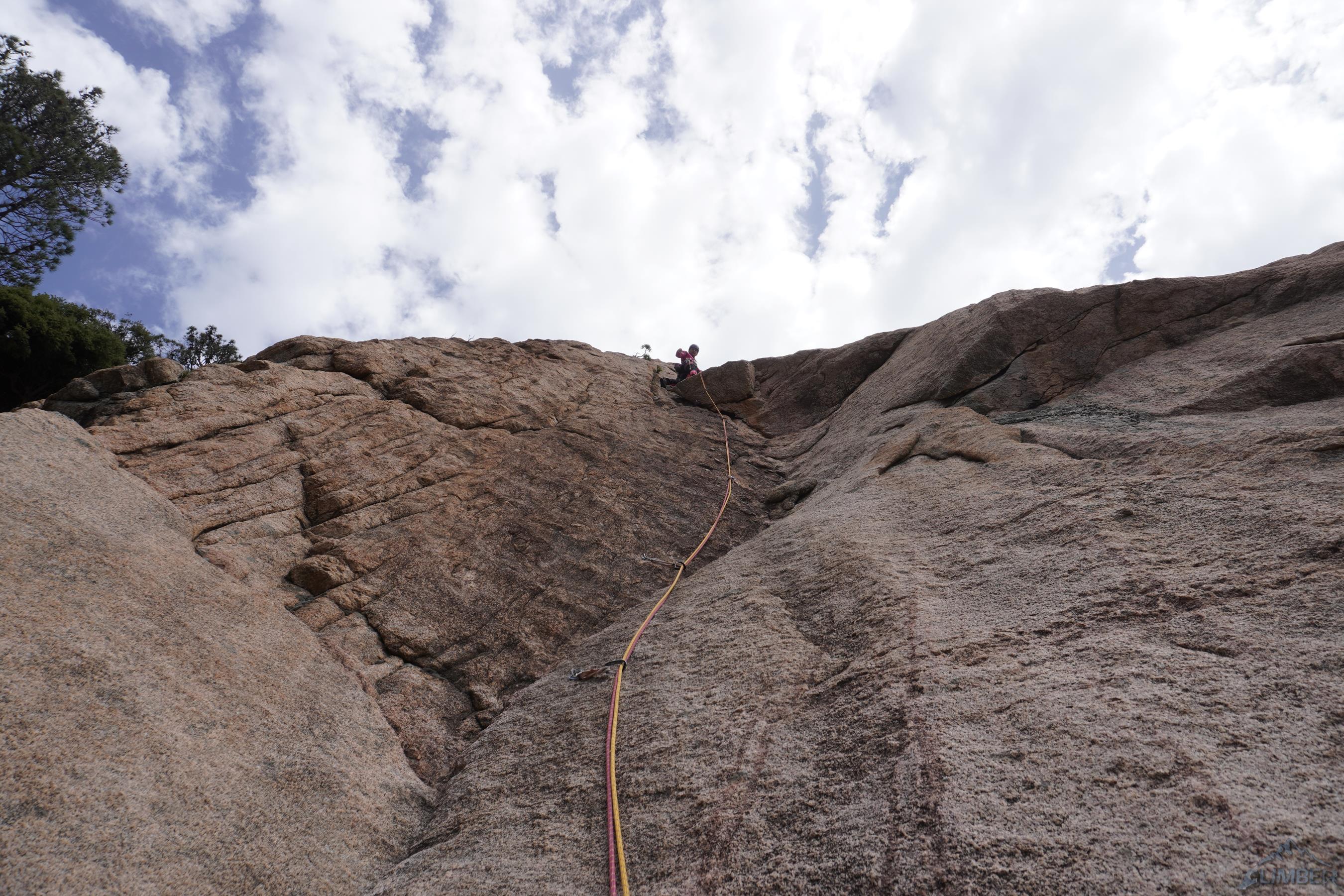 Drugiego dnia pobytu w Bavelli wybieramy się na najsłynniejszą wg przewodnika drogę Korsyki - Le dos de l'éléphant (6b+/c 320m) na Punta di u Corbu. Linia swego czasu uchodziła za najpiękniejszą granitową drogę Francji – takim mianem ochrzciła ją Catherine Destivelle. Trudnościami i zapewne urodą przebiją ją co prawda obecnie sąsiedni Jeef (7b), nadal jednak wizyta jest wręcz obowiązkowa dla wspinaczy odwiedzających wyspę i mających na tyle doświadczenia by się z nią zmierzyć. O powadze nie decydują tyle trudności, co kilkumetrowe odległości między spitami na słynnych rajbungach prowadzących tytułowym Grzbietem Słonia. Najlepiej zresztą zaliczyć obie linie, co zresztą jest w planach 😊. Dla mocarzy są też imponujące linie 7c (trad) oraz 8a i 8b (obite)!