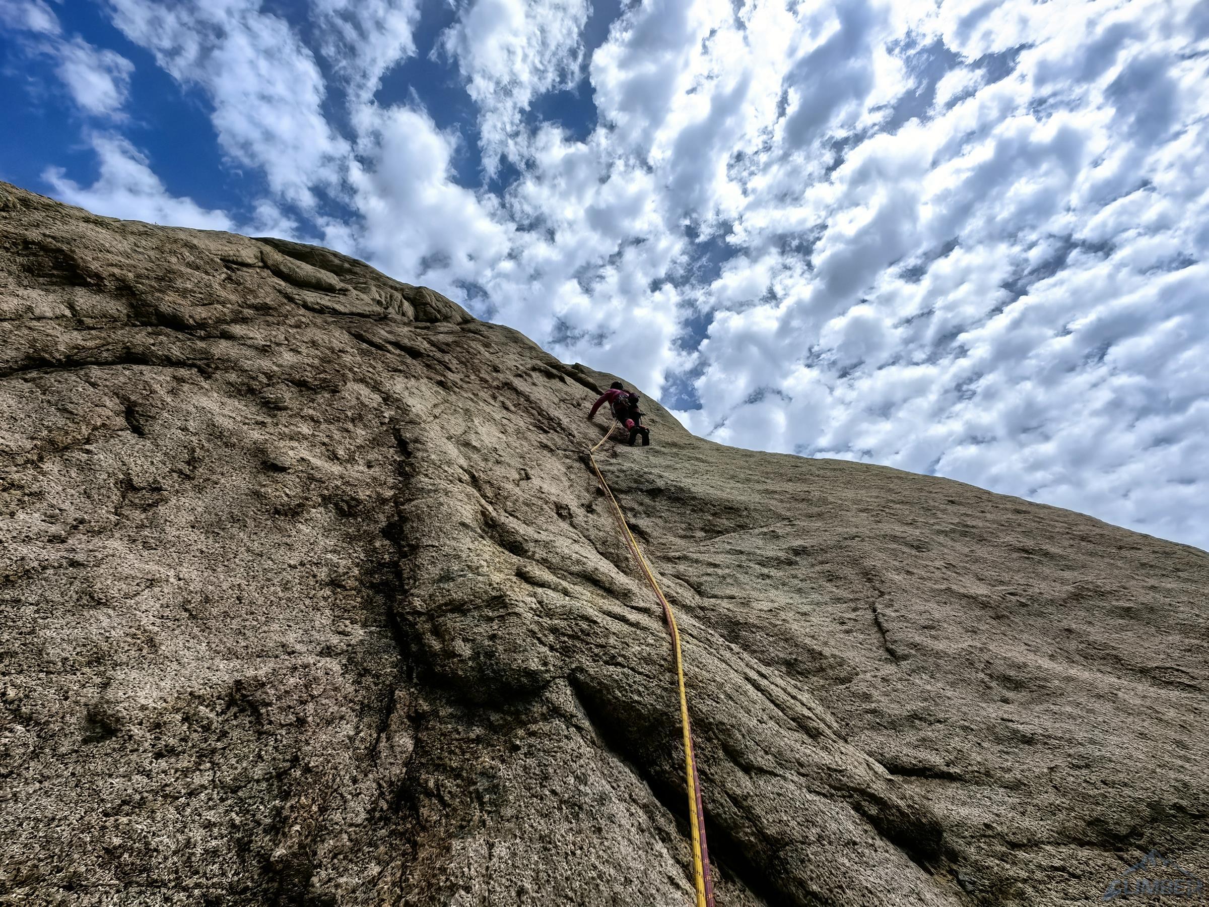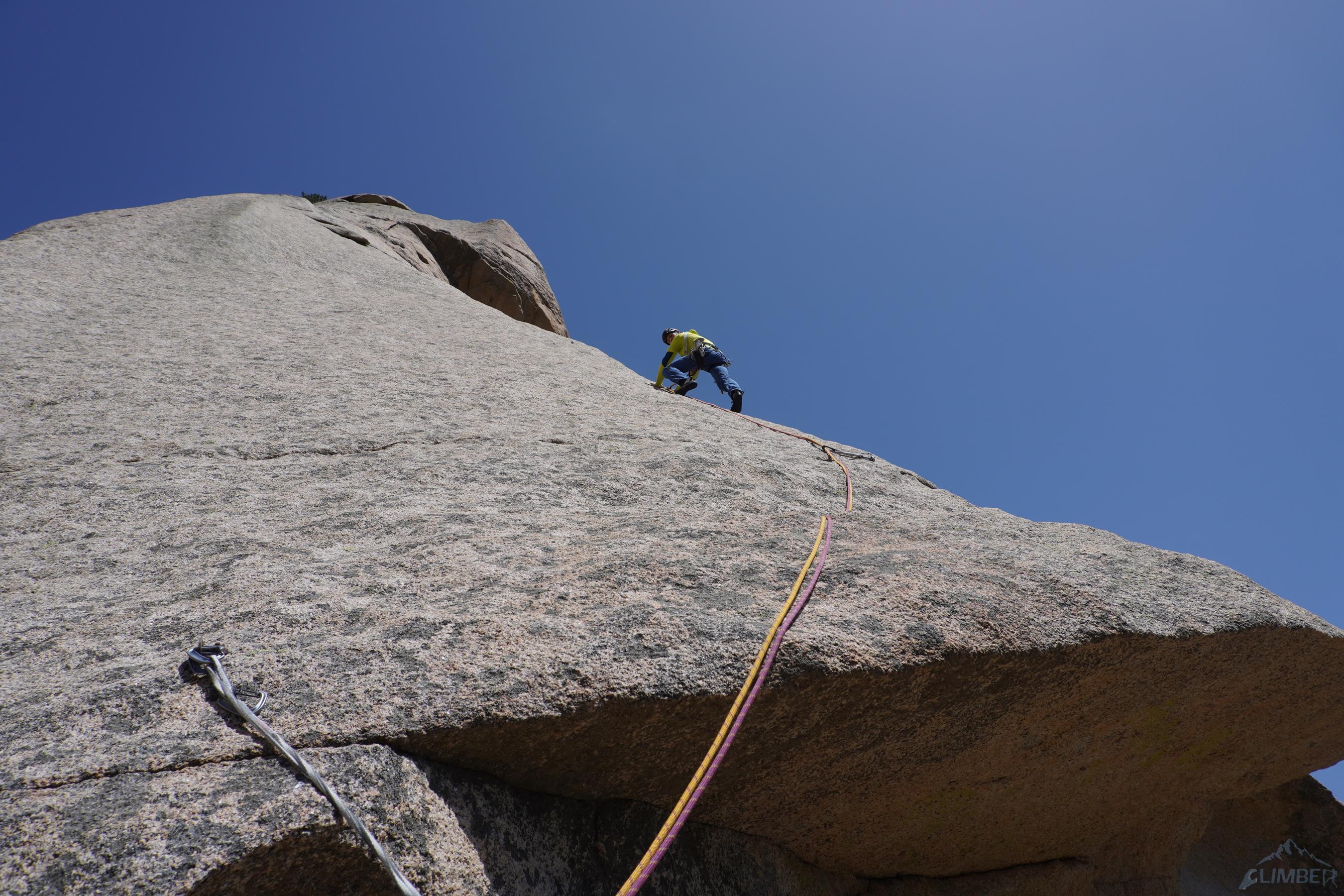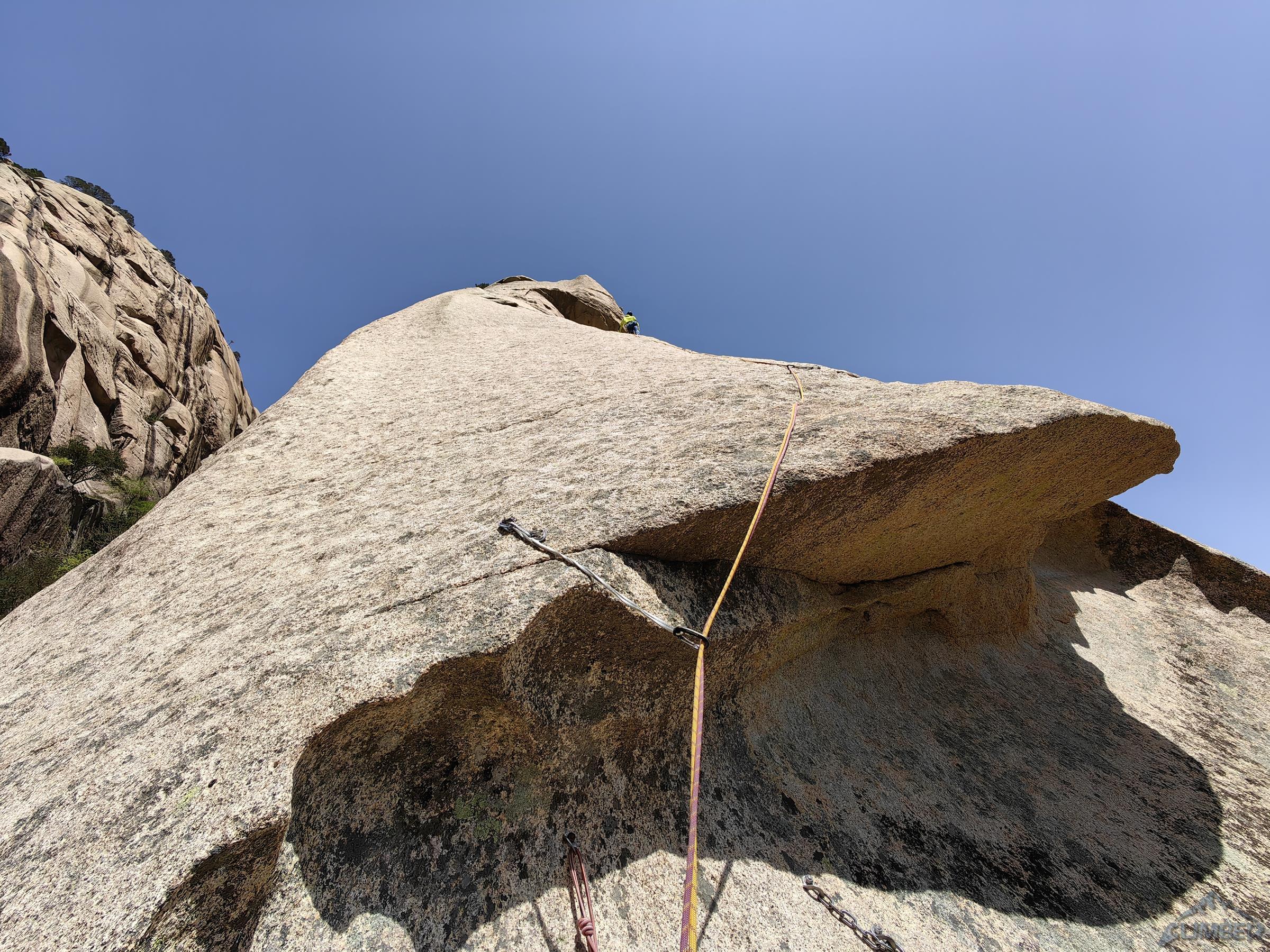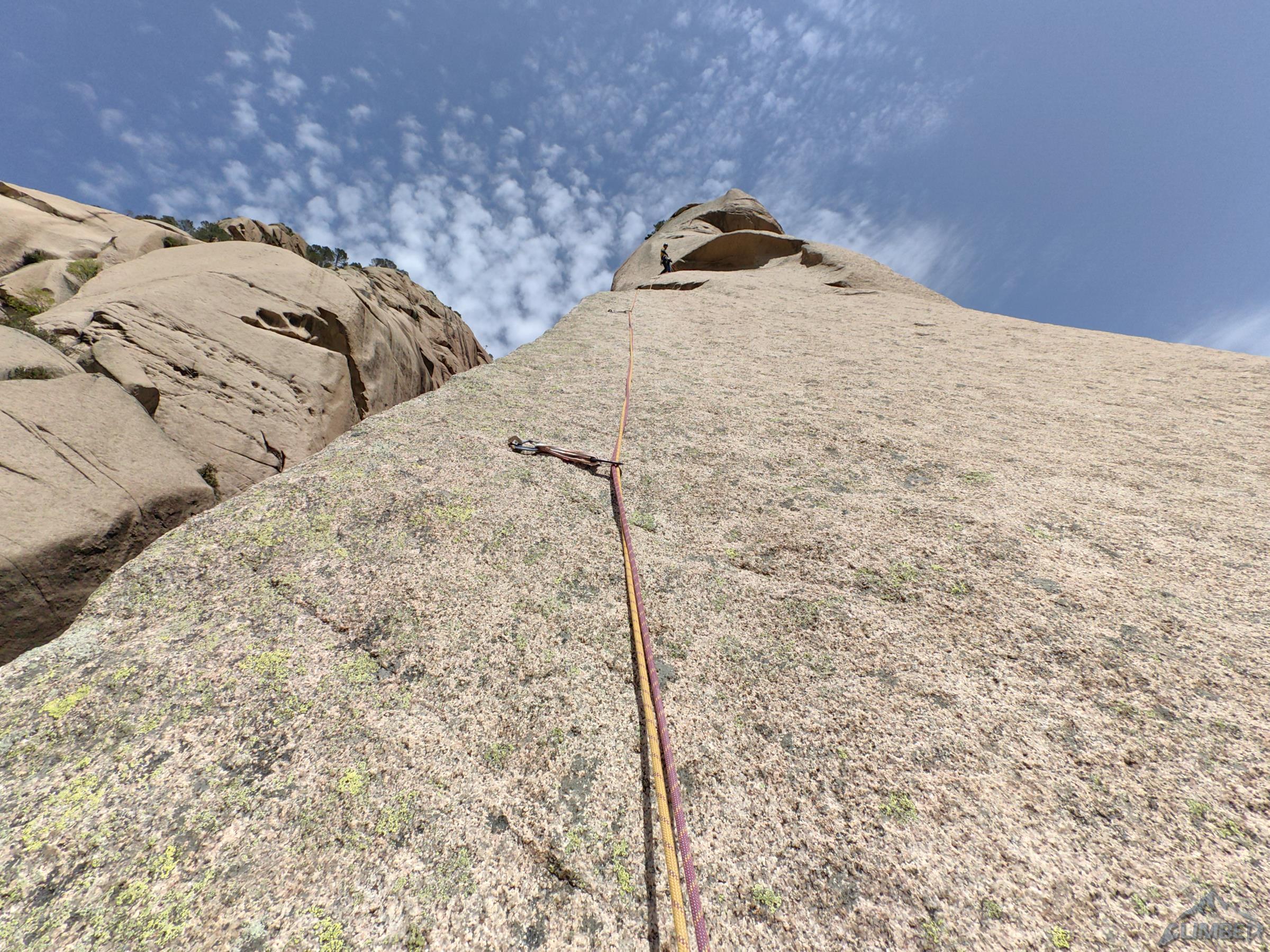 Będąc już na miejscu start drogi zlokalizować bardzo łatwo – na skale jest napis, nasze spity idą po lewej, te z Jeefa po prawej stronie. Pierwszy wyciąg (6a+) to estetyczne wspinanie po krawądkach w stromej miejscami płycie – granit jest świetnej jakości, a wpinki blisko siebie, tak więc można się bezstresowo rozgrzać. Drugi wyciąg (6a/a+) jest krótki ale efektowny – zaczynamy od zacięcia po prawej, trawersujemy w lewo pod wąskim okapem i przewijamy się przez niego z lewej strony. Zaraz po wyjściu czeka trudniejsze miejsce, w którym z powodu małego zapychu trochę się zestresowałem 😉.