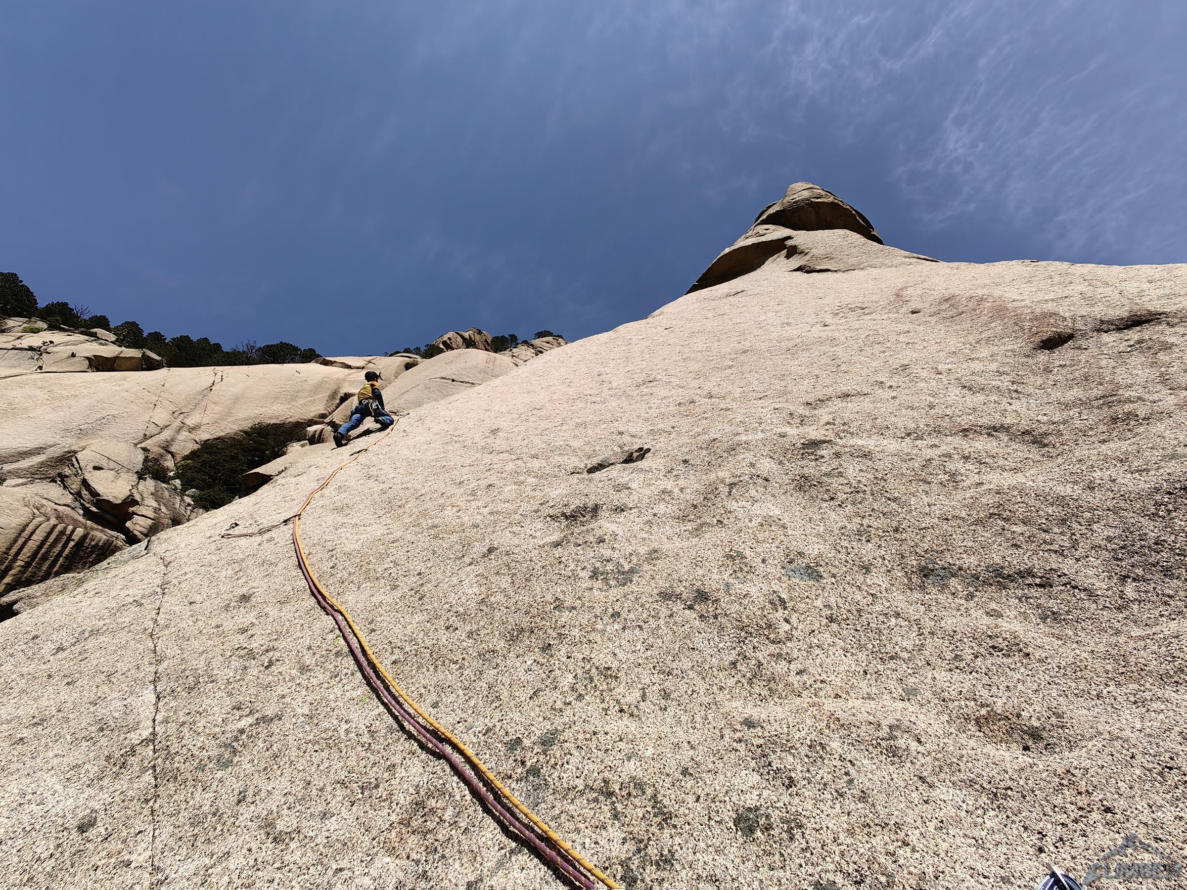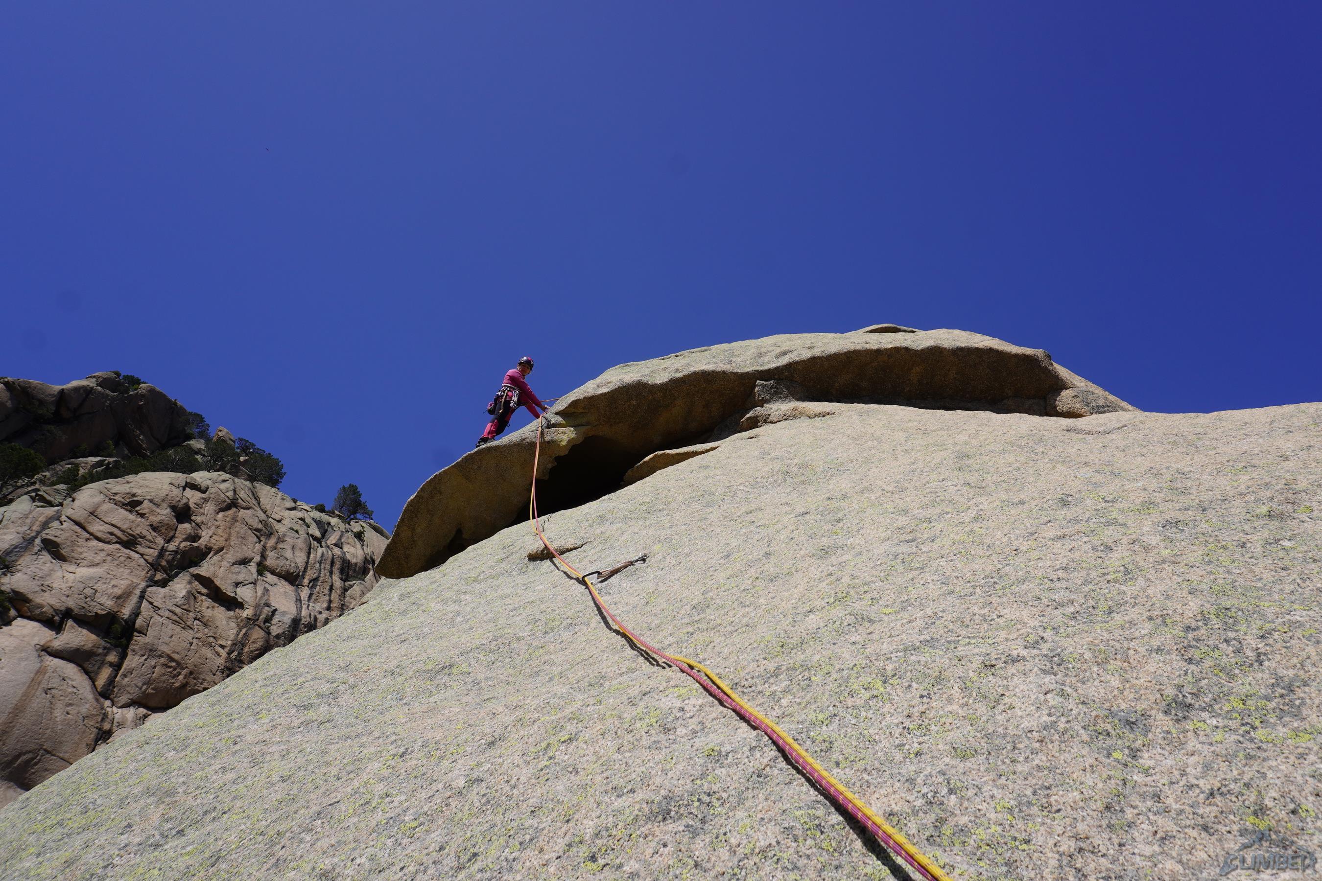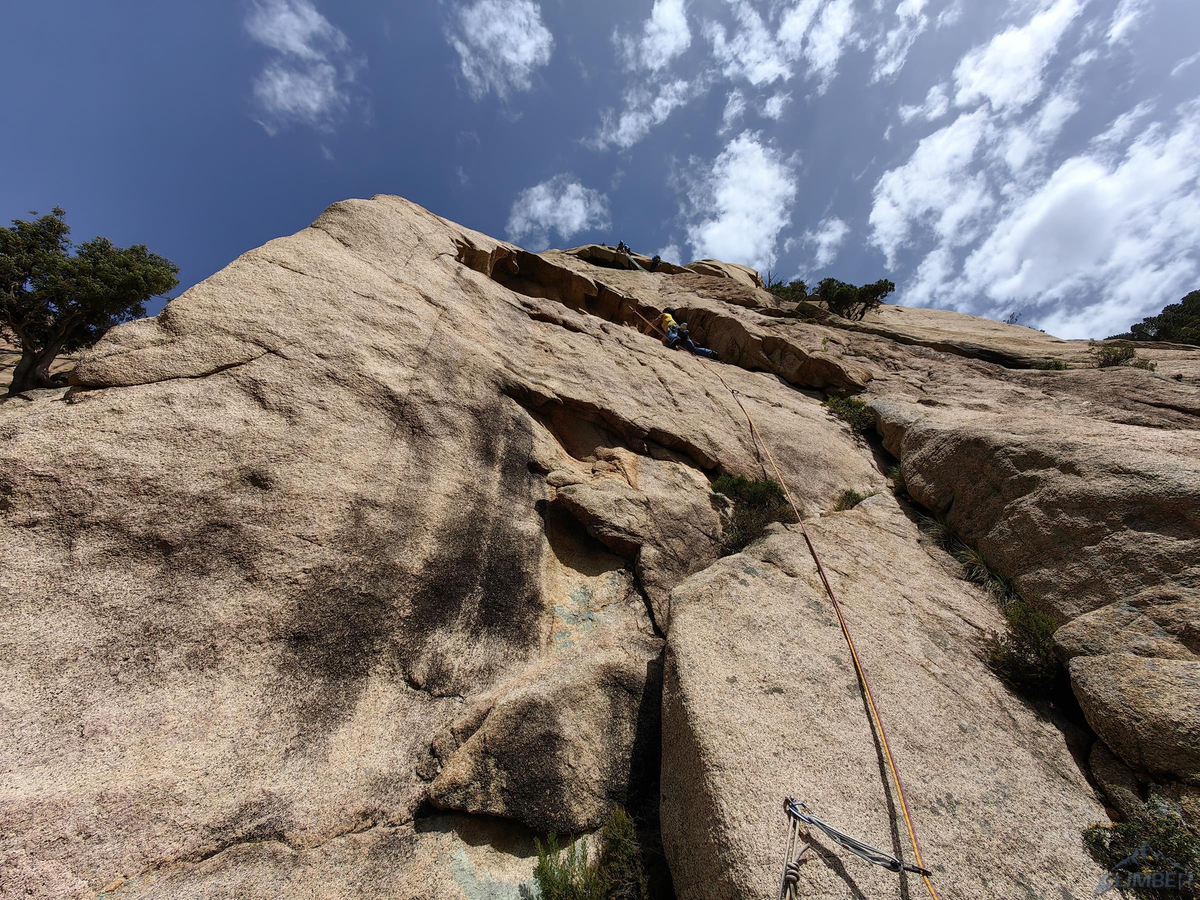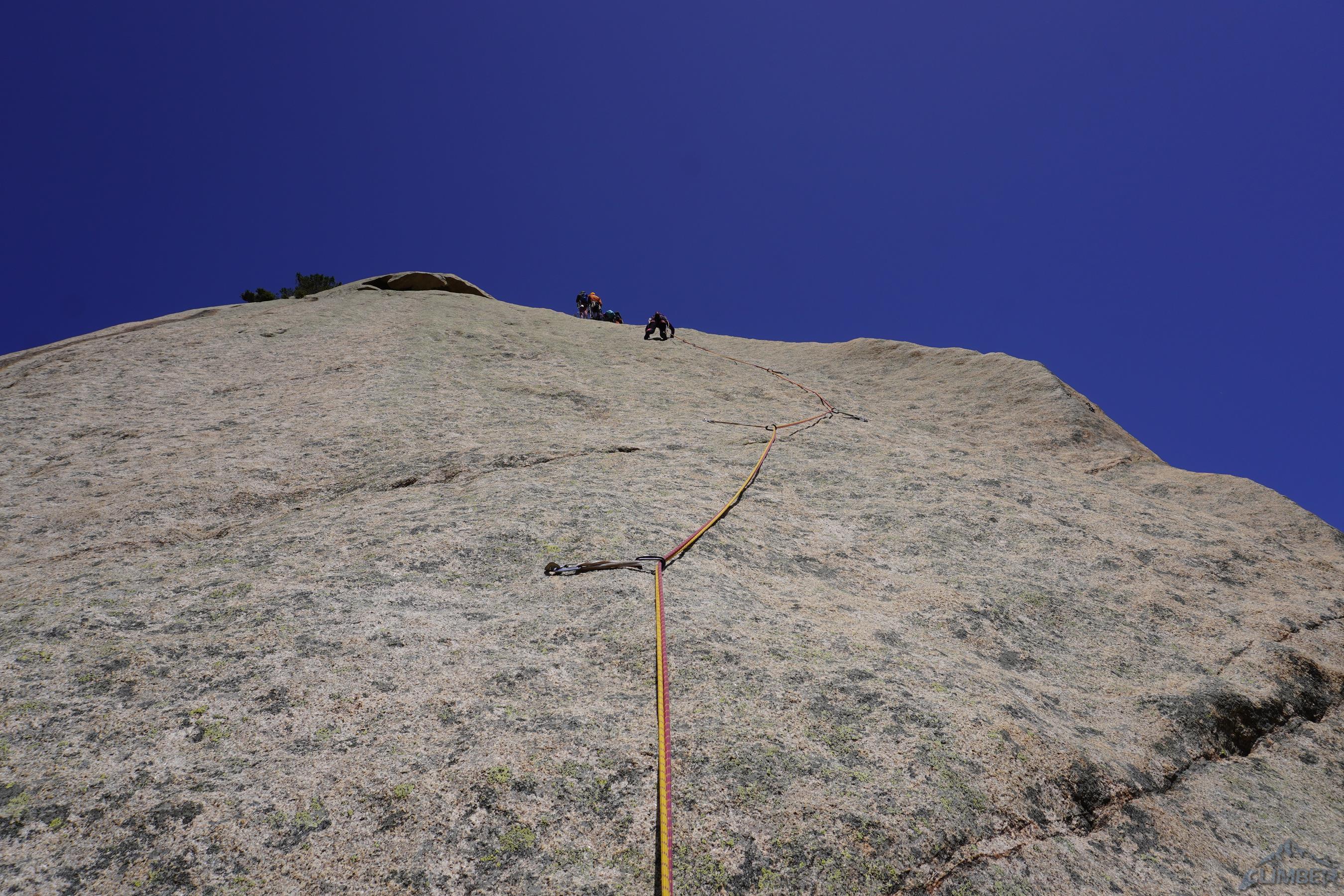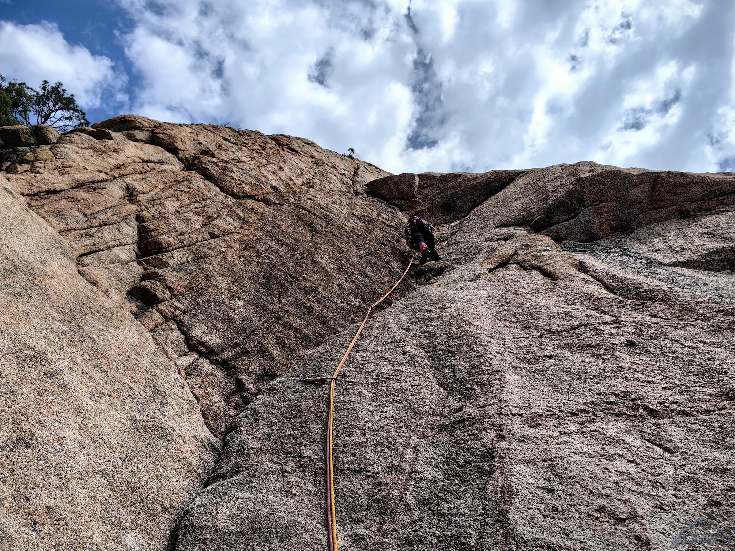 Będąc już na miejscu start drogi zlokalizować bardzo łatwo – na skale jest napis, nasze spity idą po lewej, te z Jeefa po prawej stronie. Pierwszy wyciąg (6a+) to estetyczne wspinanie po krawądkach w stromej miejscami płycie – granit jest świetnej jakości, a wpinki blisko siebie, tak więc można się bezstresowo rozgrzać. Drugi wyciąg (6a/a+) jest krótki ale efektowny – zaczynamy od zacięcia po prawej, trawersujemy w lewo pod wąskim okapem i przewijamy się przez niego z lewej strony. Zaraz po wyjściu czeka trudniejsze miejsce, w którym z powodu małego zapychu trochę się zestresowałem 😉.