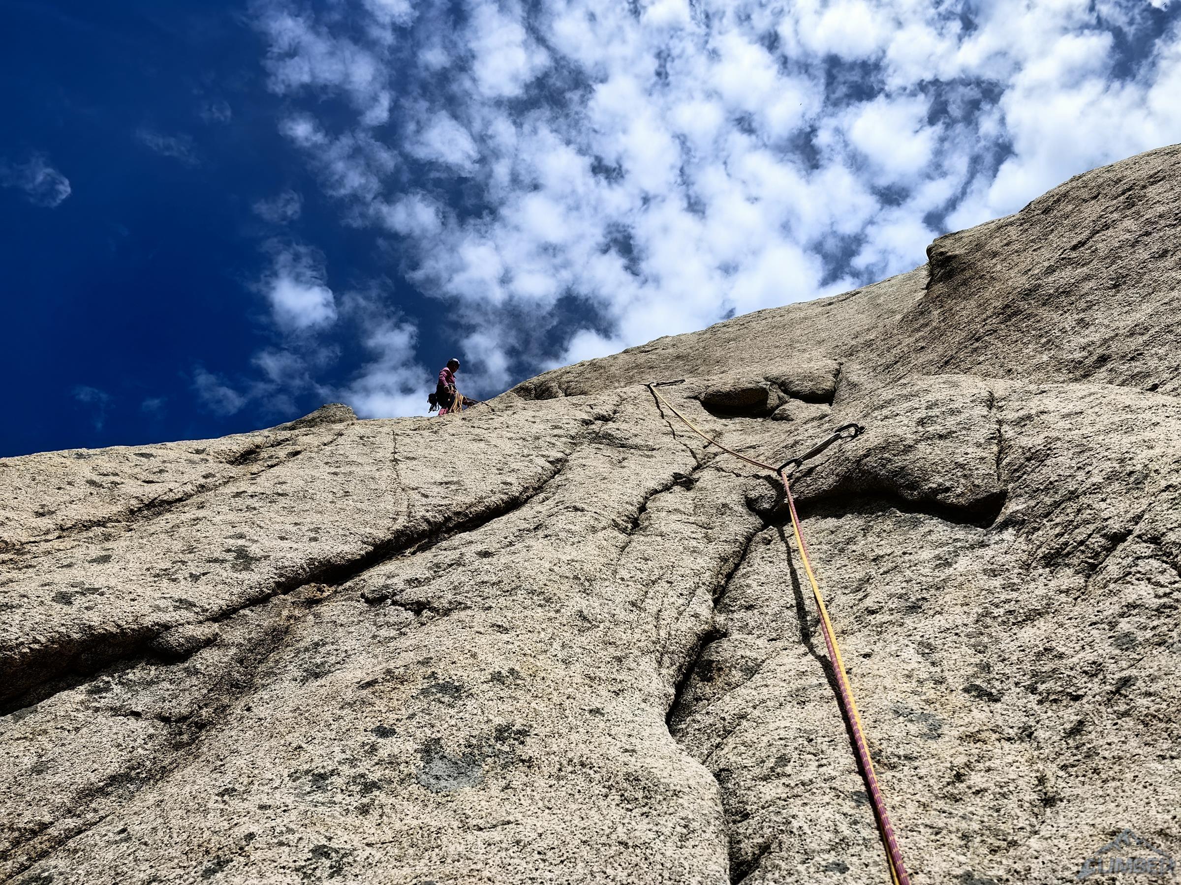 Kolejny odcinek jest najtrudniejszym (technicznie nie psychicznie) na drodze – wg różnych topo ma od 6b+ do 6c. Zaczynamy od ślicznej rysy rodem z rejonu Mont Blanc, po czym zaczynamy długi trawers w lewo, zwieńczony cruxem w którym przydaje się dobry pomysł – długo chodzę do góry i w dół by nie spalić OS-a, w końcu ryzykuję i udaje się dotrzeć do łańcucha. W dalszej części drogi czekają dwa łatwiejsze ale nadal przepiękne wyciągi – do akcji wkracza więc Ania sprawnie je prowadząc. Najpierw pokonujemy estetyczne zacięcie (5c), zwieńczone małą przewieszką, później wspinamy się bogato urzeźbioną płytą wzdłuż obłych rys, wychodząc na koniec w lewo (widoczne spity na płycie z prawej to wyciąg 6c+ z Ganesh).