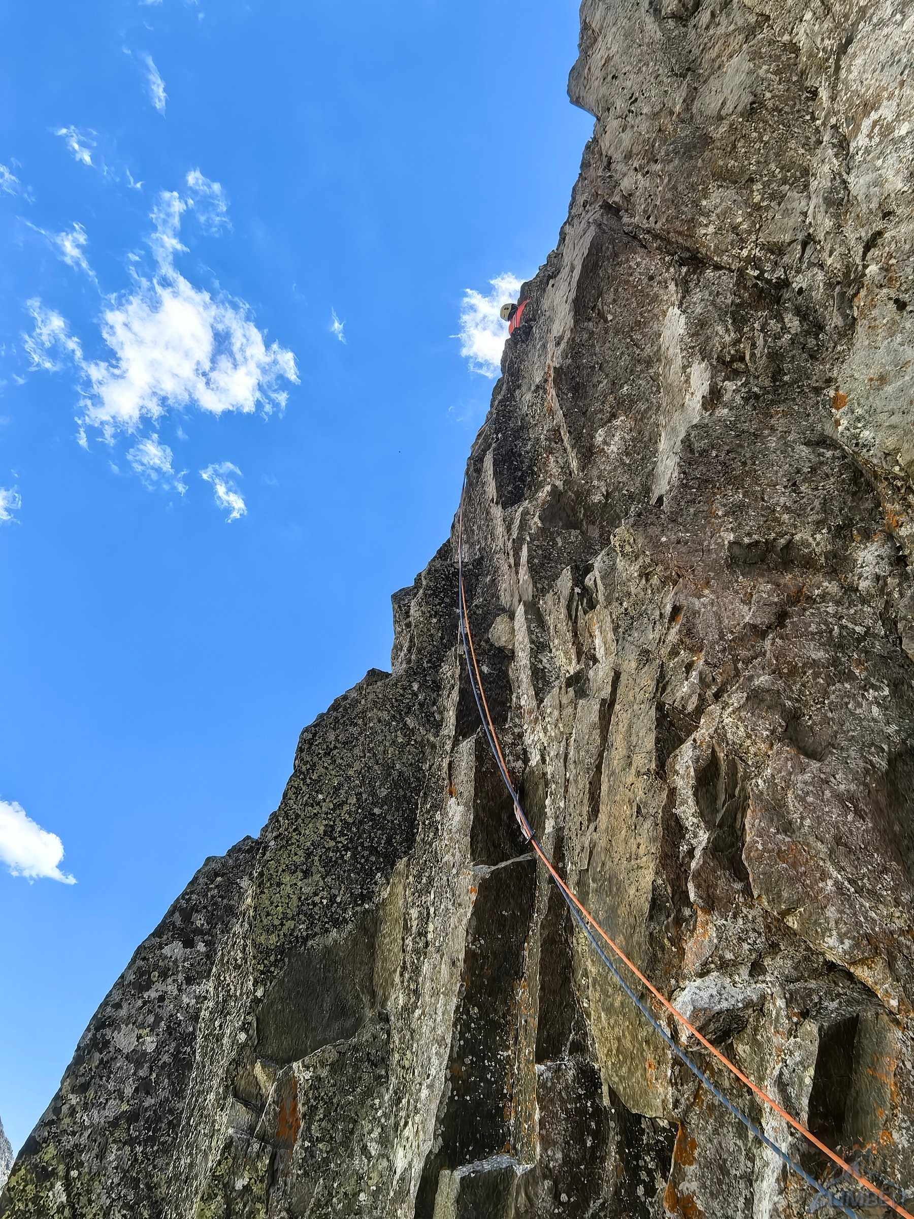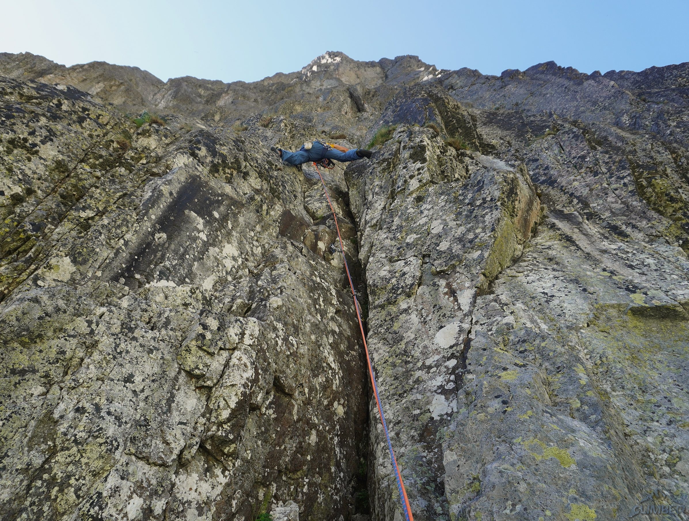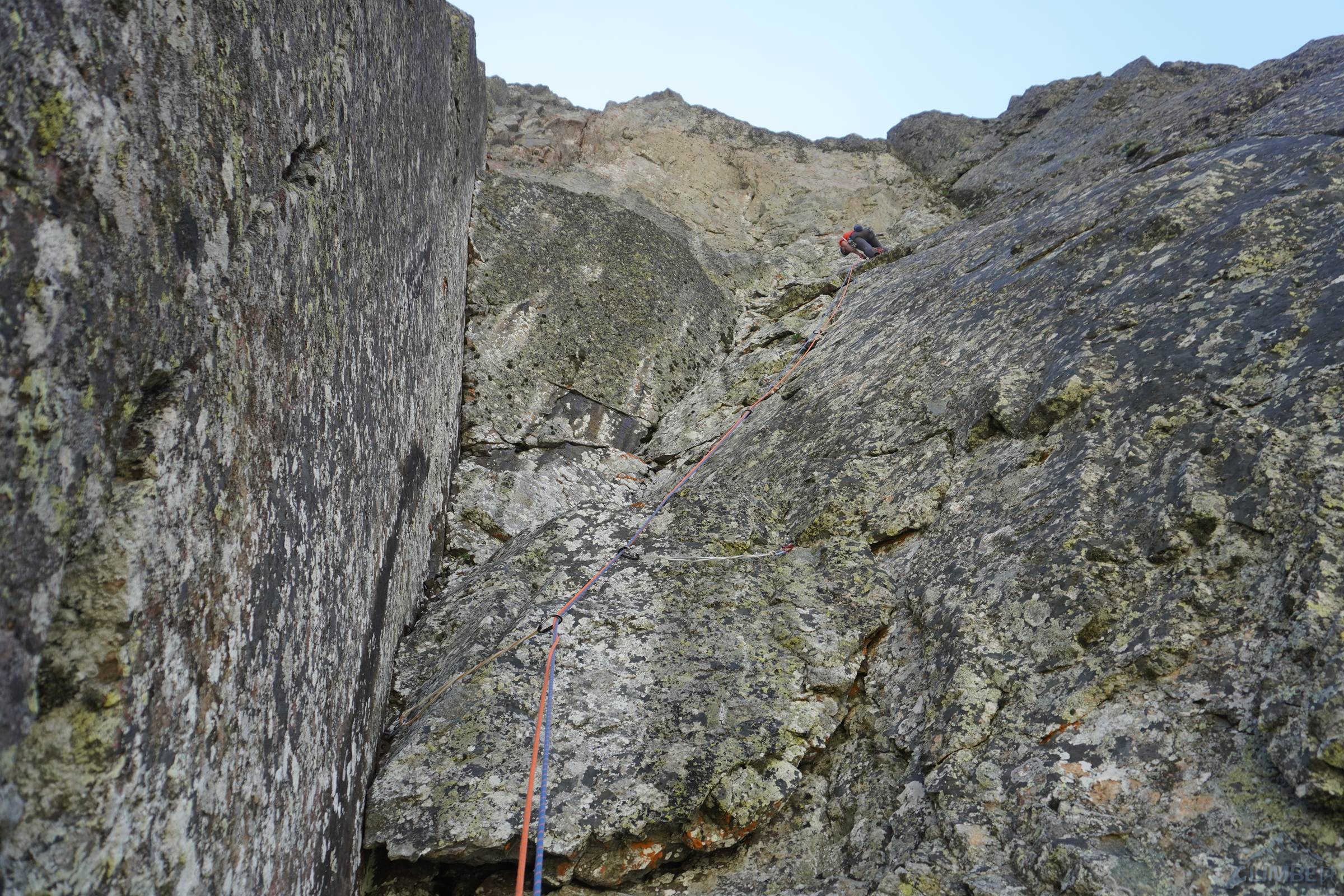 Choć koordynowany przeze mnie obóz klubowy odbywa się nad Popradzkim Stawem, pierwszy dzień jest jednym z najgorętszych w roku – dlatego też z Szymonem nie działamy jeszcze w słonecznej Dolinie Mięguszowieckiej, lecz chowamy się w północnej zerwie Żółtej Ściany. Prawie zawsze zimna i wilgotna tutaj skała jest tego dnia w idealnych warunkach – pojawia się więc świetna okazja by przejść Direttissimę wariantem prostującym Korczaka (VIII). Na drodze jakiś czas temu pojawiły się stałe stanowiska oraz kilka dodatkowych spitów - na „moralnych” piątkach i szóstkach w dolnej części ściany nie trzeba już bać się o życie, a w trudnościach można skupić się na pięknych ruchach. Dzięki temu linia powinna być w miarę regularnie powtarzana i nie popaść w zapomnienie – brawo dla zdrowego podejścia osób myślących o innych wspinaczach!