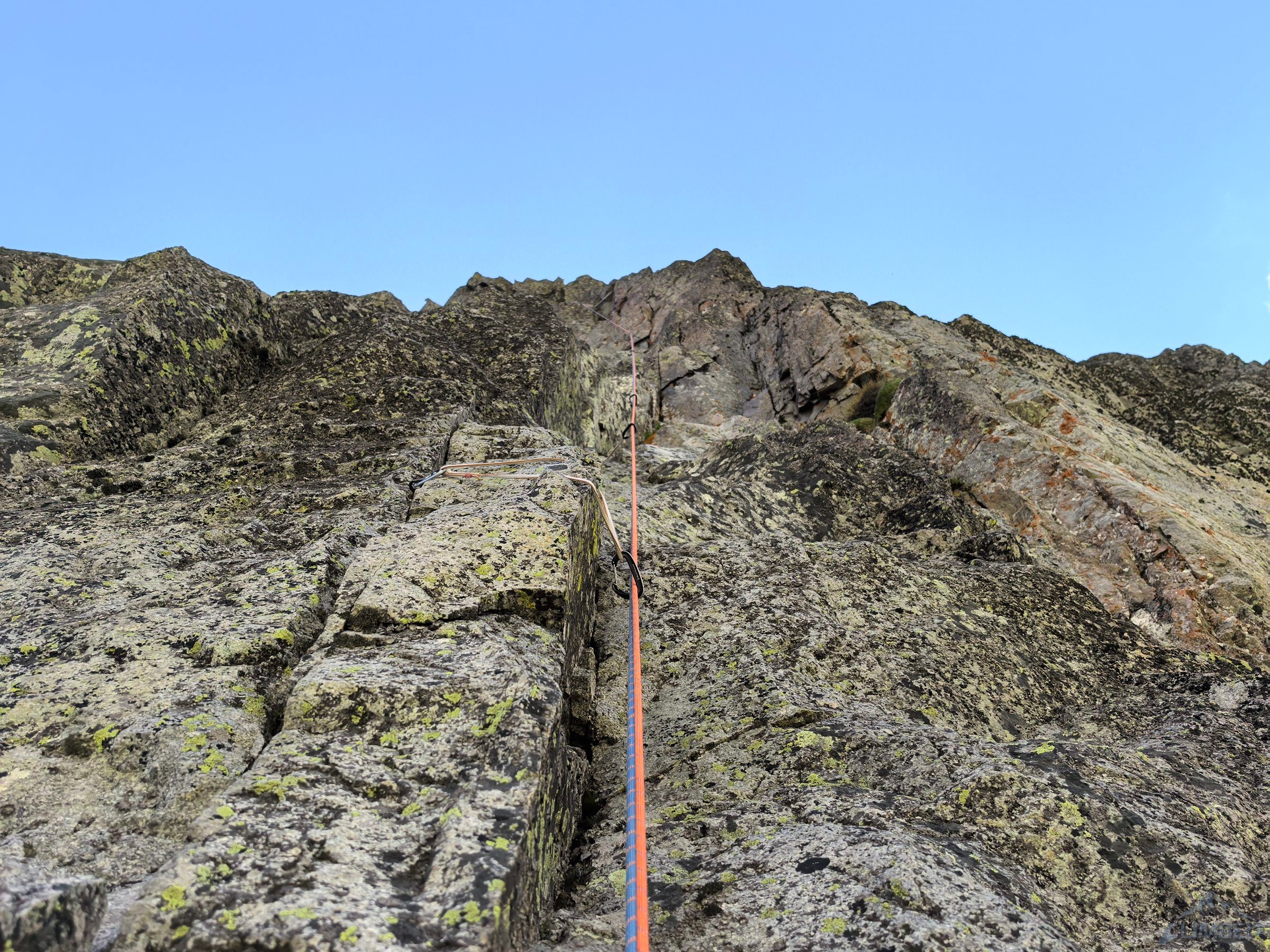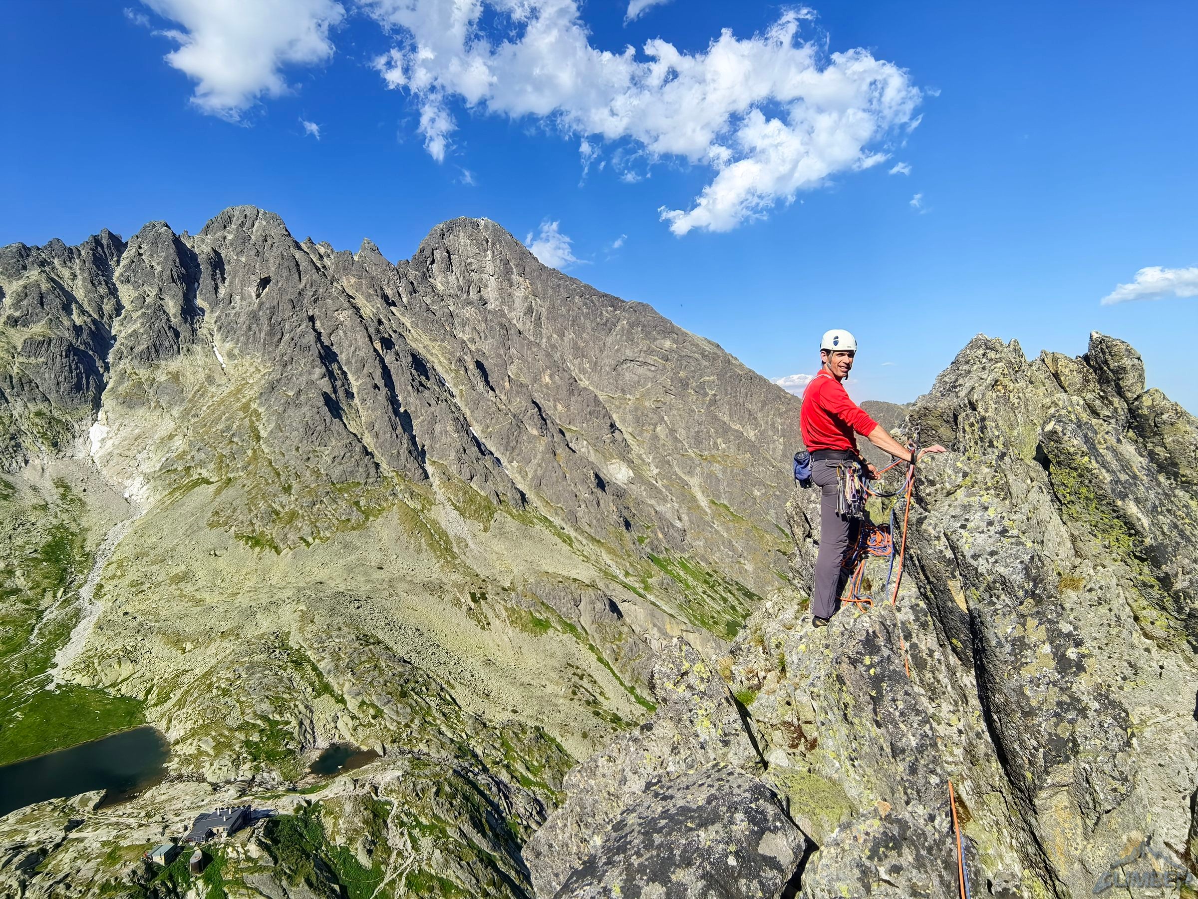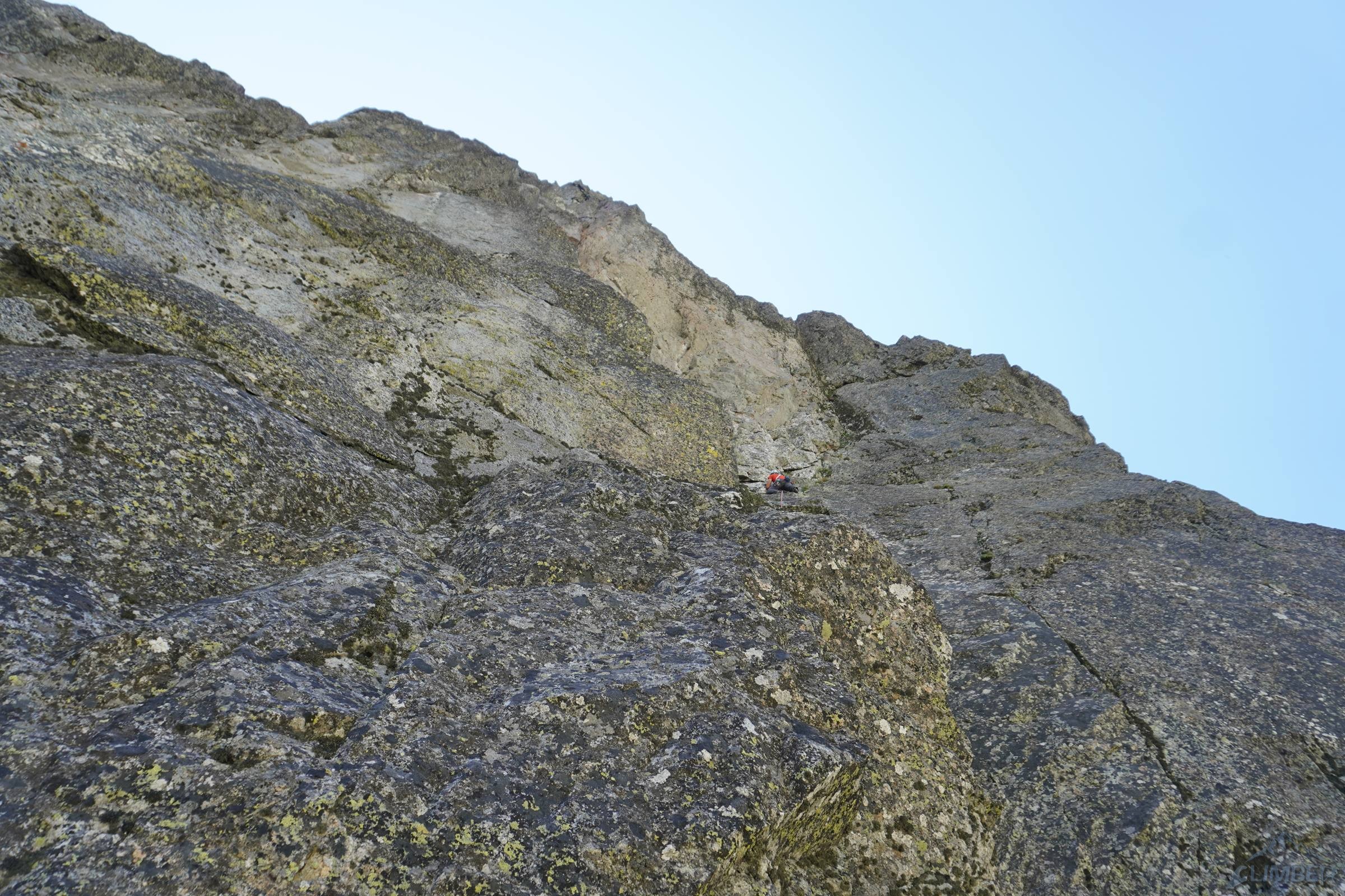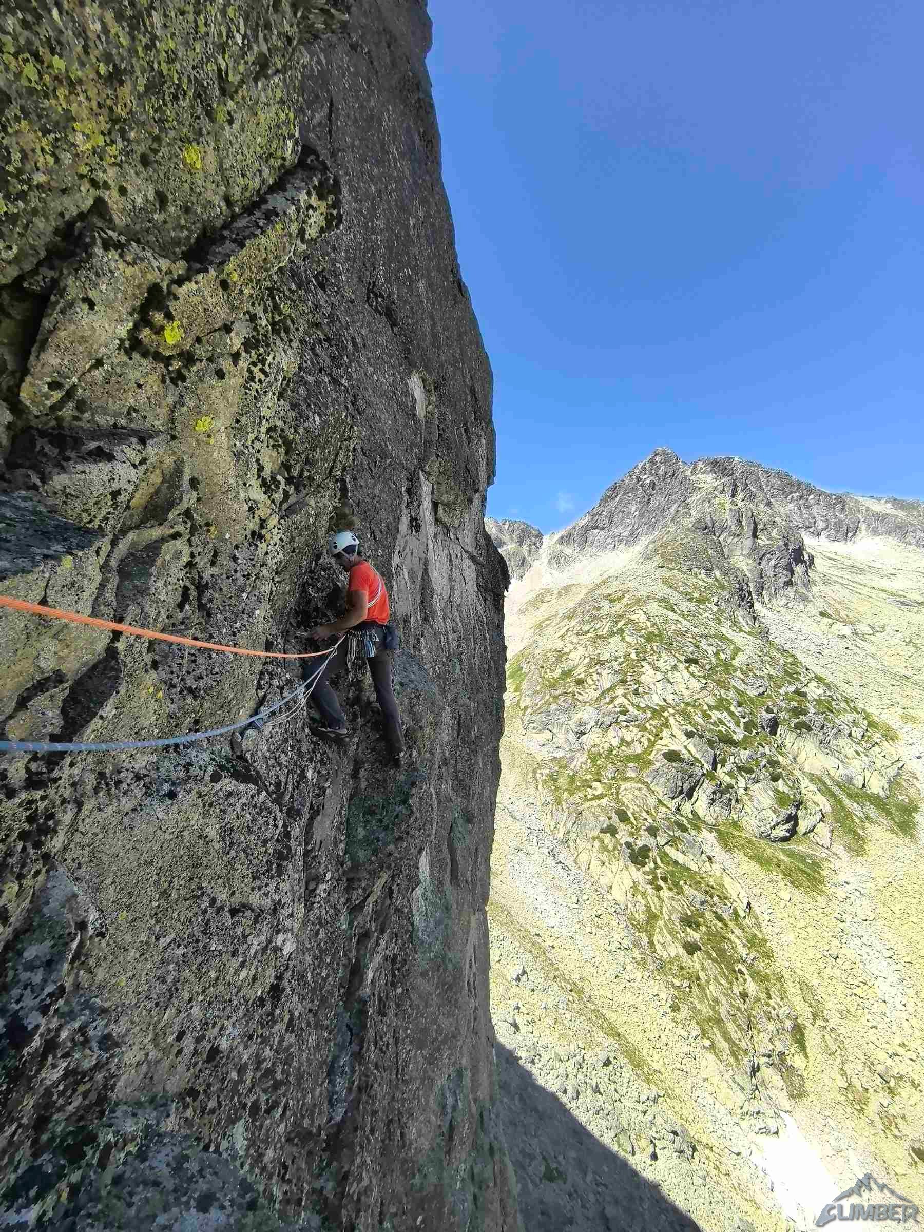 Kolejny wyciąg jest bardzo efektowny i w ciągowych szóstkowych trudnościach (do tego są miejsca z mocnym VI+) – przewijamy się na powietrzny przewieszony kant i kontynuujemy nim przez kolejne uskoki wzdłuż haków do ostatniego wymagającego miejsca (spit), po którym wychodzimy na taras pod ścianką szczytową. Nowe stanowisko jest po prawej (pod kątem zjazdu), my jednak dochodzimy do wniosku że w kolejny wyciąg lepiej startować ze stanu z haków po lewej – zarówno w wariant siódemkowy (filarkiem wzdłuż haków), jak i ósemkowy (przewieszonym zacięciem z rysą). Świetna asekuracja (dwa spity i super rysa na friendy) przekonuje mnie do spróbowania prostowania OS-em, bulderowy charakter cruxa powoduje jednak że źle odczytuję ruchy na wyjściu z trudności i zawisam. Po dopracowaniu patentów wstawiamy się z Szymonem na zmianę – druga próba kolegi okazuje się skuteczna, z dużą pomocą rękawiczek do rys które dość przypadkowo zabraliśmy 😊. Dodam tylko, że sekwencję rodem z bulderowni na wyjściu z przewieszonego zacięcia 200 metrów nad ziemią śmiało dopisać można do grona taternickich perełek – już tylko dla tego miejsca warto się tutaj wybrać! Po pokonaniu trudności dojście do stanowiska to już formalność – dwa ostatnie spity znajdziemy na szczycie po przejściu piątkowego zacięcia. Wspinanie zakończyć można też wspomnianym oryginalnym wariantem wprost (VII) lub obejściem z Cagasika po lewej (V).