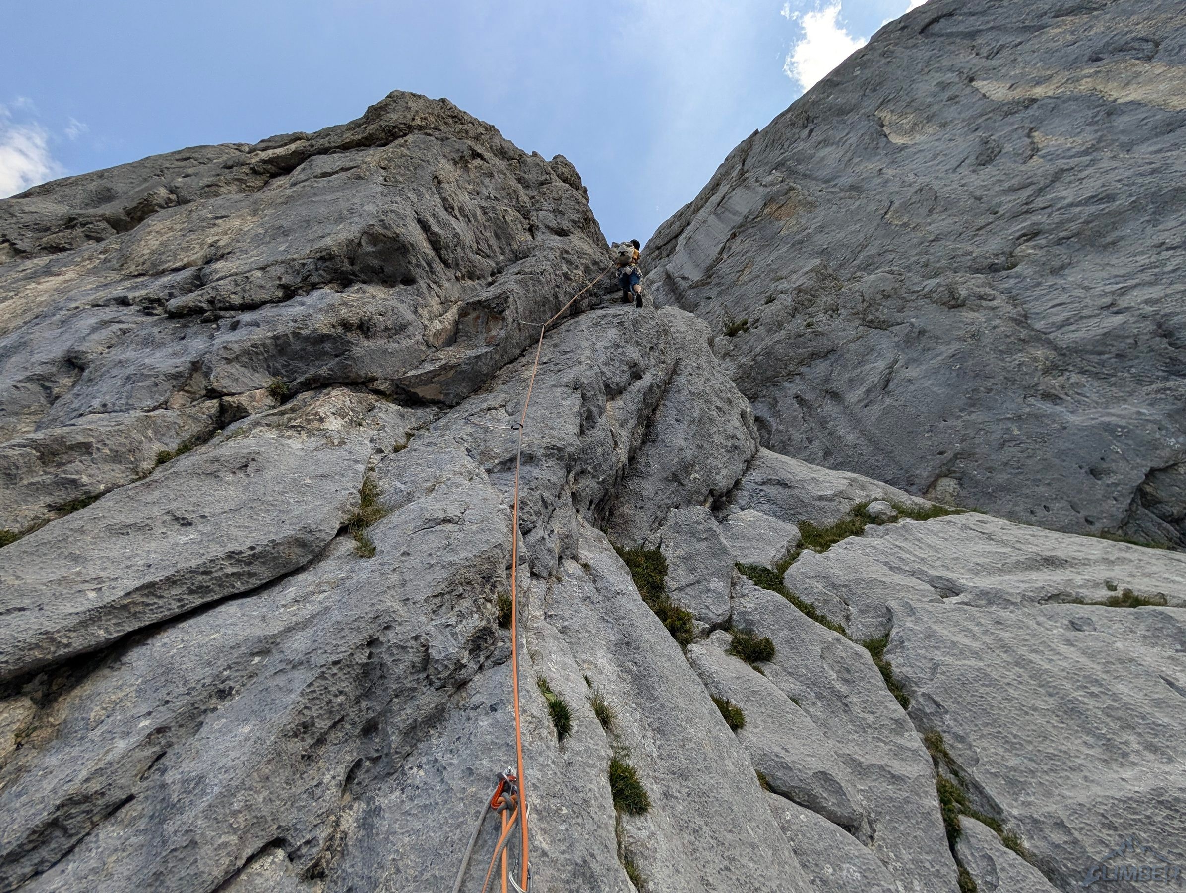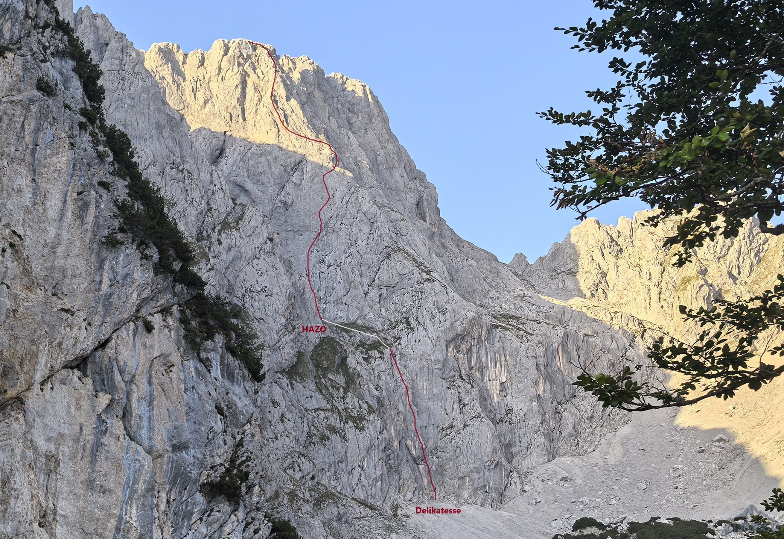 Pierwszy wyciąg (6) Delikatesse startuje płytką w podwieszony filarek, gdzie kontynuujemy przecinającą go depresją – wspinanie jest dość siłowe, a spity co kilka metrów (ocena asekuracji to E2- gdzie E1 to kompletne sportowe obicie, po czym skala narasta do E5). Drugi wyciąg (6+) to już wyraźnie trudniejsza techniczna płyta wzdłuż efektownego kantu – niespodziewane trudności i upał mocno daje się we znaki więc zaczynamy martwić się co będzie wyżej… Trzeci odcinek jednak nieco uspokaja – wycena (7-) wąskiego zacięcia jest adekwatna, wyżej teren się przełamuje i wychodzimy pod wielki taras u podstawy drugiej części ściany. Po przejściu 50 metrów skośnie w lewo namierzamy start HAZO i robimy krótką przerwę – ku naszej uldze pojawiają się chmury więc nie będziemy cierpieć w morzu płyt powyżej 😉. Straszą nas tylko trochę wycofujący się obok Austriacy ostrzegający przed burzą - nasze prognozy są jednak bardziej optymistyczne, poza tym stwierdzamy że najwyżej zjedziemy ścianą spod grani bez wychodzenia na szczyt, co jednak finalnie okazałoby się nie takie proste z powodu kluczenia linii oraz górnych stanowisk z jednego spita...
