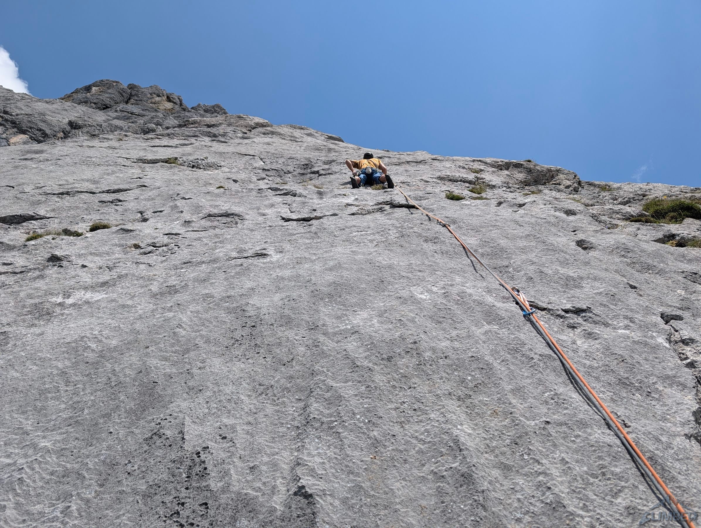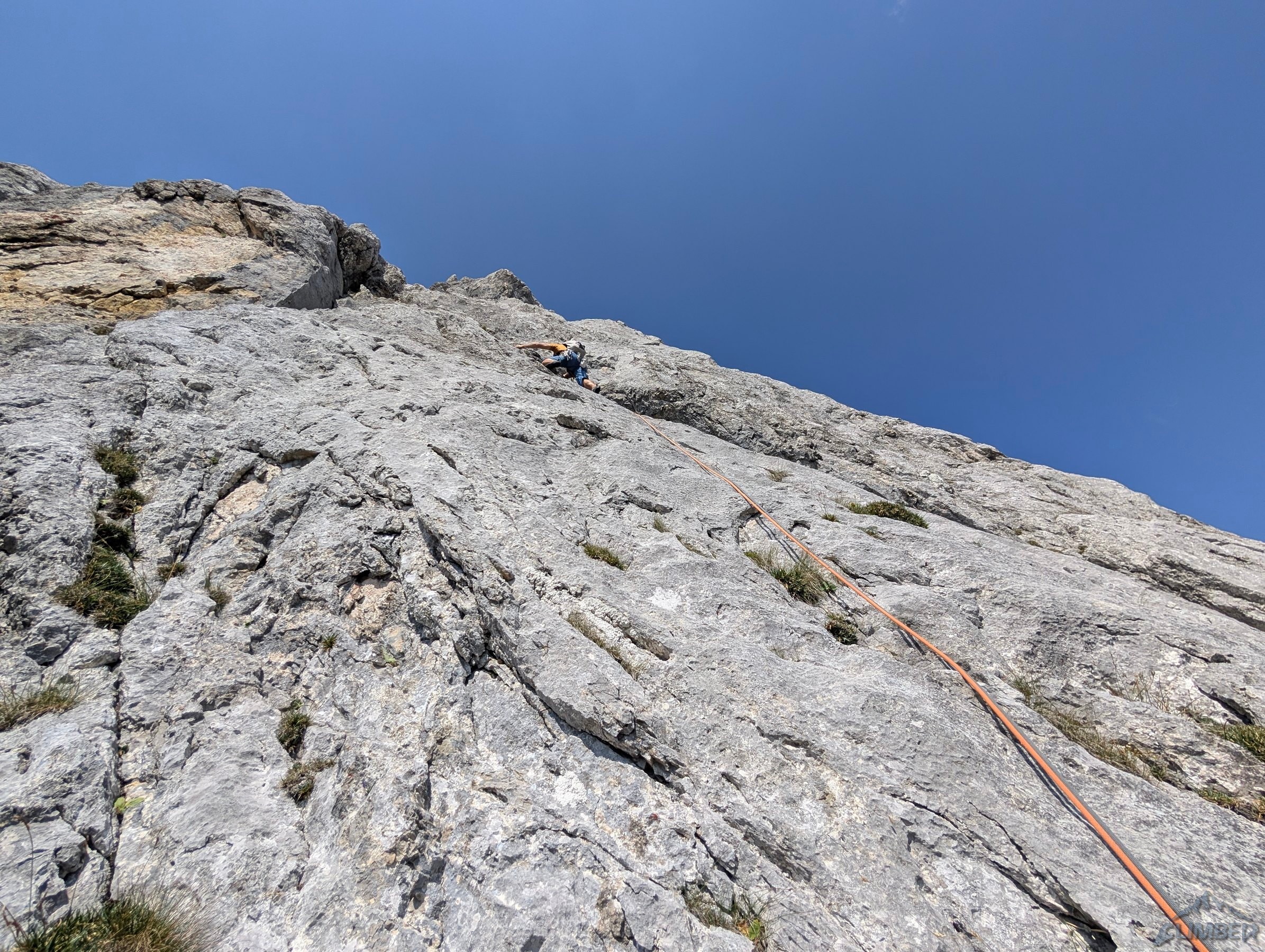 Zaczynamy od nieewidentnego odcinka – pokonujemy okapik ze starym repem i dopiero po 15 metrach lokalizujemy pierwszego spita w płycie, od którego kontynuujemy wzdłuż kilku kolejnych pokonujących kilka czujnych miejsc (w przewodniku wycena to 5, na Bergsteigen 7-). Drugi odcinek to płytowe wspinanie przez całe 50 metrów, kilka miejsc daje do myślenia i zmusza do lekkiego wyjścia ze strefy komfortu choć trudności są teoretycznie szóstkowe (w Bergsteigen 7 😊). Po rozgrzewce czas na danie główne czyli trzy świetne i wymagające wyciągi w bardziej spionowanej i gładkiej części ściany. Na pierwszym z nich po łatwym starcie czeka prawie 30 metrów ciągowego technicznego wspinania (7) z niebanalnym trawersem do stanowiska na koniec. Wyżej rzeźba zanika – trudności więc rosną (7+), tym razem rozłożone są jednak na trzy fragmenty przedzielone przydatnymi restami. Kluczowy wyciąg (8-) zaczynamy od razu cruxem czyli mega technicznym trawersem po małych chwytach i słabych stopniach – ponownie grzeje Słońce więc stopy dostają niezły wycisk dlatego walczę na całego by udało przejść się OS-em. Gdy już cieszę się sukcesem okazuje się że czeka jeszcze jedno podchwytliwe miejsce – na szczęście i ono puszcza w przedziwny sposób, radośnie pokonuję więc kolejne wyraźnie łatwiejsze metry do stanowiska.