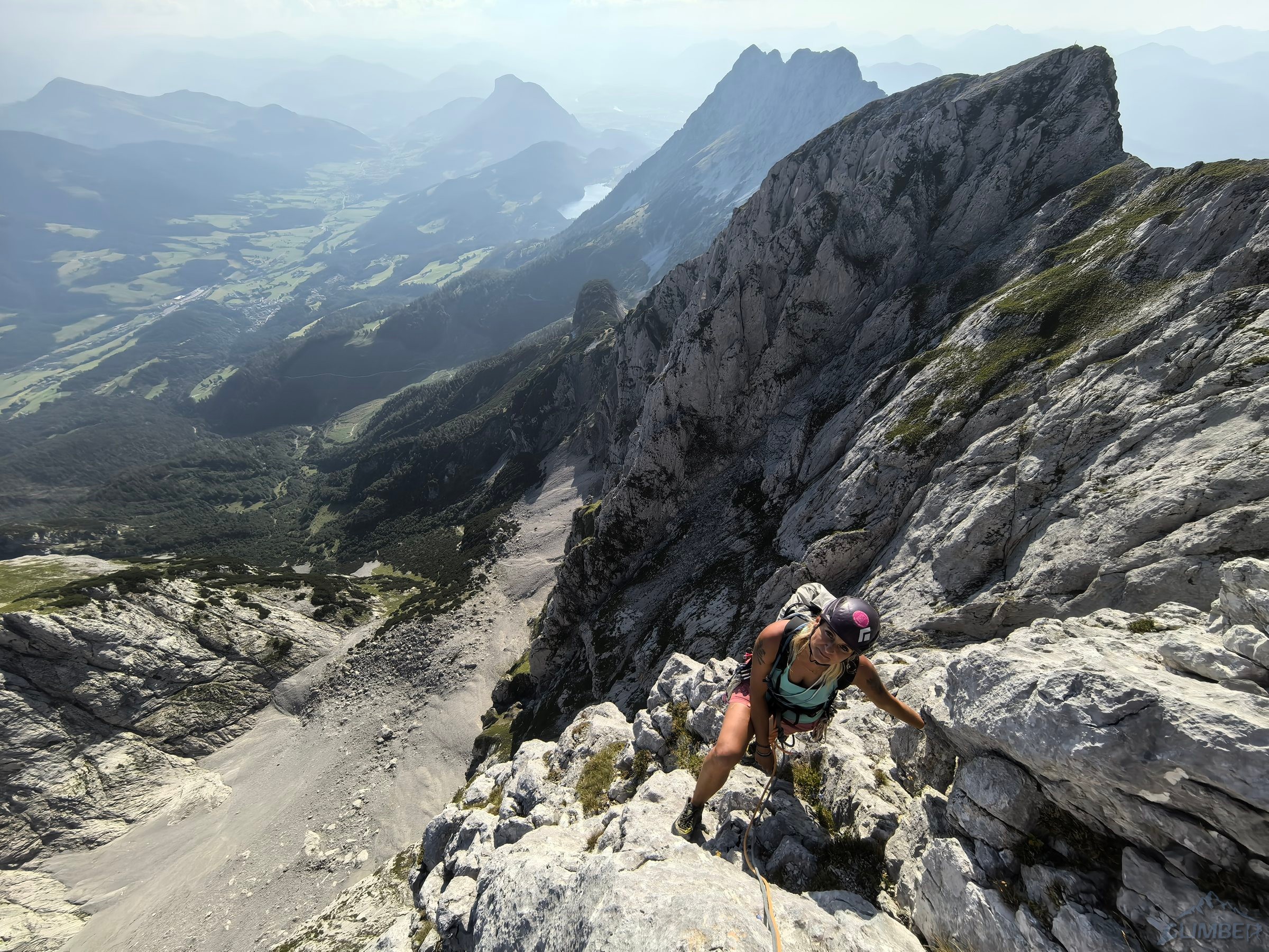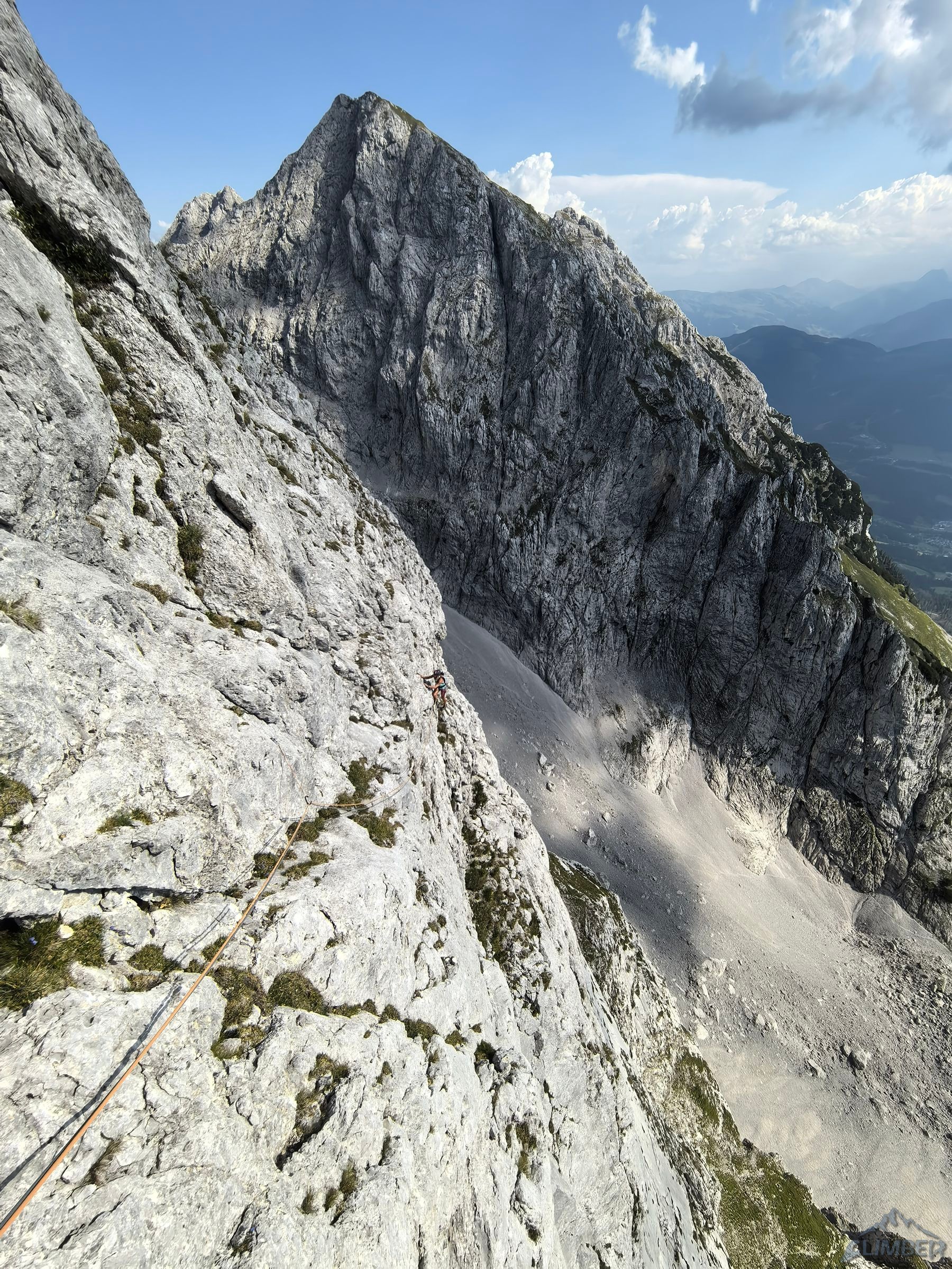 Decyzja o wyborze celu po zarwanej nocy jest nieco ryzykowna biorąc pod uwagę podejście, długość drogi oraz słoneczną wystawę przy wysokiej temperaturze – ponieważ jednak kolejne dwa dni ma padać stwierdzamy, że dobrze od razu jak najwięcej się powspinać i wejść na jeden z głównych szczytów masywu. Pierwsza droga to najciekawsze wspinaczkowe „podejście” pod drugą, gdzie czekają piękne i wymagające wyciągi w stromych płytach oraz końcówka w bardziej górskich formacjach. Prowadzę całość, kombinacja jest faktycznie świetna i daje przedsmak tego co może czekać na innych nowoczesnych liniach Wilder Kaiser. Od razu potwierdzają się też krążące opinie o dość surowych wycenach, które należy brać pod uwagę przy wyborze celów 😉.