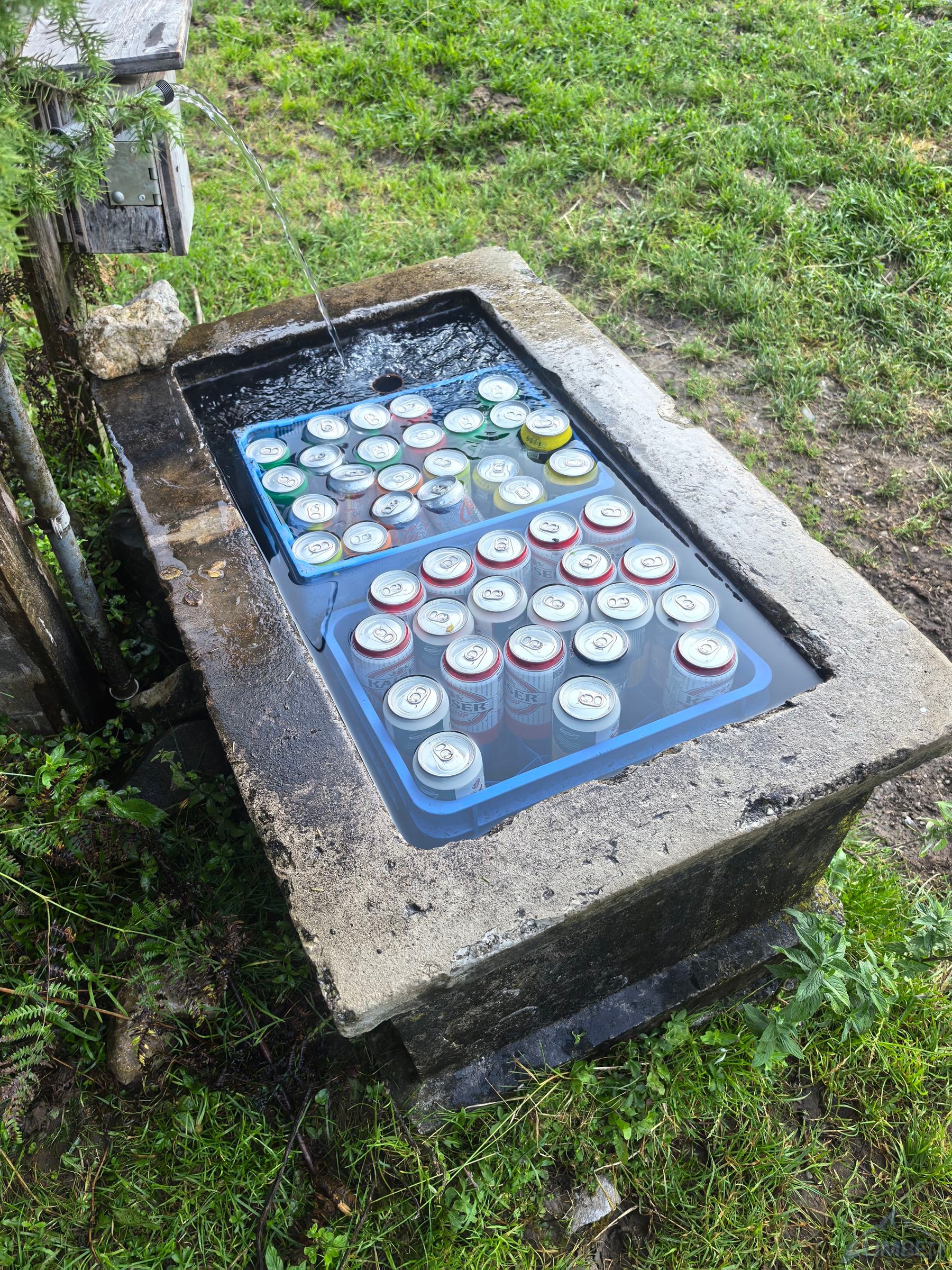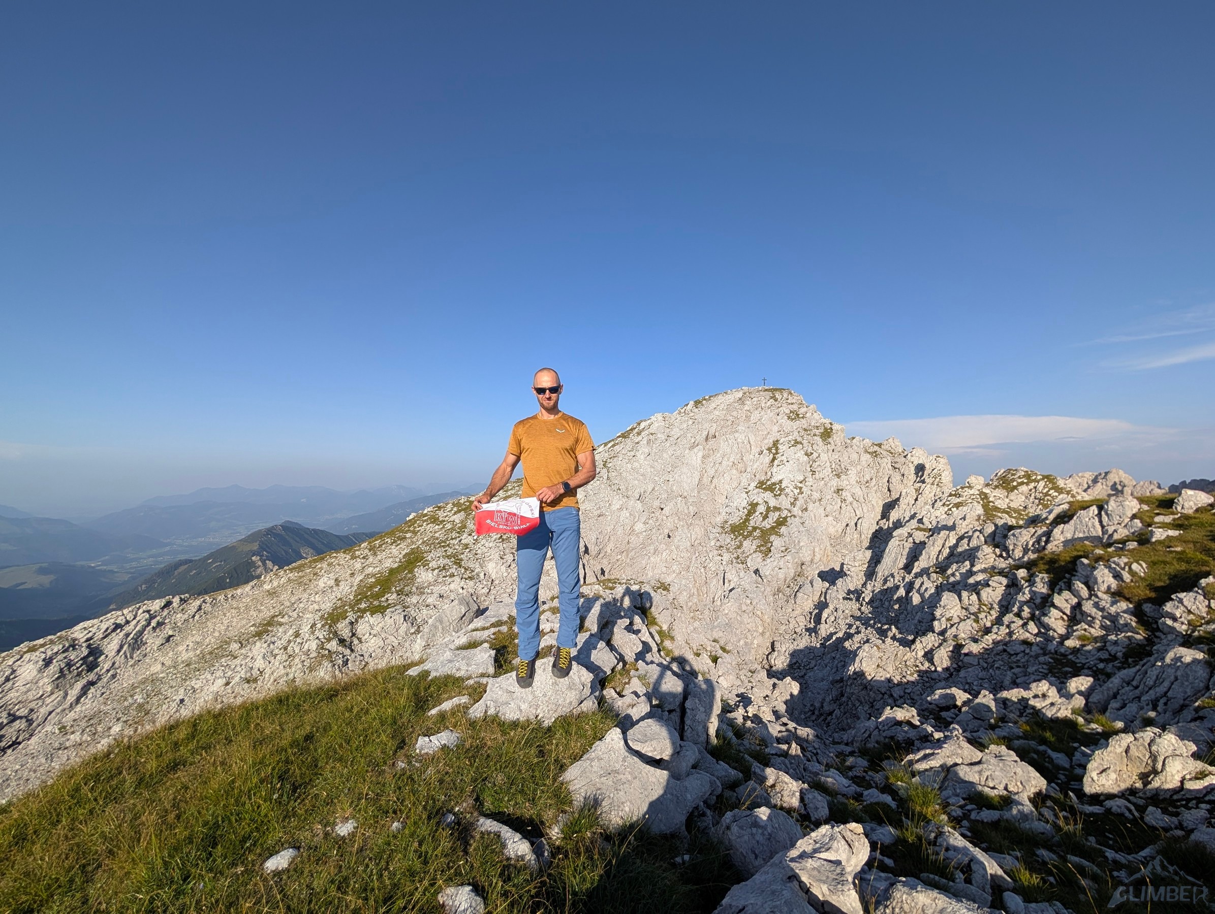 Na piku czekają piękne widoki i alpejska łąka, schodzimy oznaczonym szlakiem na zachód – przez położony obok szczyt Kopfkraxen i dalej granią z której w dół do doliny. Nie mając już od dłuższego czasu wody ochoczo biegniemy do umiejscowionego obok szlaku „punktu orzeźwienia” składającego się z wanienki zapełnionej piwem i innymi napojami oraz skrzyneczką na opłaty. Świetny patent aczkolwiek obawiam się, że u nas nie byłoby ani puszek ani skarbonki 😊.