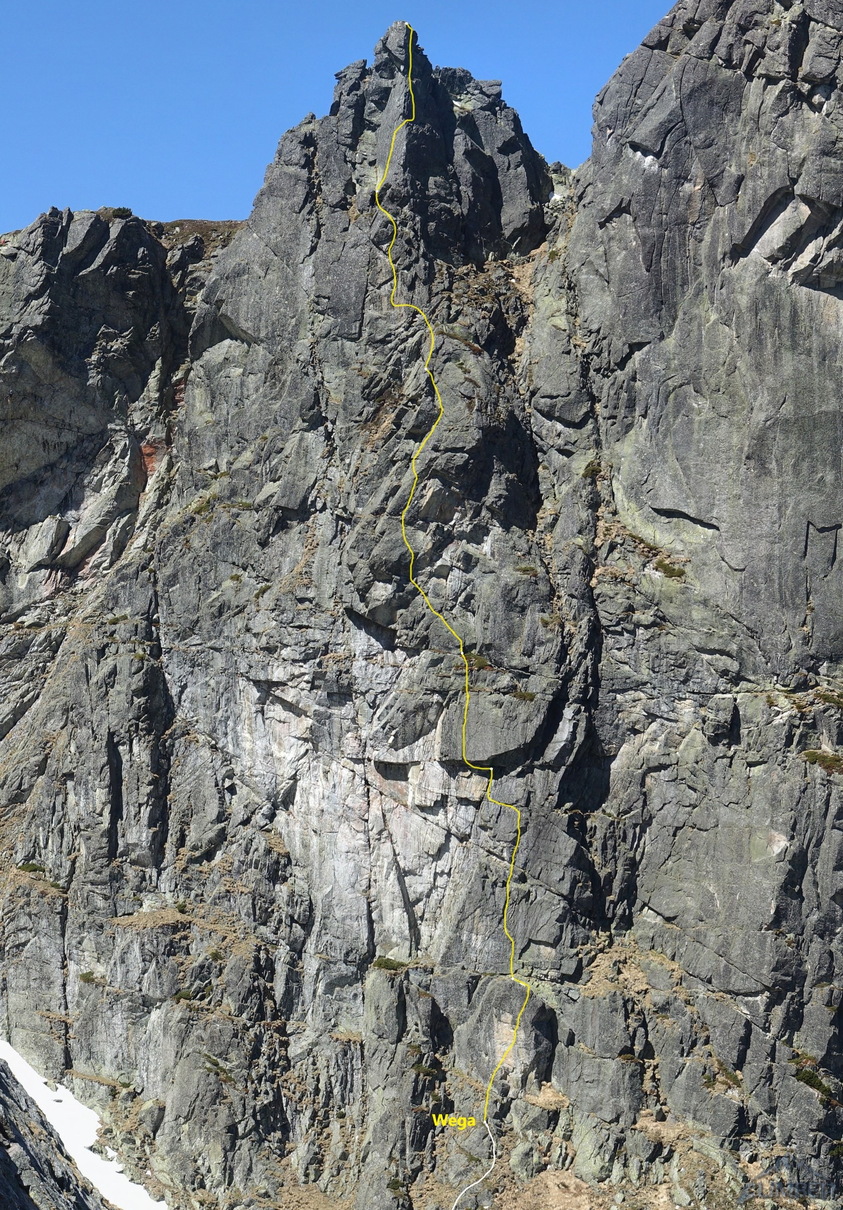 Dzień po wspinaniu po słowackiej stronie Tatr wybieram się z Damianem na Wegę (VIII+ 160m) na Mniszku. Droga okazuje się świetna - oferuje różnorodne wspinanie o dużej intensywności, do przejścia są bowiem cztery ósmekowe i dwa siódemkowe wyciągi w zaskakująco dobrej skale. Klasą porównać można ją do American Beauty na sąsiedniej ścianie (relacja z tego wielkiego klasyka TUTAJ), wymaga jednak zakładania własnej asekuracji – na wyciągu przez Okap Śmigło całkowicie, na pozostałych częściowo w łatwiejszym terenie. Z pewnością jest to jedna z lepszych linii w tych trudnościach w Tatrach i mimo niewielu przejść do tej pory zasługuje na miano nowoczesnego klasyka!