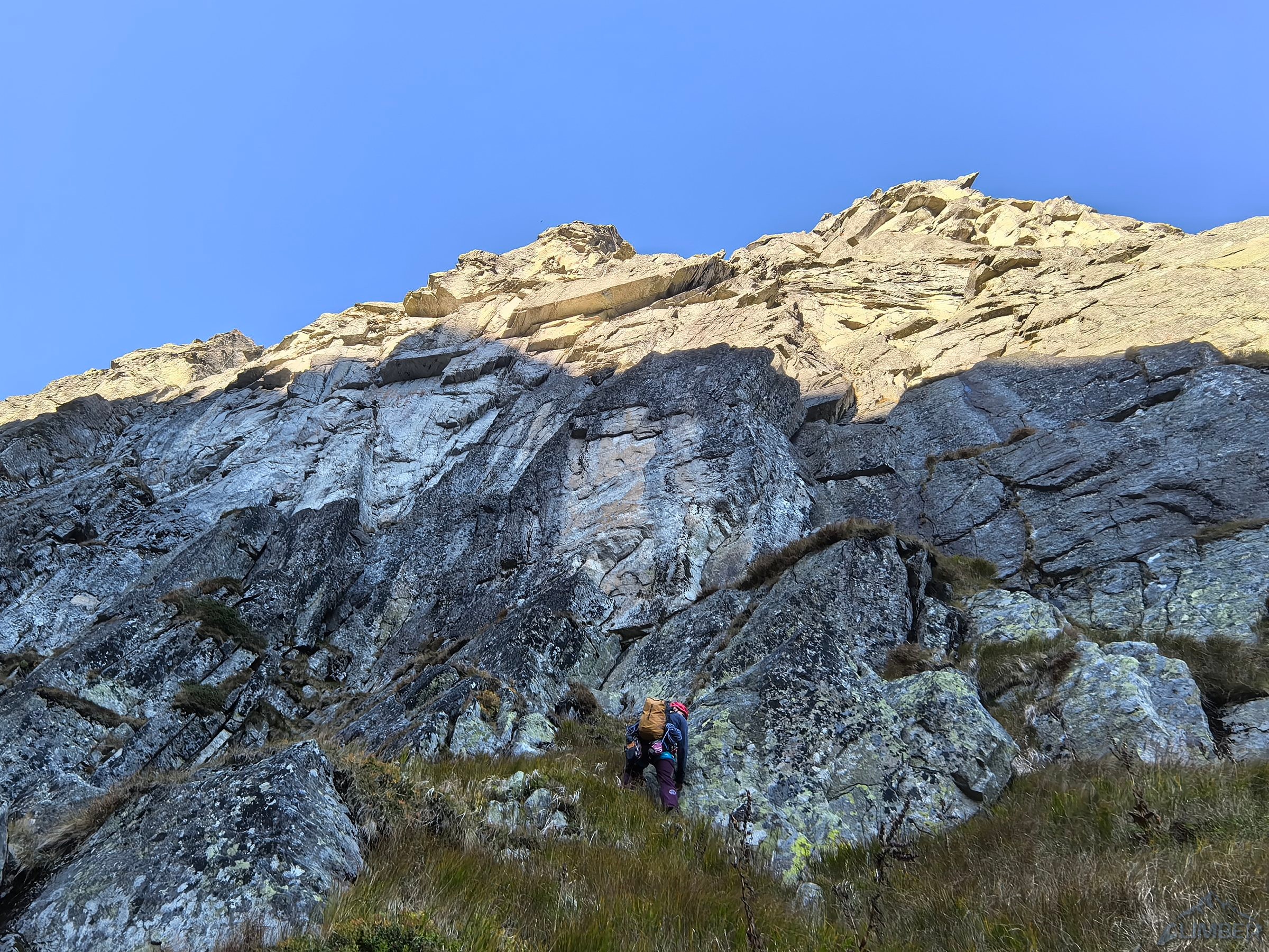 Pod drogę dostajemy się ze Żlebu Mnichowego podchodząc około 50 metrów w stromym trawiastym terenie – idziemy kawałek ścieżką jak pod Direttissimę (jej opis TUTAJ), po czym odbijamy w prawo obchodząc skały i wracamy w lewo do łańcucha pod charakterystyczną Płytą Epigonów. Próbę przejścia OS-em pierwszego, kluczowego wg schematu wyciągu (VIII+) podejmuje Damian – po długiej walce radzi sobie z cruxem w dość wymagający sposób, niestety kilka metrów przed końcem odpada. Moje podejście kończy się zaraz po wejściu w trudności, próbuję jednak znaleźć inny sposób przejścia - udaje się więc pozostaje powtórzyć i dociągnąć do końca. Wyciąg jednak nie puszcza tak łatwo - oddajemy jeszcze po dwie próby i dopiero moje trzecie podejście okazuje się skuteczne. Po wyjściu na taras trzeba przejść kilka metrów w lewo i założyć stanowisko (spit i hak), partnera najlepiej wpiąć do odpowiednio przedłużonej liny by uniknąć tarcia o kant oraz sporego wahadła.