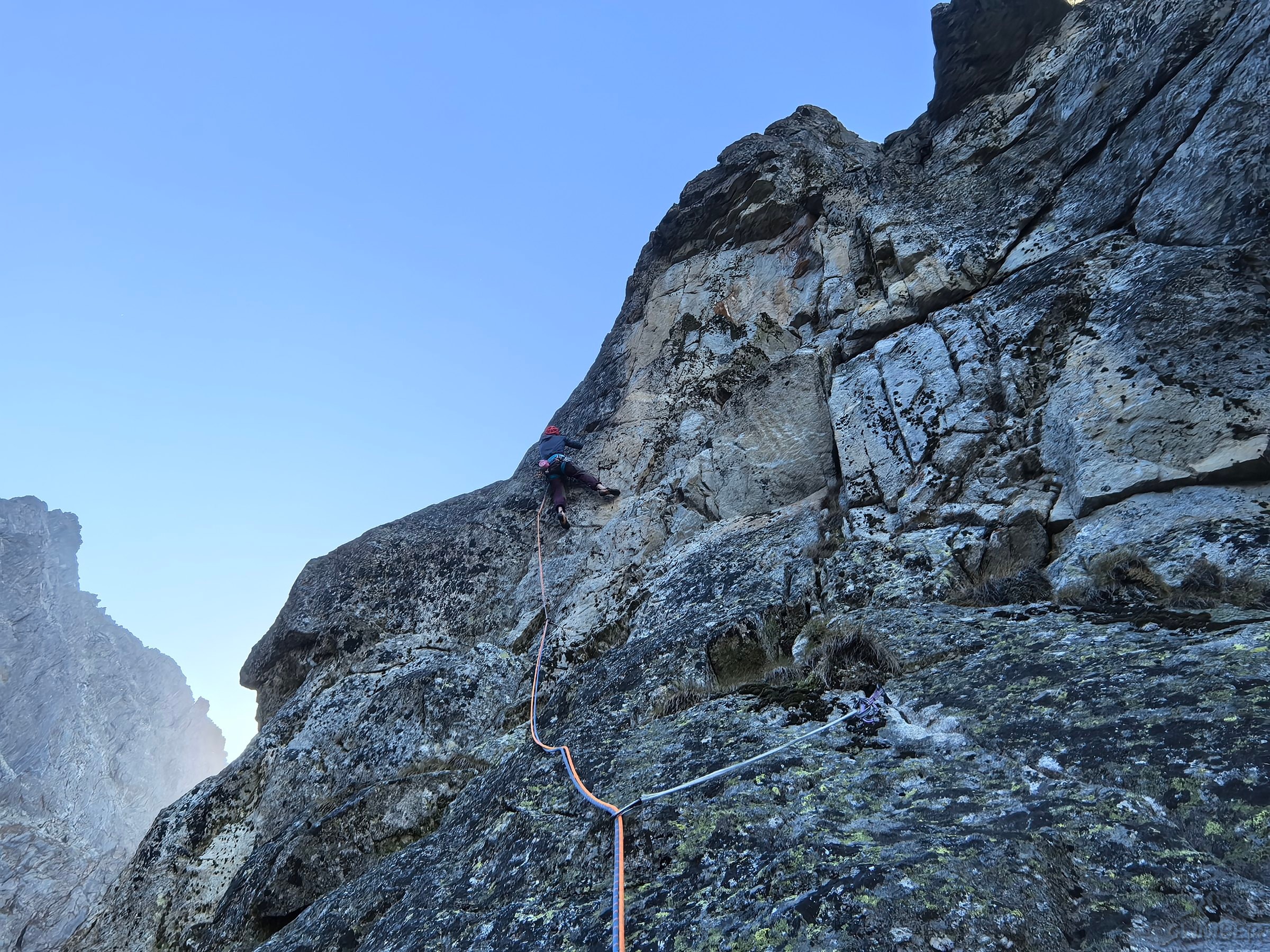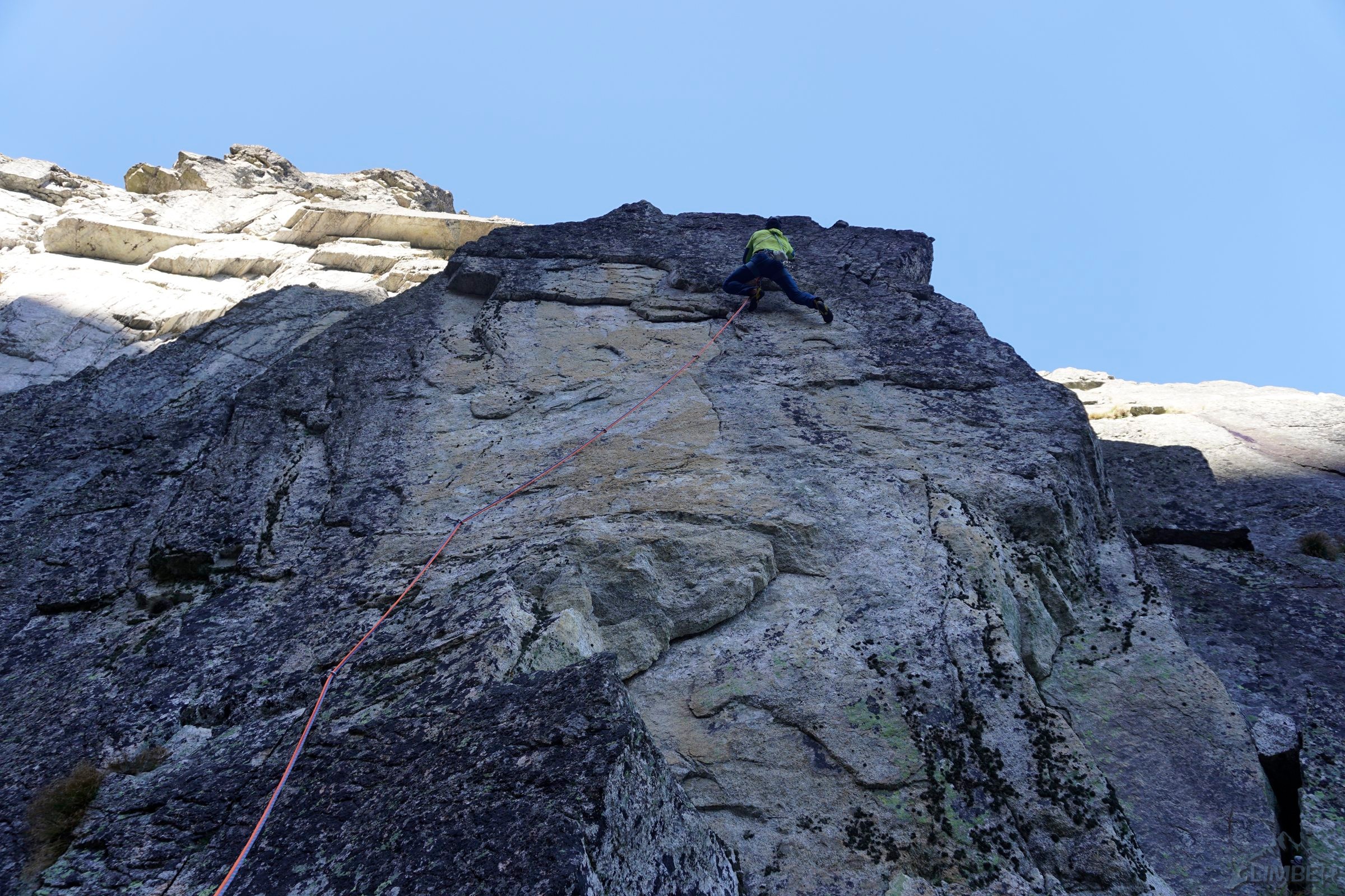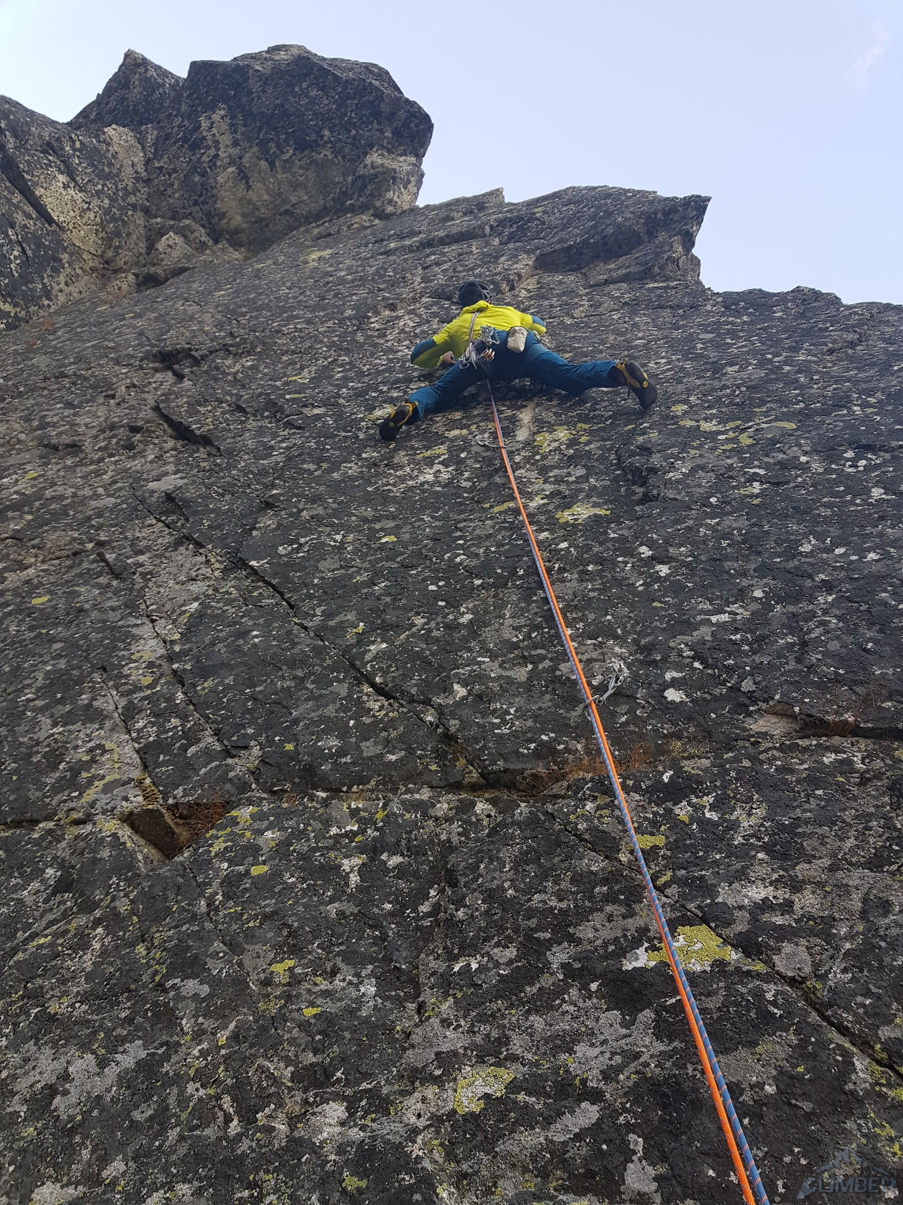 Drugi wyciąg zaczynamy spękaną ścianką z Kantu Gierycha (ok. VI, hak i własna asekuracja), po czym z półki idziemy kawałek zacięciem i przewijamy się przez filarek w lewo na płytę. Tutaj techniczne wspinanie po odciągach (VII+, 3 spity) doprowadza do poziomego pęknięcia, którym trawersujemy w lewo i odbijamy do góry do stanowiska pod Okapem Śmigło. Damian radzi sobie z tym wyciągiem OS-em i zgodnie z naszym planem zabiera się od razu za kolejny. Zaczynamy od trawersu pod okapem w lewo do wyraźnego pęknięcia i po jego sforsowaniu (VIII-) kontynuujemy rysą w litej eksponowanej płycie do stanowiska – na tym wyciągu asekurujemy się wyłącznie własnym sprzętem, zestaw 0,3-2# w zupełności wystarcza. Ponownie udaje się w pierwszej próbie więc cieszymy się, że udało się nadrobić trochę czasu – jak się okaże przyda się później 😉.