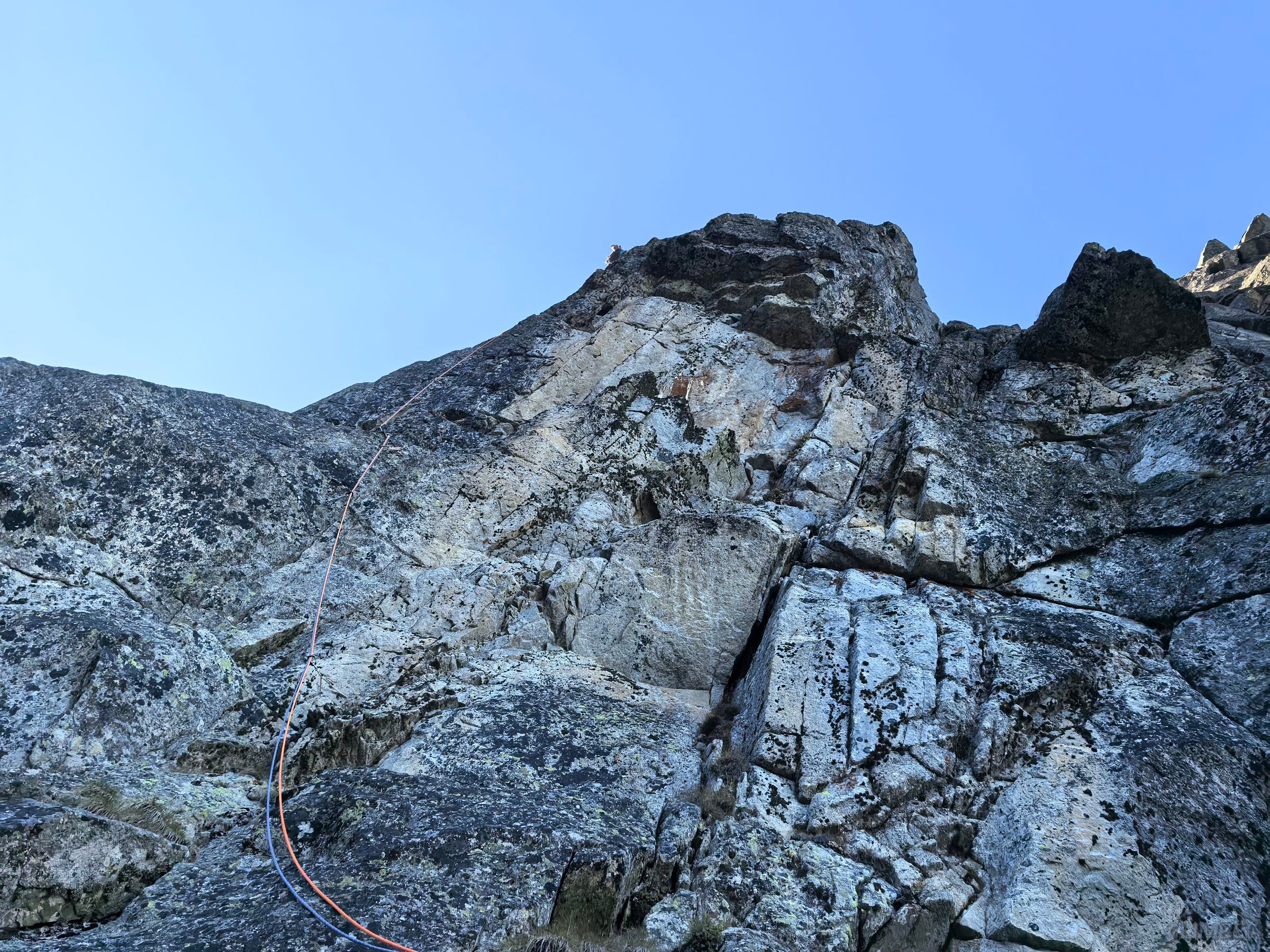 Czwarty odcinek zaczynamy od łatwego podejścia skośnie w lewo do krótkiej przewieszonej ścianki, pokonujemy ją bulderową sekwencją (VIII, spity) i wychodzimy na połogą płytę. Z niej wchodzimy do ciasnego zacięcia (ok. VII) i w dogodnym miejscu przewijamy się w lewo za kant, gdzie czeka jeszcze spękana płyta prowadząca na półkę w filarze. Tym razem moja kolej na prowadzenie – nie odczytuję prawidłowo cruxa, po chwili jednak rozpracowuję problem i przekazuję szczegółowe informacje koledze, który sprawnie przechodzi całość fleszem.