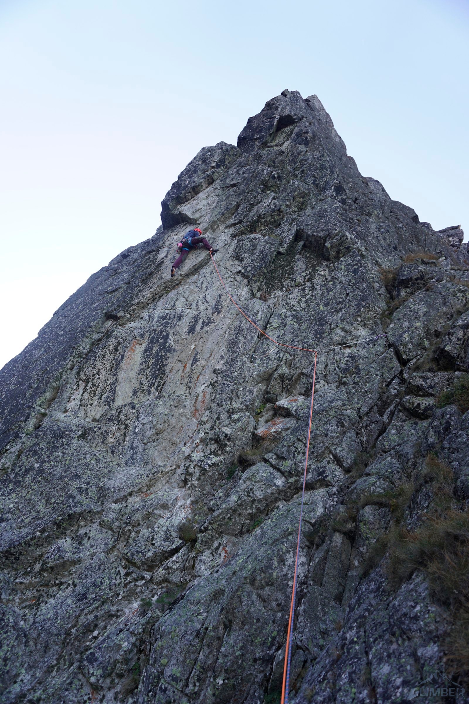 Na ostatnim wyciągu (VII) mam nadzieję, że nie będzie powtórki z rozrywki – na szczęście tym razem udaje się od strzału. Wspinamy się po krawądkach litą Czarną Płytą i po czwartej wpince trawersujemy technicznie w prawo za kant, gdzie kontynuujemy wzdłuż rys (łatwiej) na własnej asekuracji prosto na wierzchołek. Wracamy zjazdami wzdłuż linii drogi (45m pod L5, 35m, 55m aż do stanowiska startowego i z niego 40m do żlebu). Pod ścianą meldujemy się o zmroku, udało się więc klasycznie rzutem na taśmę - dzięki temu mieliśmy jednak dwa razy więcej fajnego wspinania i dobrą lekcję z motywacji 😉. Drogę oczywiście bardzo polecamy!
