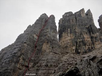 Krótka relacja z Zacięcia Północnego (IV+) na Torre RomanaArmidy (VI) na Torre Grande w masywie Cinque Torri, podczas obozu KW BB w Dolomitach. Po dwóch deszczowych dniach pogoda nareszcie się poprawia, wszyscy obozowicze ruszają więc do działania - jutro ponownie ma lać... Wraz z Jurasem i Bartkiem na cel obieramy Zacięcie Północne czyli tzw. „Wiewiórki”, pod którym byliśmy już dwa dni wcześniej. Droga nie jest taka przyjemna na jaką wygląda z dołu – wspinamy się bowiem bardziej kominem niż zacięciem, trzeba się przewijać to w prawo to w lewo. Mimo iż droga jest łatwa, wrażenie robi na nas lufa oraz brak półek na resty, trzeba się cały czas wspinać. Ponieważ to nasz pierwszy pobyt w Dolomitach, nie wiemy jeszcze, że tak jest tutaj na większości dróg 😊.