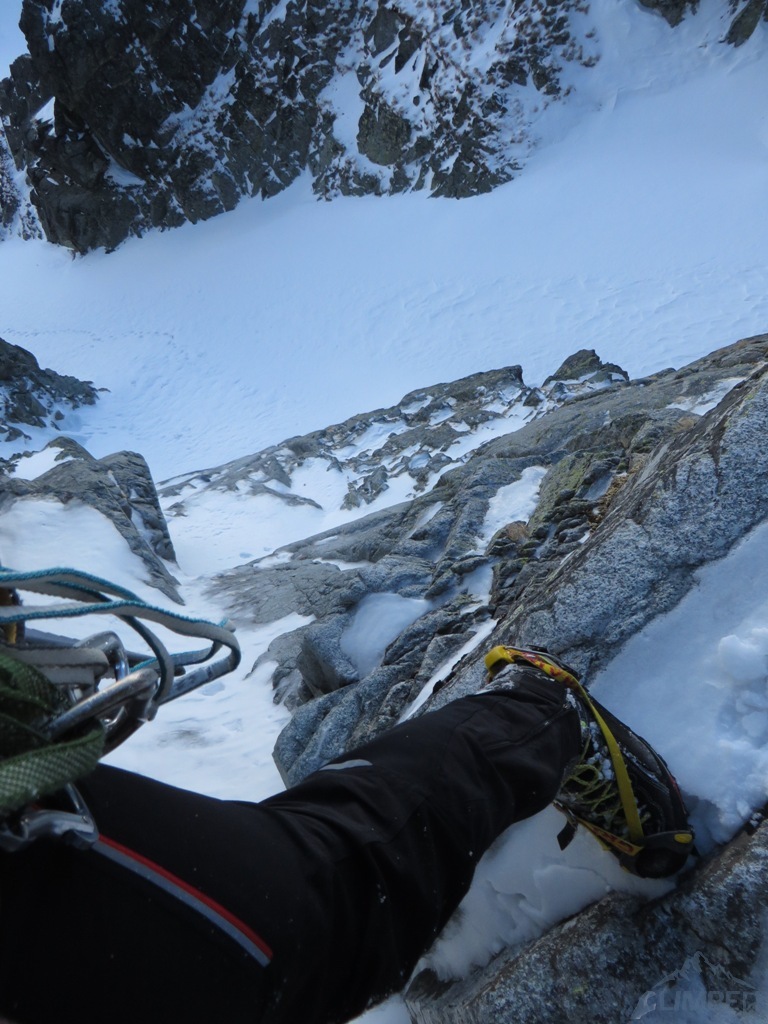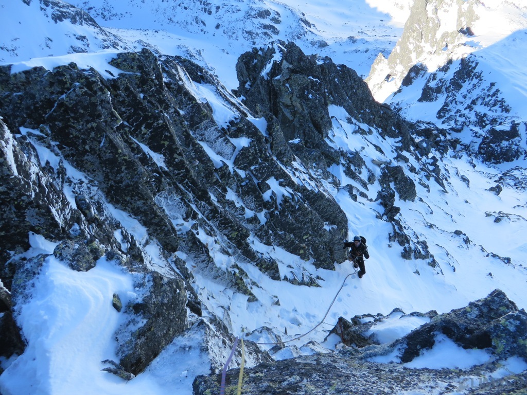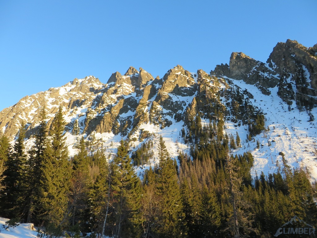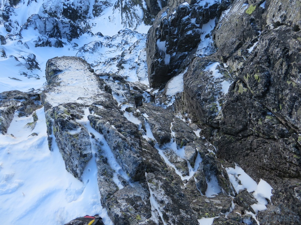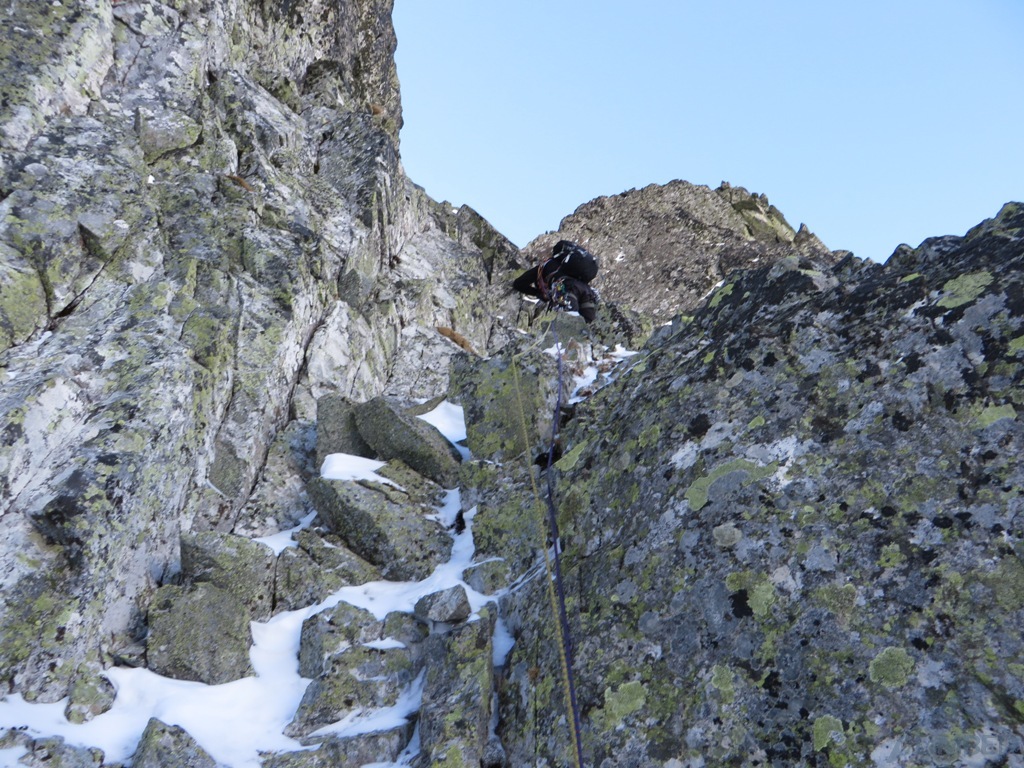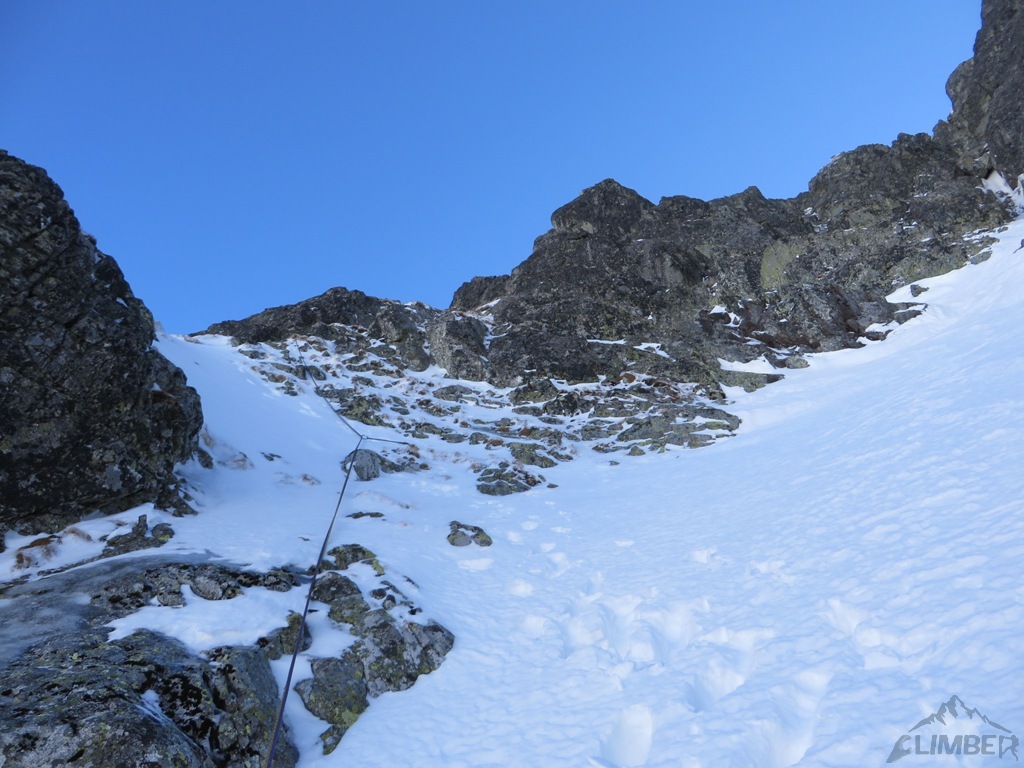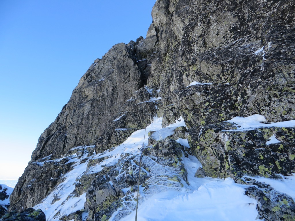 Przy takiej pięknej pogodzie żal byłoby nie być w Tatrach 😊. Nasz wybór tym razem pada na zachodnią wystawę Sławkowskiej Kopy i drogę Vlada Tatarki sprzed 40 lat – Jaminską vežičkę. Jak to często na Słowacji bywa wybór takiej drogi równa się przygodzie – nie dość, że chyba nie za wiele osób ją przechodzi (znaleźliśmy po drodze tylko 1 zamarzniętą taśmę!), to jeszcze musieliśmy zmierzyć się z luźnymi głazami w trudnościach. W opisie jest 9 wyciągów, nam wyszło 5 + 2 na lotnej, droga jest bardzo ciekawa i warto ją zrobić! Po zakończeniu wspinania ze Sławkowskiej Kopy udaliśmy się granią na Sławkowski Szczyt - warto rozważyć tą opcję chociażby dla widoków.