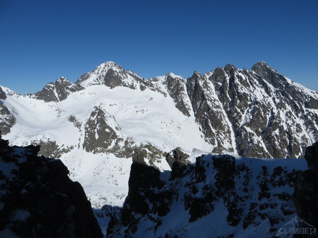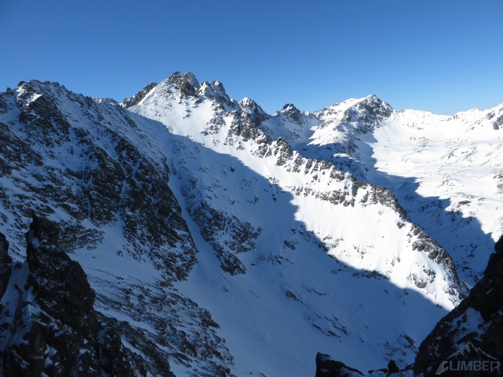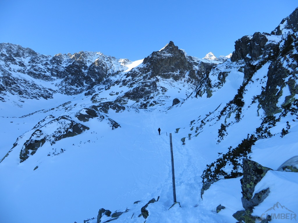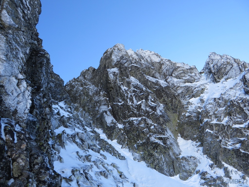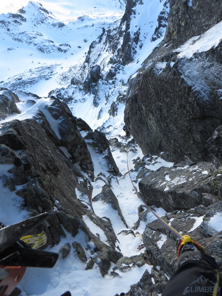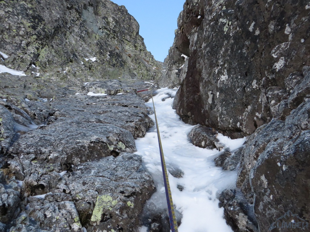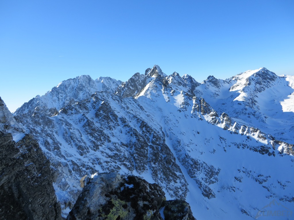 Przy takiej pięknej pogodzie żal byłoby nie być w Tatrach 😊. Nasz wybór tym razem pada na zachodnią wystawę Sławkowskiej Kopy i drogę Vlada Tatarki sprzed 40 lat – Jaminską vežičkę. Jak to często na Słowacji bywa wybór takiej drogi równa się przygodzie – nie dość, że chyba nie za wiele osób ją przechodzi (znaleźliśmy po drodze tylko 1 zamarzniętą taśmę!), to jeszcze musieliśmy zmierzyć się z luźnymi głazami w trudnościach. W opisie jest 9 wyciągów, nam wyszło 5 + 2 na lotnej, droga jest bardzo ciekawa i warto ją zrobić! Po zakończeniu wspinania ze Sławkowskiej Kopy udaliśmy się granią na Sławkowski Szczyt - warto rozważyć tą opcję chociażby dla widoków.