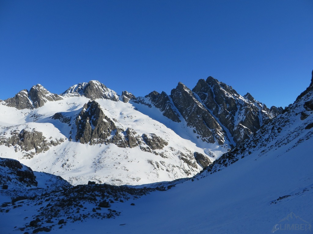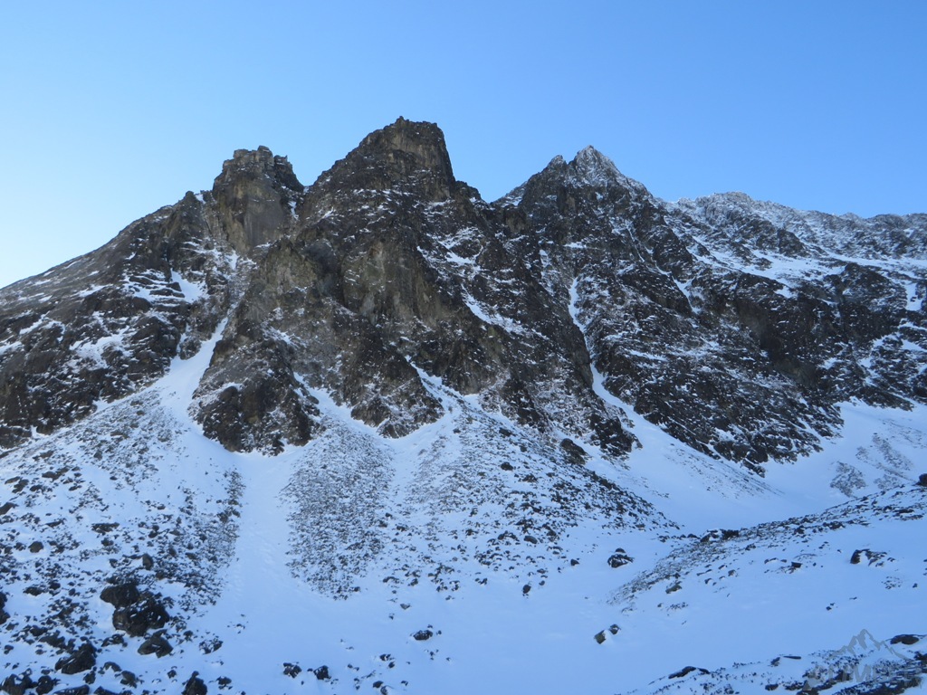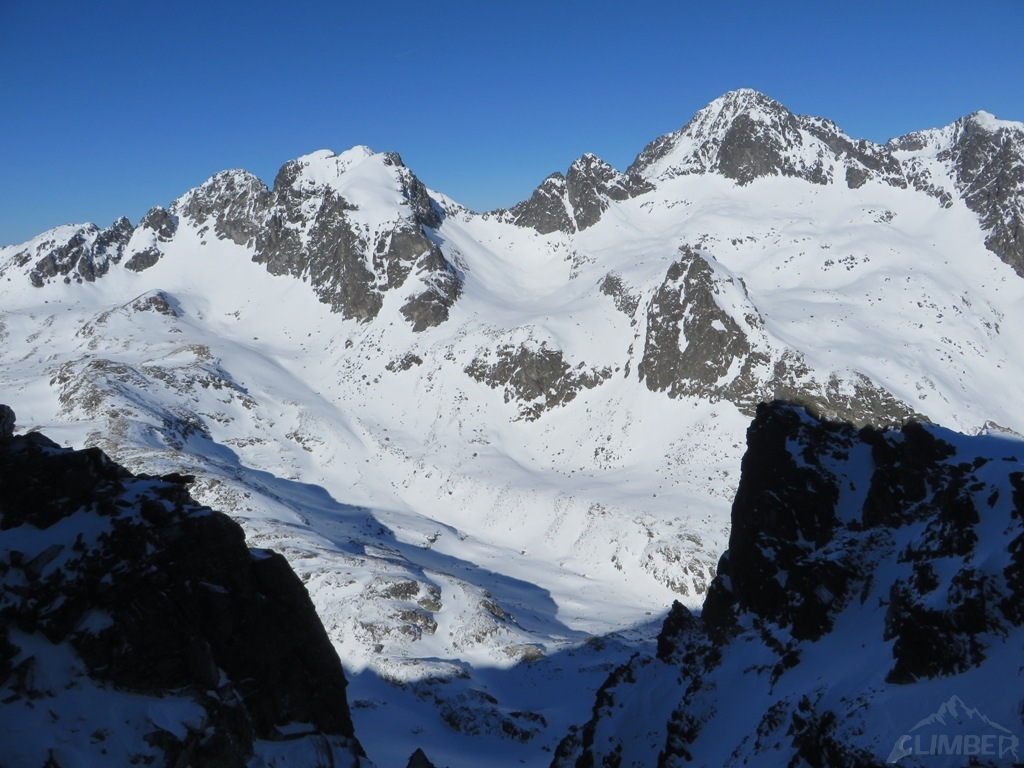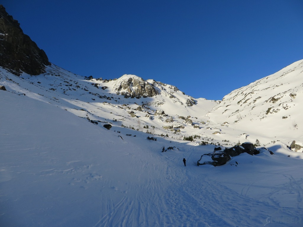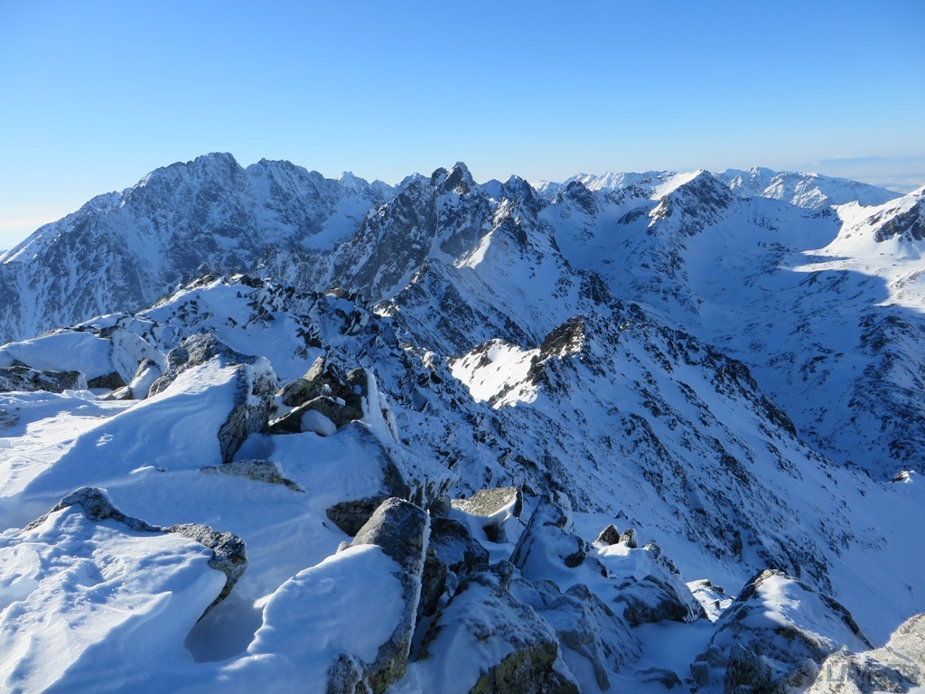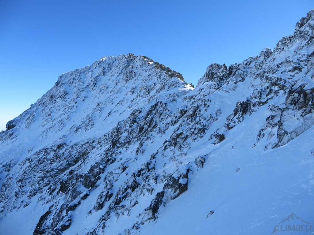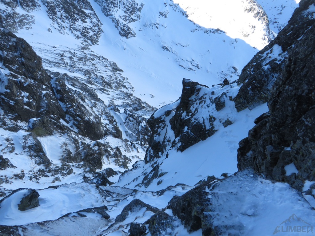 Przy takiej pięknej pogodzie żal byłoby nie być w Tatrach 😊. Nasz wybór tym razem pada na zachodnią wystawę Sławkowskiej Kopy i drogę Vlada Tatarki sprzed 40 lat – Jaminską vežičkę. Jak to często na Słowacji bywa wybór takiej drogi równa się przygodzie – nie dość, że chyba nie za wiele osób ją przechodzi (znaleźliśmy po drodze tylko 1 zamarzniętą taśmę!), to jeszcze musieliśmy zmierzyć się z luźnymi głazami w trudnościach. W opisie jest 9 wyciągów, nam wyszło 5 + 2 na lotnej, droga jest bardzo ciekawa i warto ją zrobić! Po zakończeniu wspinania ze Sławkowskiej Kopy udaliśmy się granią na Sławkowski Szczyt - warto rozważyć tą opcję chociażby dla widoków.