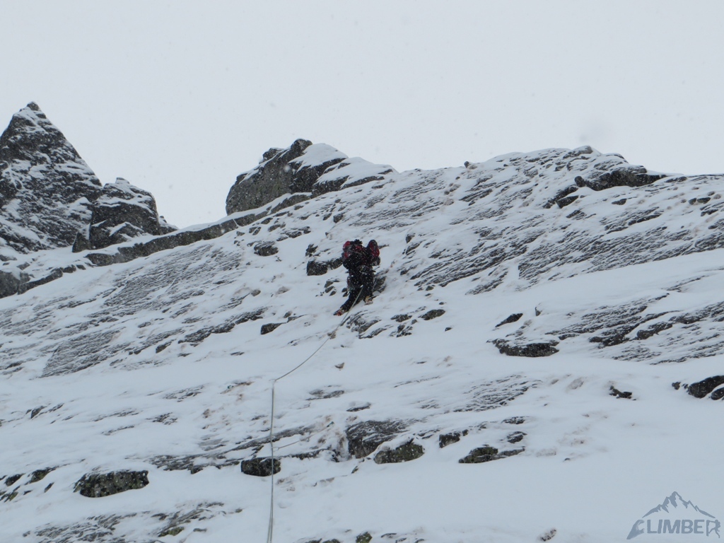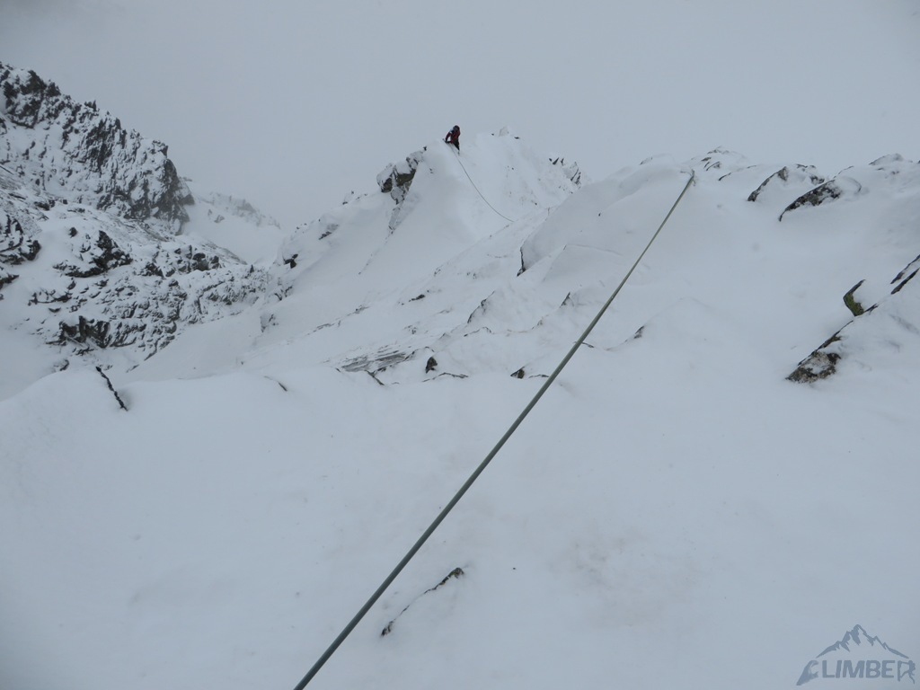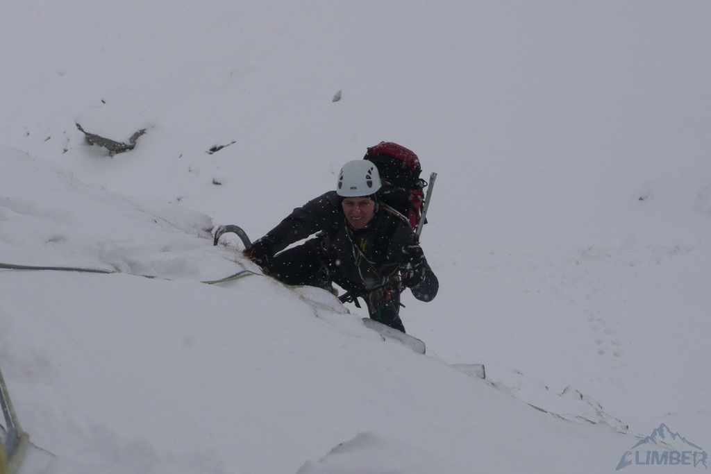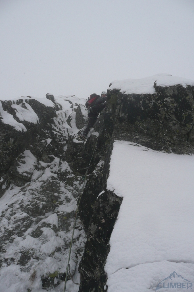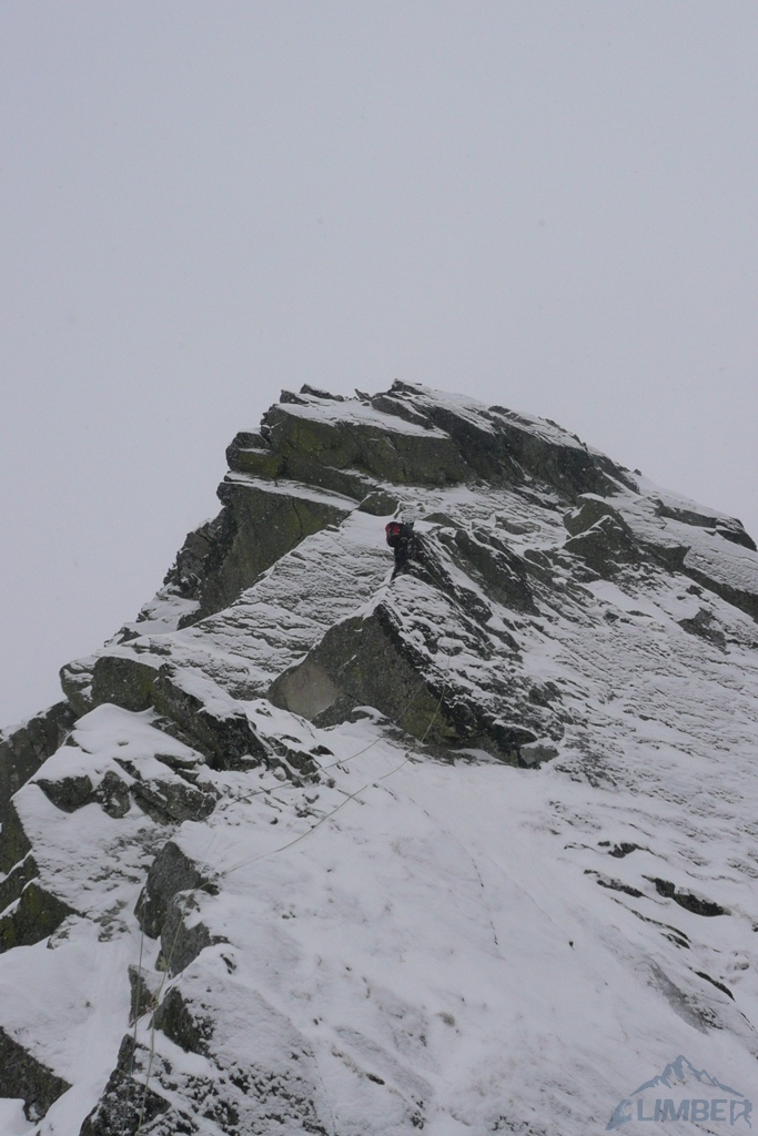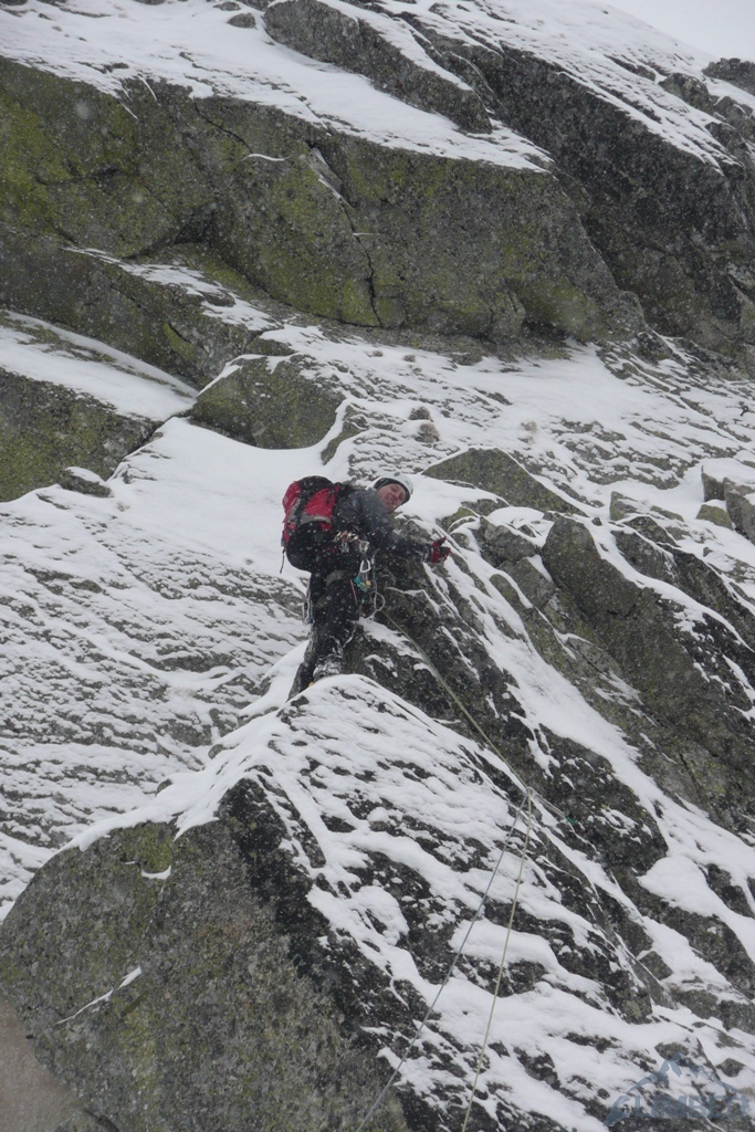Drugi dzień pobytu na Hali, pogoda nadal do bani 😉. Warunki mało sprzyjające - wszystkie płyty zasypane świeżym śniegiem, wyszukiwanie chwytów i stopni zajmowało sporo czasu, na dodatek mało co trzymało. Trzeci wyciąg zrobiony piątkowym wariantem (wg topo Kardasia). Droga to oczywiście klasyk, radziłbym jednak robić ją w miarę dobrych warunkach bo można się zdziwić i zabawić na niej dłużej niż się planowało...