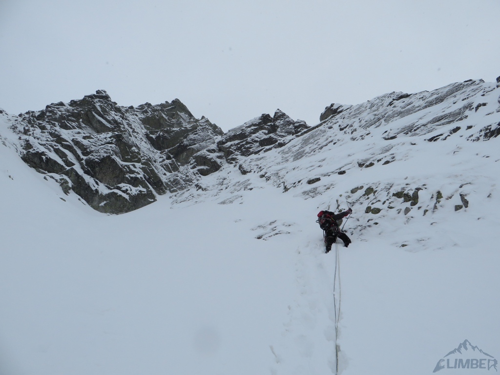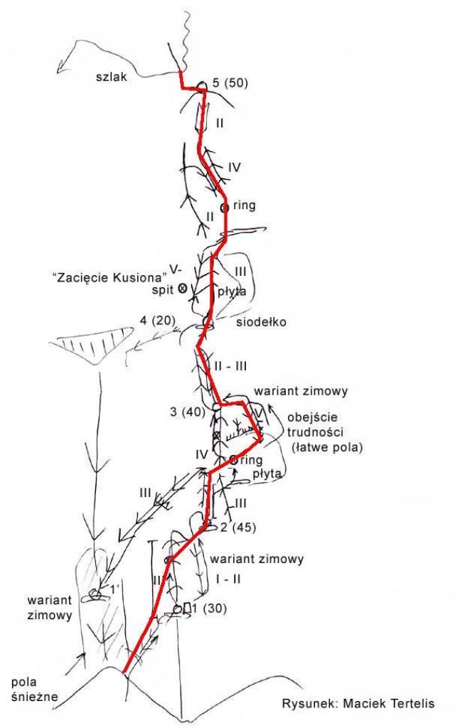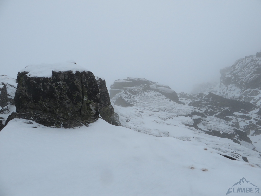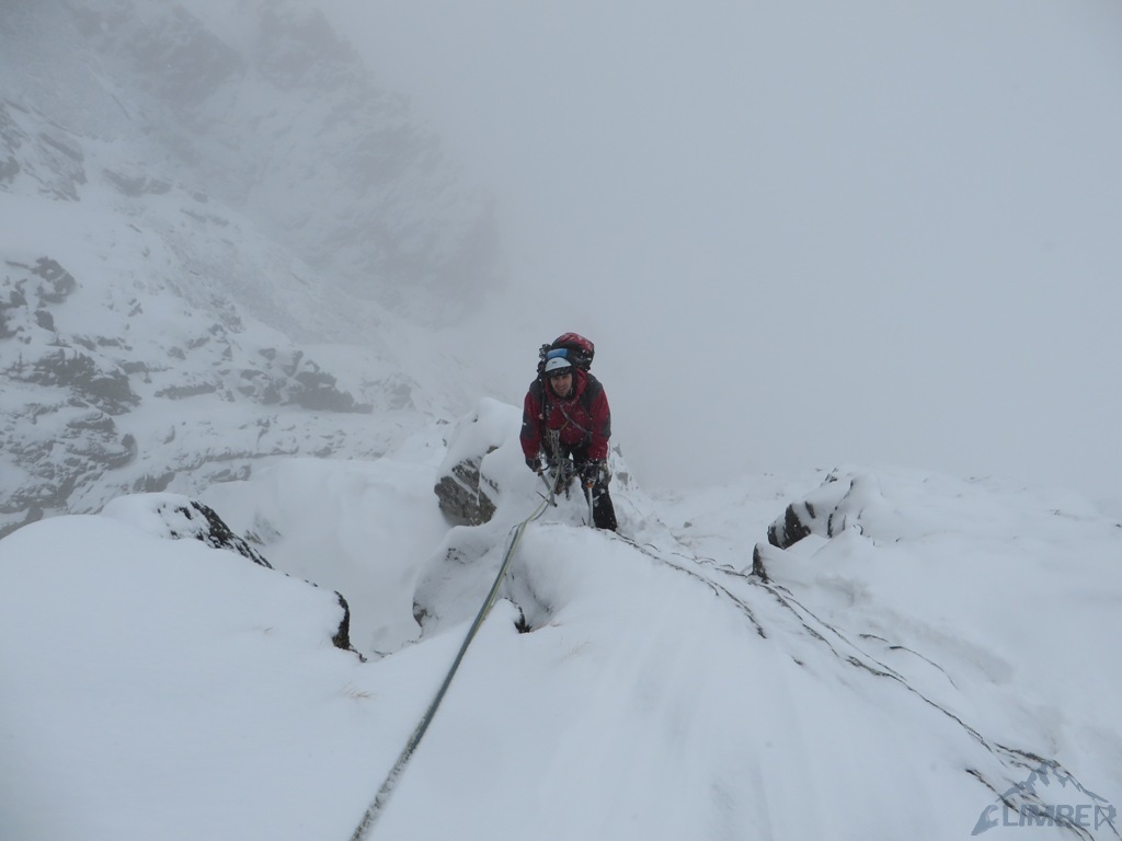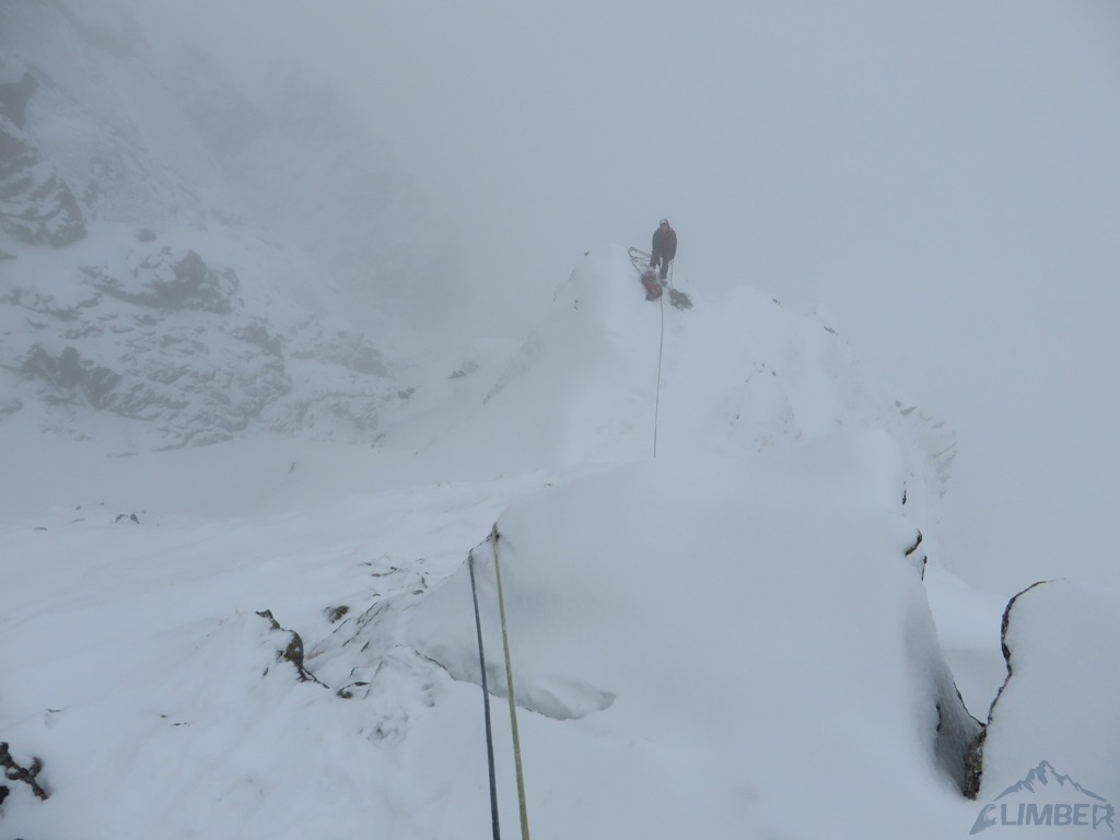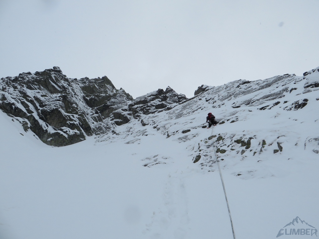 Drugi dzień pobytu na Hali, pogoda nadal do bani 😉. Warunki mało sprzyjające - wszystkie płyty zasypane świeżym śniegiem, wyszukiwanie chwytów i stopni zajmowało sporo czasu, na dodatek mało co trzymało. Trzeci wyciąg zrobiony piątkowym wariantem (wg topo Kardasia). Droga to oczywiście klasyk, radziłbym jednak robić ją w miarę dobrych warunkach bo można się zdziwić i zabawić na niej dłużej niż się planowało...