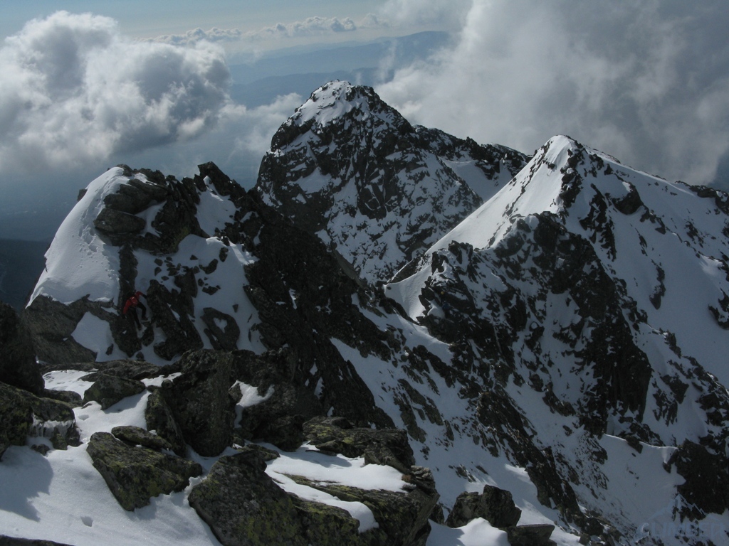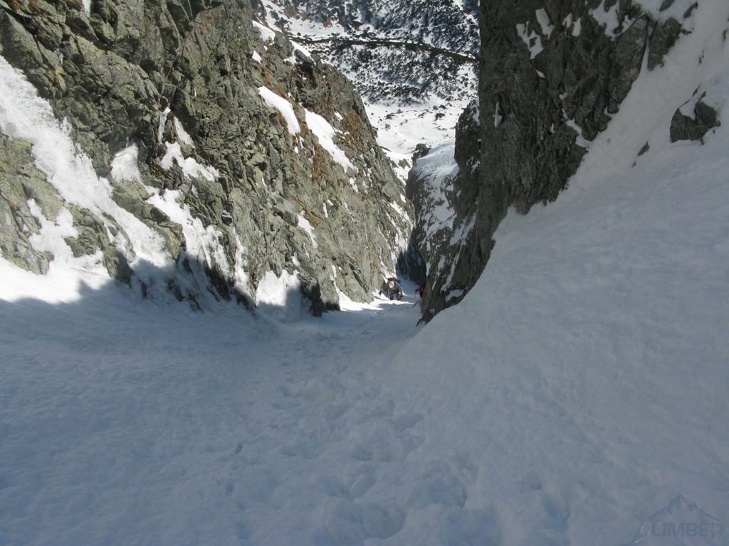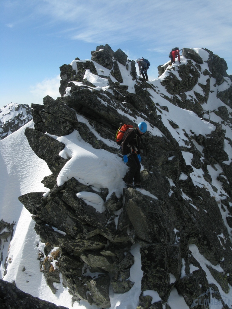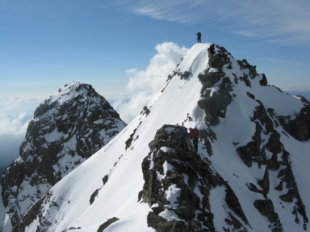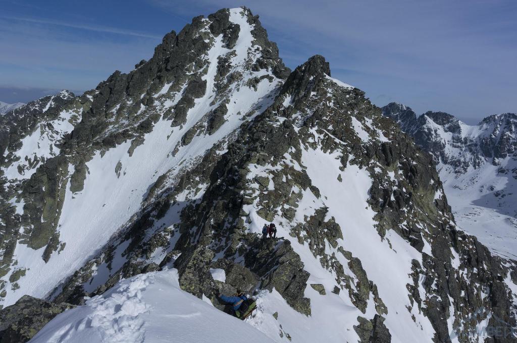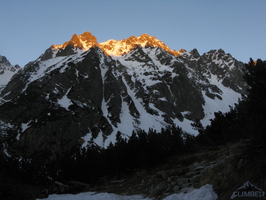 Pomysł na wejście na Szatana Czerwonym Żlebem podpatrzyłem od kolegi Łukasz (Madnessa) prowadzącego blog Mountain Adventure. Zbieramy sporą ekipę i wcześnie rano podchodzimy do Mięguszowieckiej. Warunki w żlebie są bardzo dobre, dlatego rezygnujemy z asekurowania się. Grań jest już łatwa, a na zejściu jedyne trudne miejsce pokonujemy zjazdem. Szybka i sprawna akcja i kolejna piękna góra zdobyta - tym razem drogą "prawie wspinaczkową".
