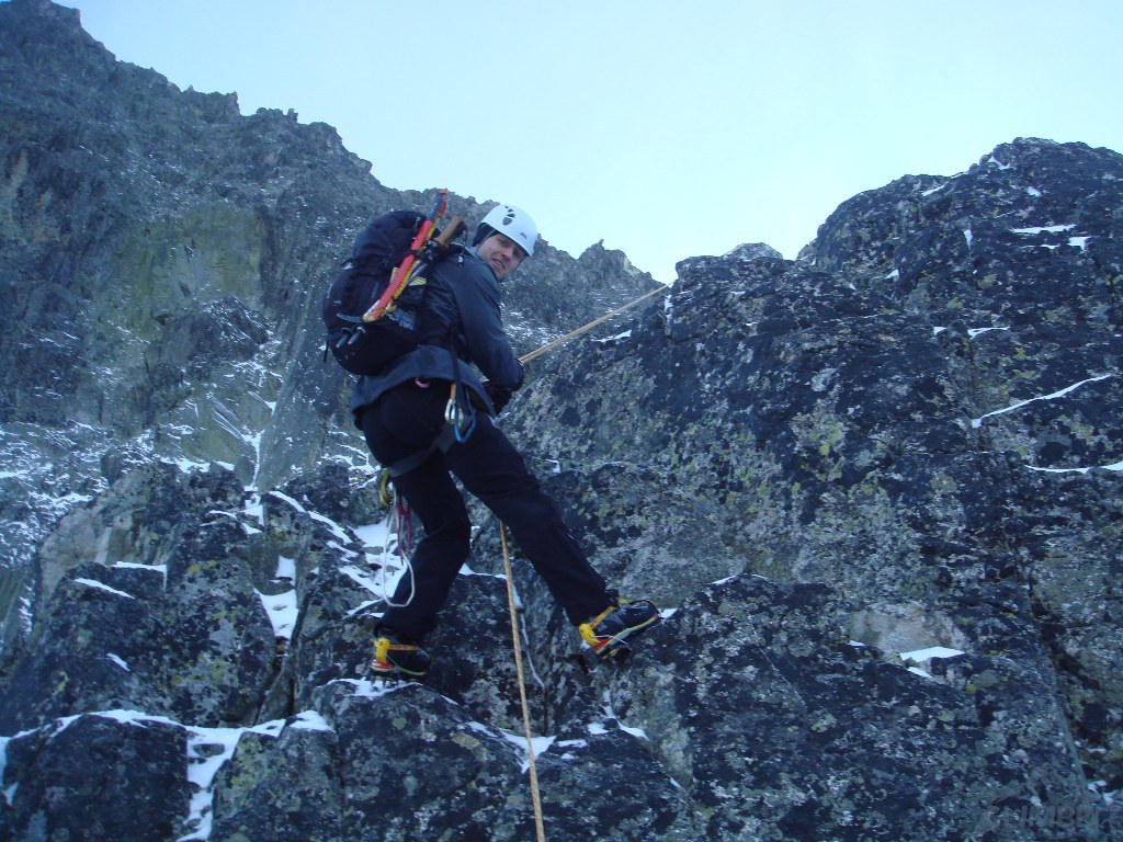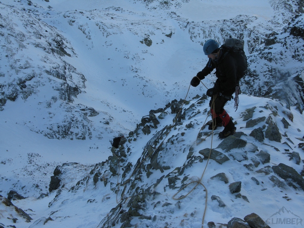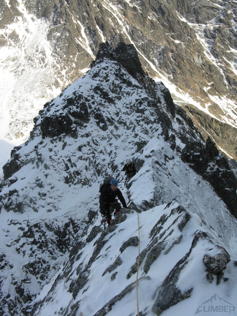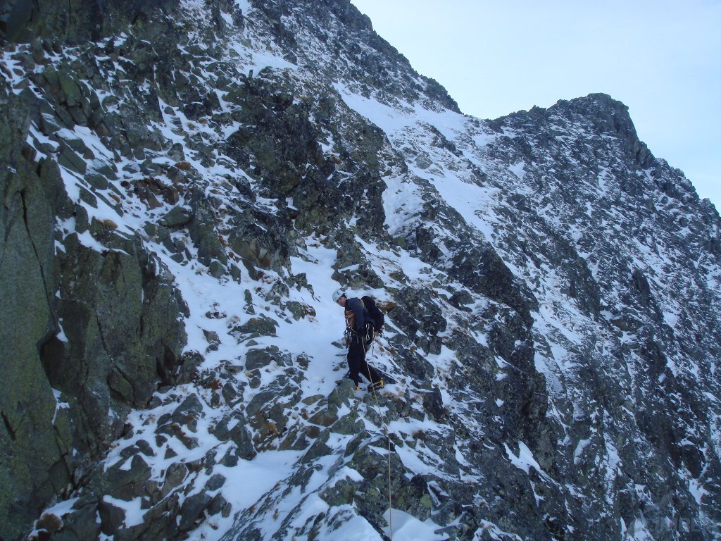 Następnego dnia po wejściu na Baranie Rogi ponownie podchodzimy do Terinki i atakujemy Pośrednią Grań. Niestety warunki śniegowe są bardzo złe - mnóstwo czasu zajmuje nam dotarcie na przełęcz za Żółtą Ścianą, a następnie przejście krótkiej grani doprowadzającej do Ławki Doubkego. Ta okazuje się mocno zabita śniegiem więc w końcu odpuszczamy dalszą walkę i zaliczamy odwrót.