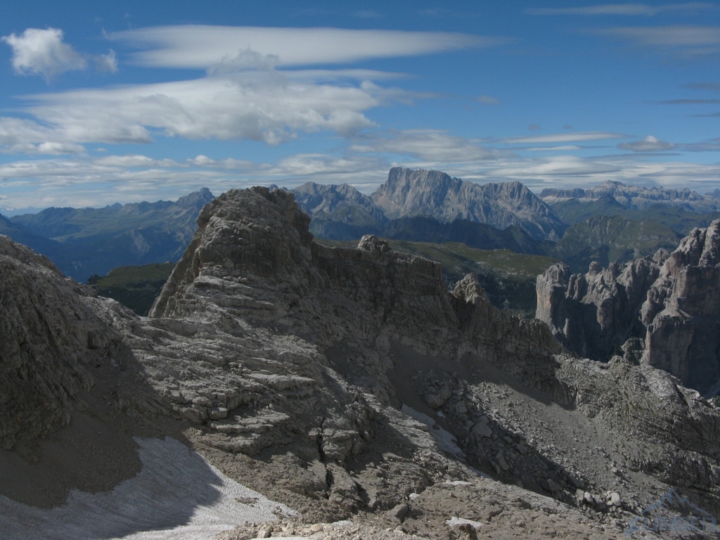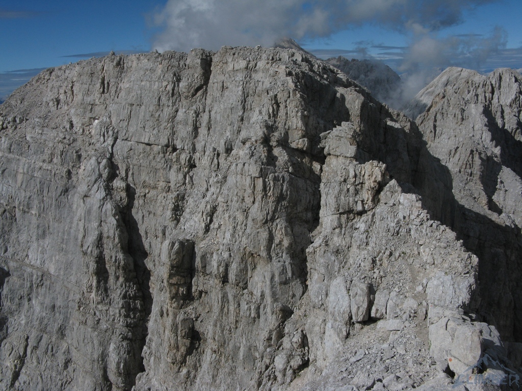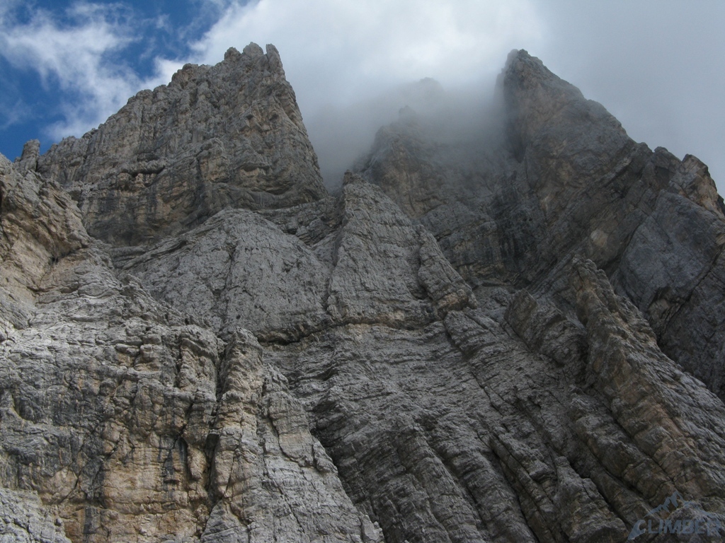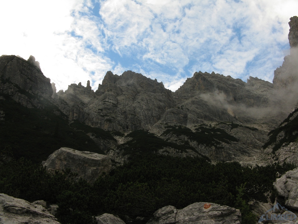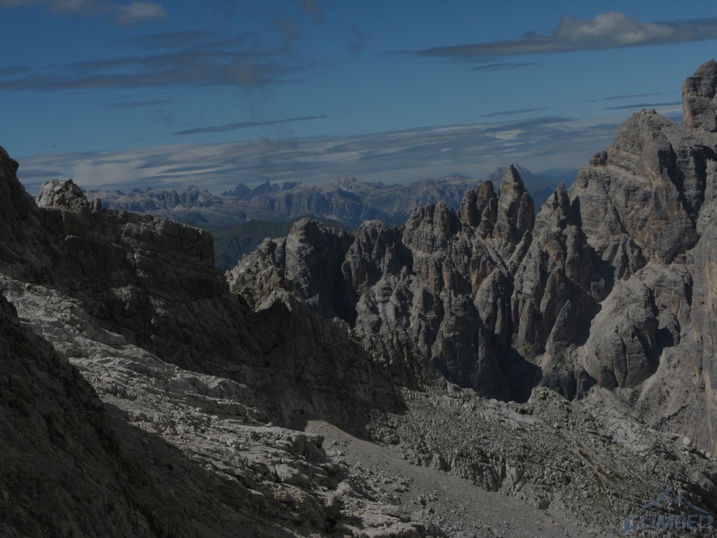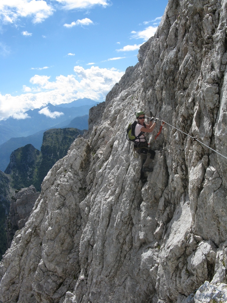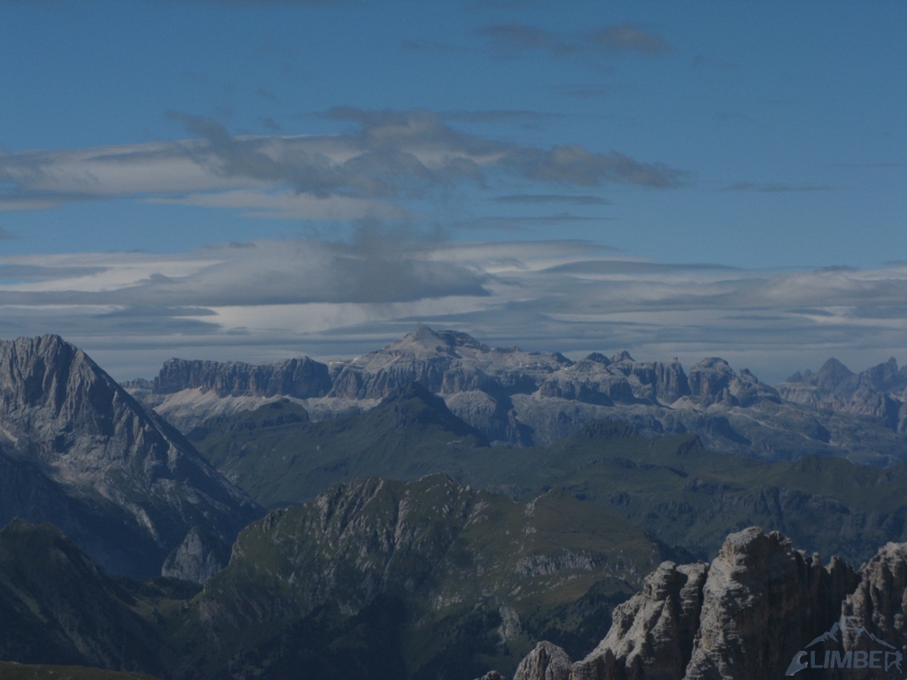 Na pierwszy cel obieramy masyw Moiazza . Wspólnie z Ulą przechodzę ferratę Constantini Ovest, a następnie sam wybieram się w kierunku szczytu, po drodze przechodząc krótką Cengia Angelini. Pod samym wierzchołkiem trochę się gubię i w konsekwencji zmuszony jestem do przewspinania krótkiego kominka. Udaje się i widokami z góry delektuję się w samotności.