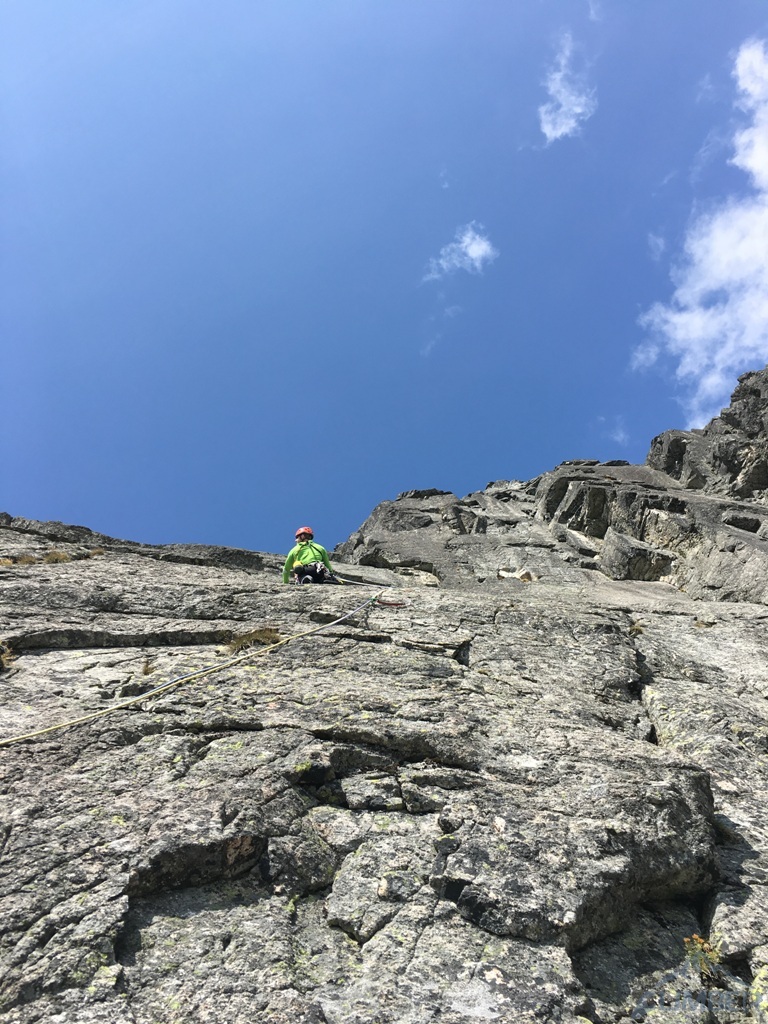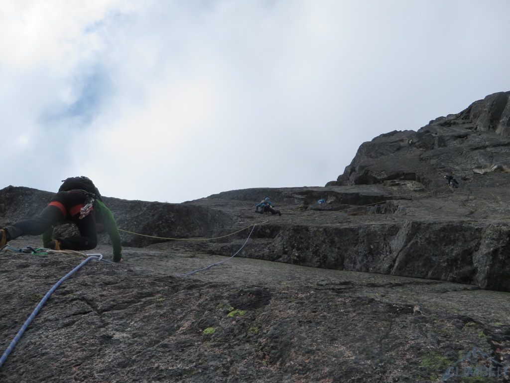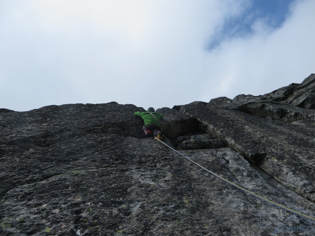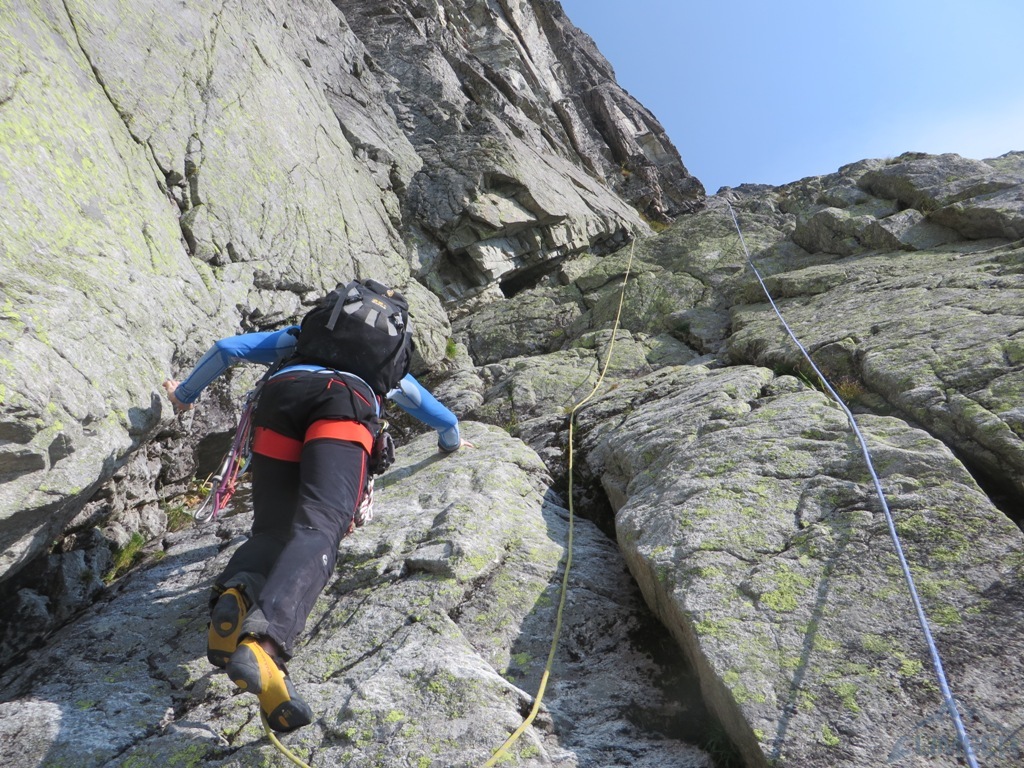 Na koniec przodem puszczamy Ryśka, któremu dziś przypada przyjemność prowadzenia kluczowego wyciągu. Od tego miejsca wspinanie robi się bardzo siłowe, ściana się pionuje a zrestować można dopiero nad półce pod cruxem, przy stanowisku pośrednim, które jednak kolega omija. Niestety nie okazuje się to dobrą decyzją bo po przejściu kluczowej ścianki z rysą lina się przesztywnia i Rysiek zmuszony jest budować swoje stanowisko w niewygodnym miejscu. Dochodzimy więc z Jackiem do stanu pośredniego i robimy porządek z liną, po czym „wypuszczamy” kolegę dalej – ma jeszcze kilka trudnych metrów, po czym wychodzi w łatwiejszy teren i ściąga nas do siebie. Crux to kilkumetrowa ładna płytka z pionową rysą, na szczęście „chwytliwą” i dobrze asekurowaną. Drogę kończymy po niecałych trzech godzinach i kontynuujemy już bez liny pod wierzchołek. Rachunki wyrównane, satysfakcja osiągnięta, „głód” wspinania i eksploracji zaspokojony 😊.
