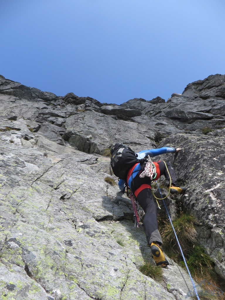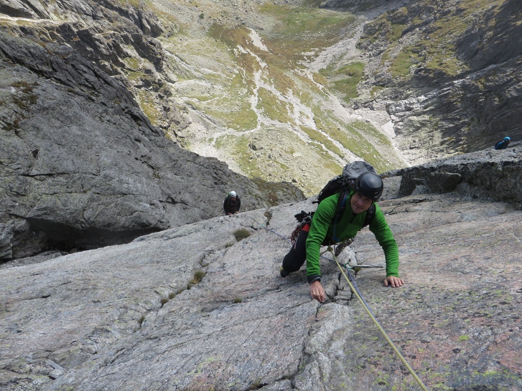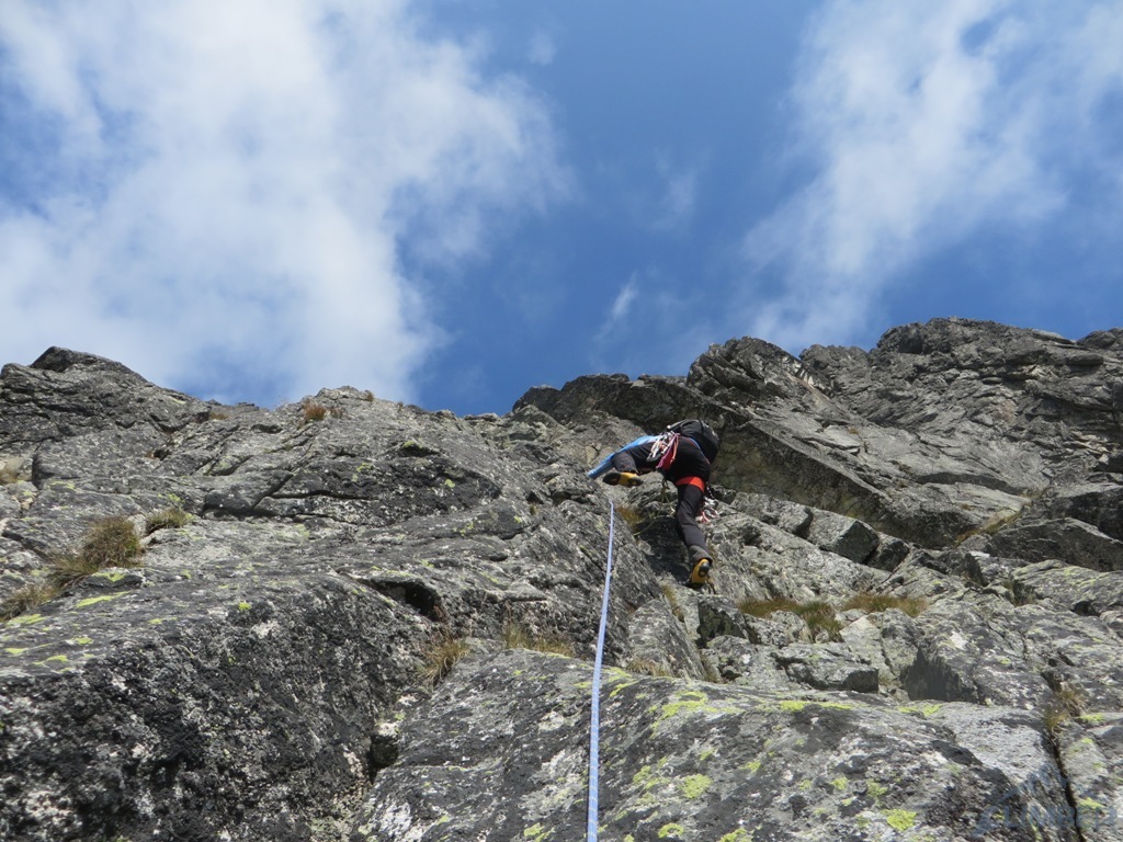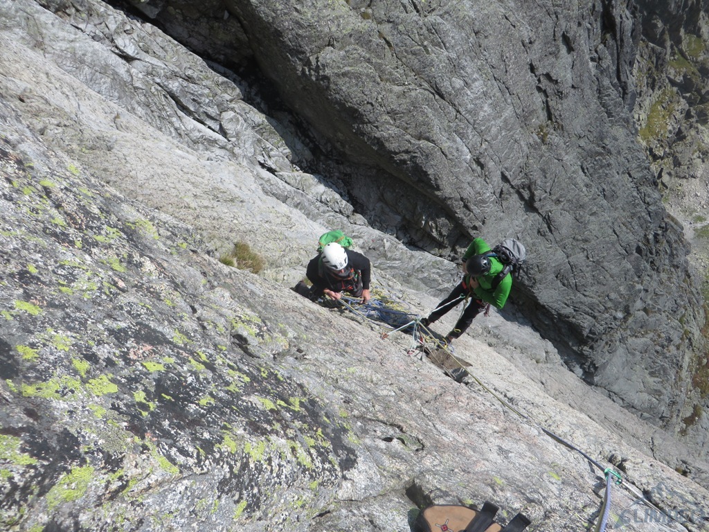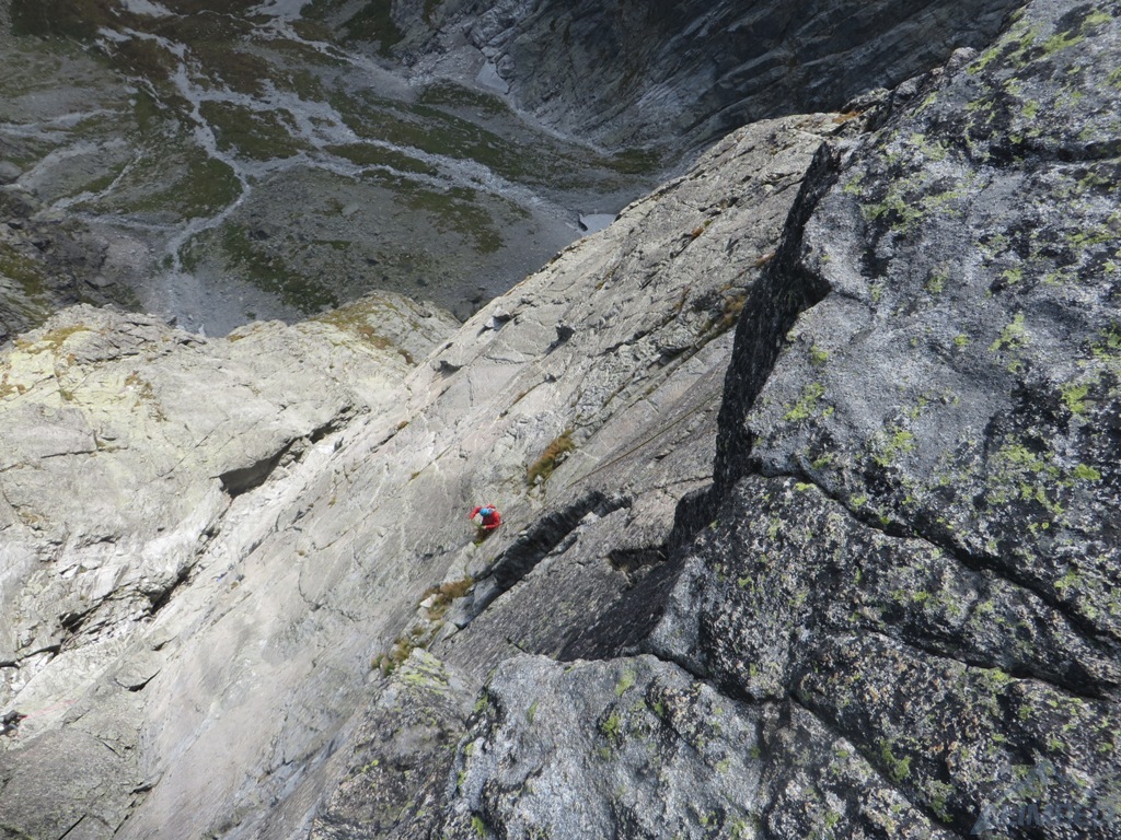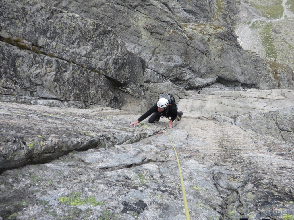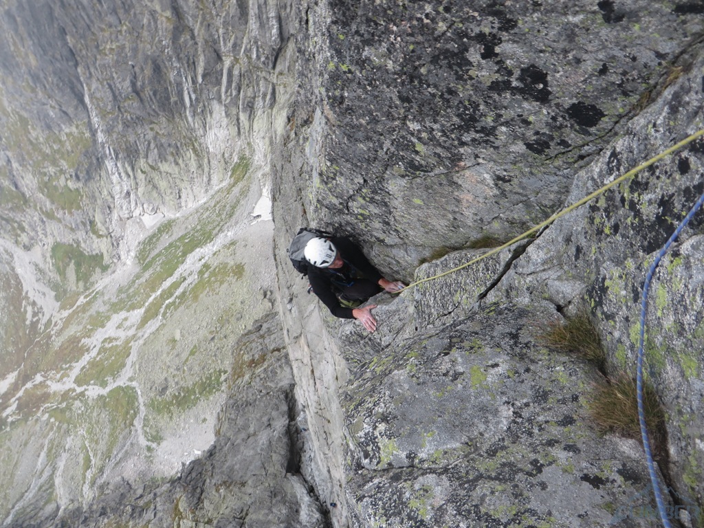 Ustalamy strategię działania, dzielimy wyciągi i ruszamy w Płyty Kriššáka. Ponieważ dwa pierwsze wyciągi w zeszłym roku prowadzili chłopaki, wszystko wskazuje bym robił je tym razem ja – szpeję się więc i ruszam. Pierwszy wyciąg to nieprzyjemny trawers nad wielkim okapem, asekuracja jest bardzo wymagająca ale rzeźba skały jest świetna, dlatego też szybko melduję się na stanie. Drugi odcinek to piękne płyty, niestety oszpecone niepotrzebnymi w niektórych miejscach spitami. Cieszę się jednak wspinaniem i po chwili wpinam się do kolejnego stanowiska. Teraz prowadzenie przejmuje Jacek, przechodzi imponującą płytę i groźnie wyglądający okapik (a to tylko IV+!) i dochodzi do szerokiej półki na wysokości stanowiska pod kluczowymi trudnościami niesamowitego Zacięcia Fiali, biegnącego kilkanaście metrów na prawo od nas (RELACJA z przejścia rok później). W międzyczasie nadchodzą ciemne chmury i przez chwilę mamy obawy, że powtórzy się sytuacja sprzed roku i zostaniemy przegonieni ze ściany bez skompletowania drogi - na szczęście pogoda „wytrzymuje”.