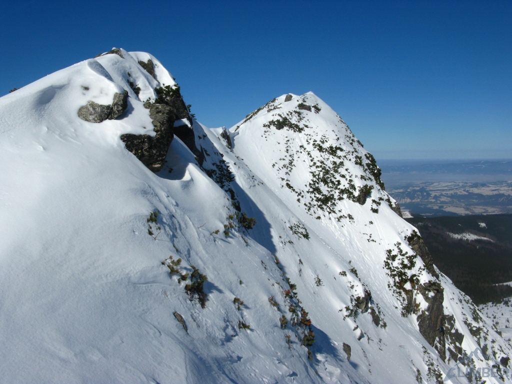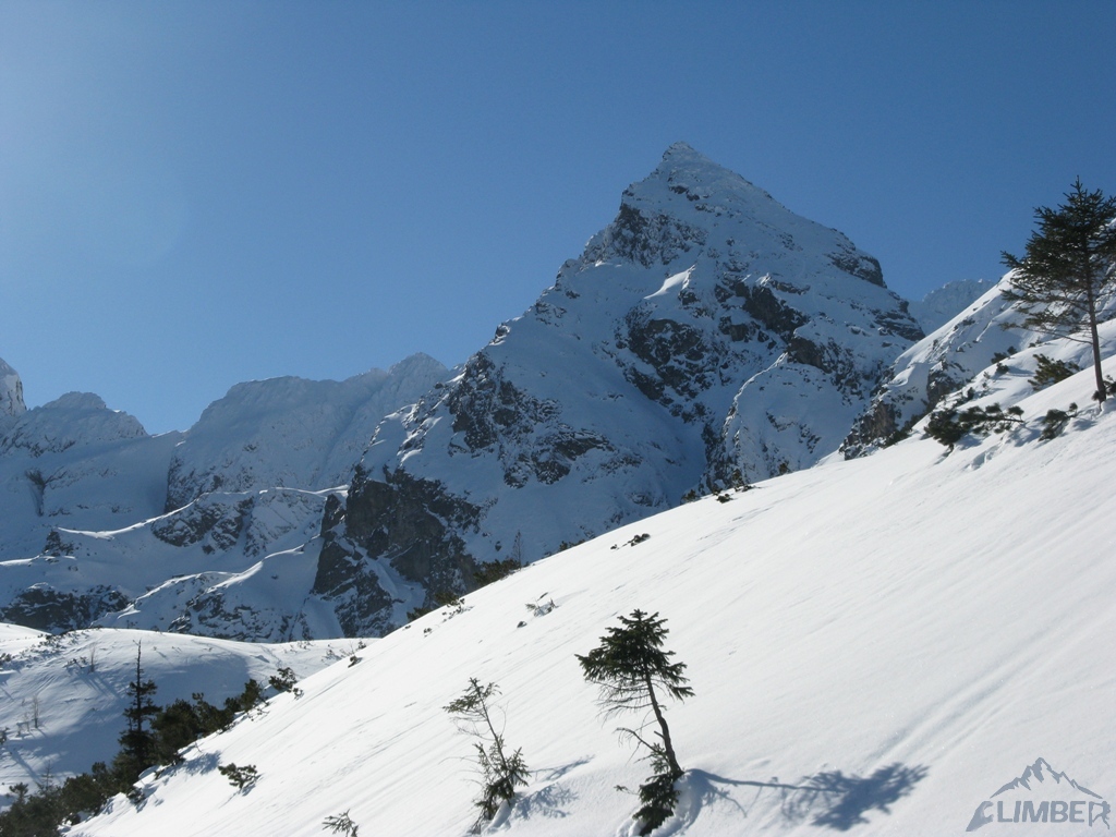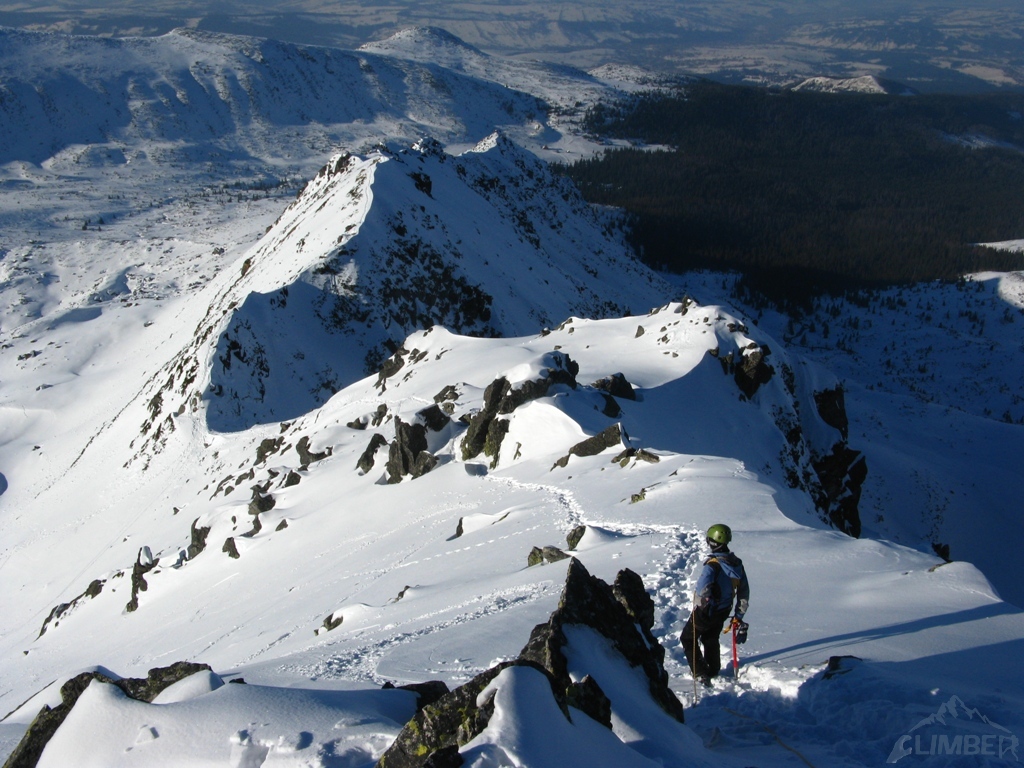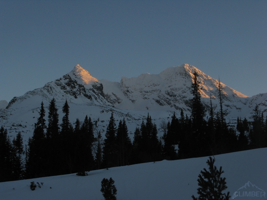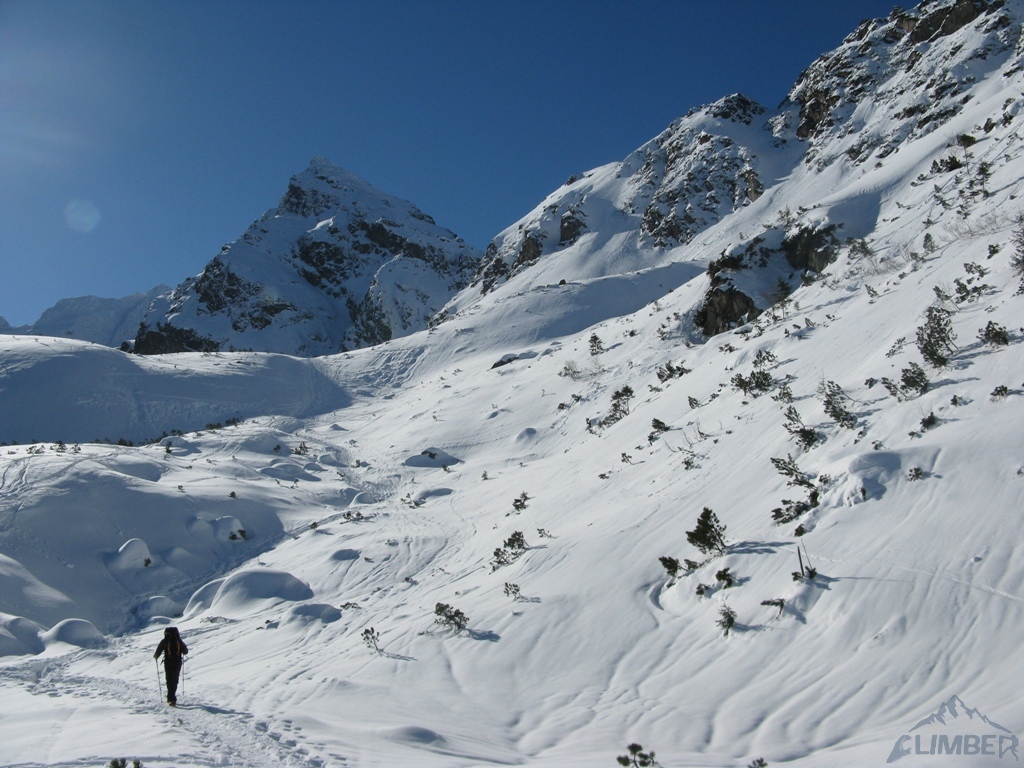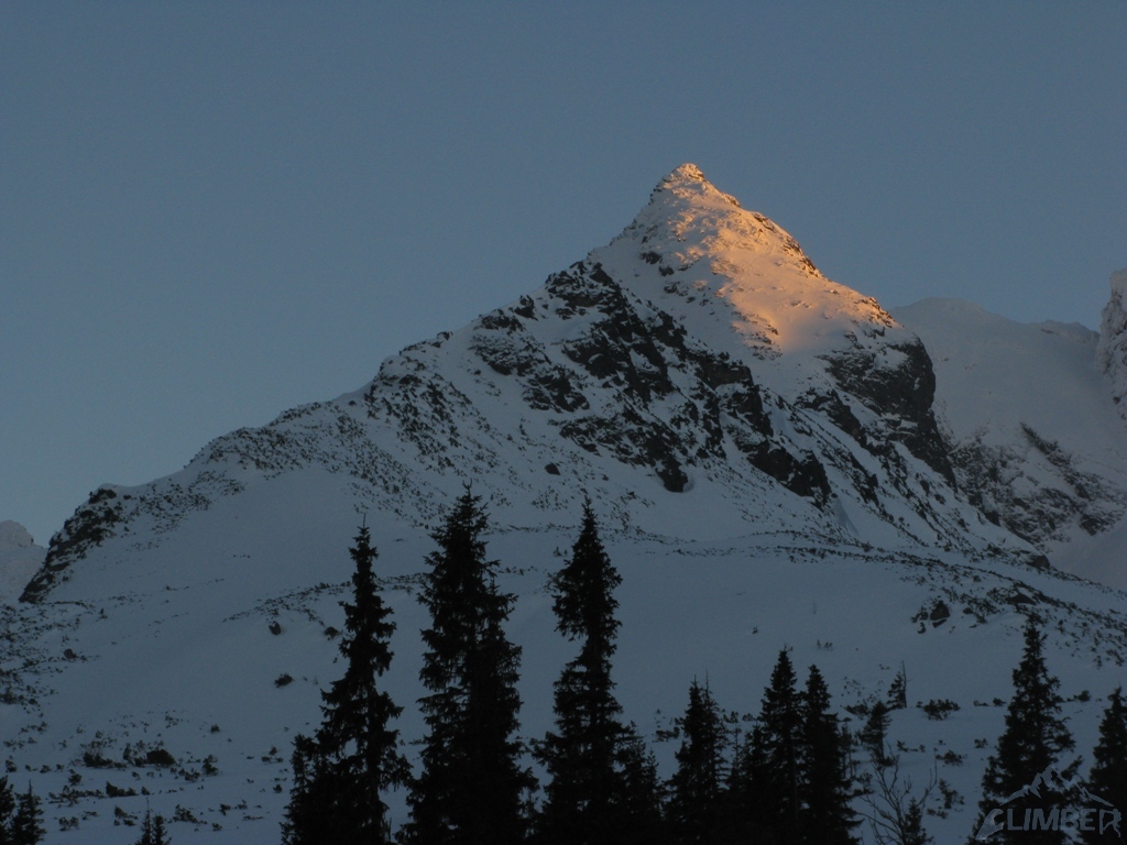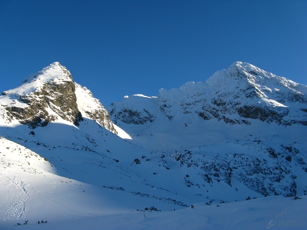 Weekend z Ulą na Hali. Pierwszego dnia wychodzimy na Kościelec, przy okazji trenujemy poruszanie się na lotnej, hamowanie czekanem i inne zagadnienia z kursu zimowej turystyki wysokogórskiej. Początkowo chcemy wyjść od strony Czarnego Stawu ale śniegu jest bardzo dużo, więc obchodzimy masyw i na przełęcz dostajemy się od drugiej strony.